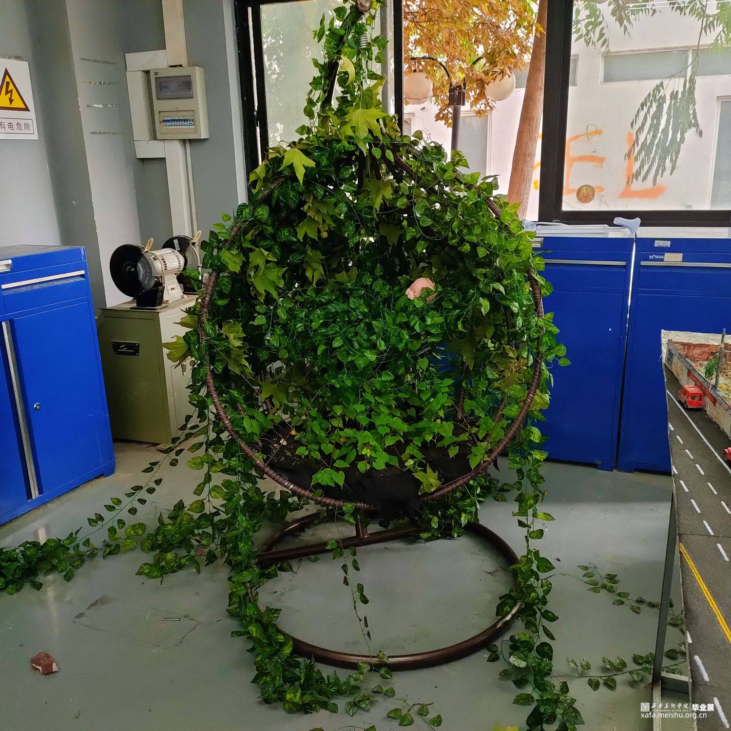 作品以汲取作为主题,将铁丝弯成胎儿的形状放进吊篮椅中,吊篮椅就是孕育生命的子宫,牵牛花作为爬藤植物,从吊篮椅的靠垫沙发里生长出来,顺着吊篮椅的结构攀爬生长,最后爬满整个胎儿。意味着植物的生长和胎儿的孕育需要从母体提取大量的营养。而爬藤植物扎根于靠垫中用来替换掉棉芯的土壤里,而胎儿在生长的过程中也会通过叶状绒毛膜,将血管像植物扎根一样扎进母体的子宫内汲取营养供给胎儿用于胎儿的生长发育。而人类女性怀孕到分娩的过程无疑是生物界最为痛苦的,尤其是胎盘脱落时的疼痛无异于将深深扎根于土壤的植物生生拔出。这是一个用形象