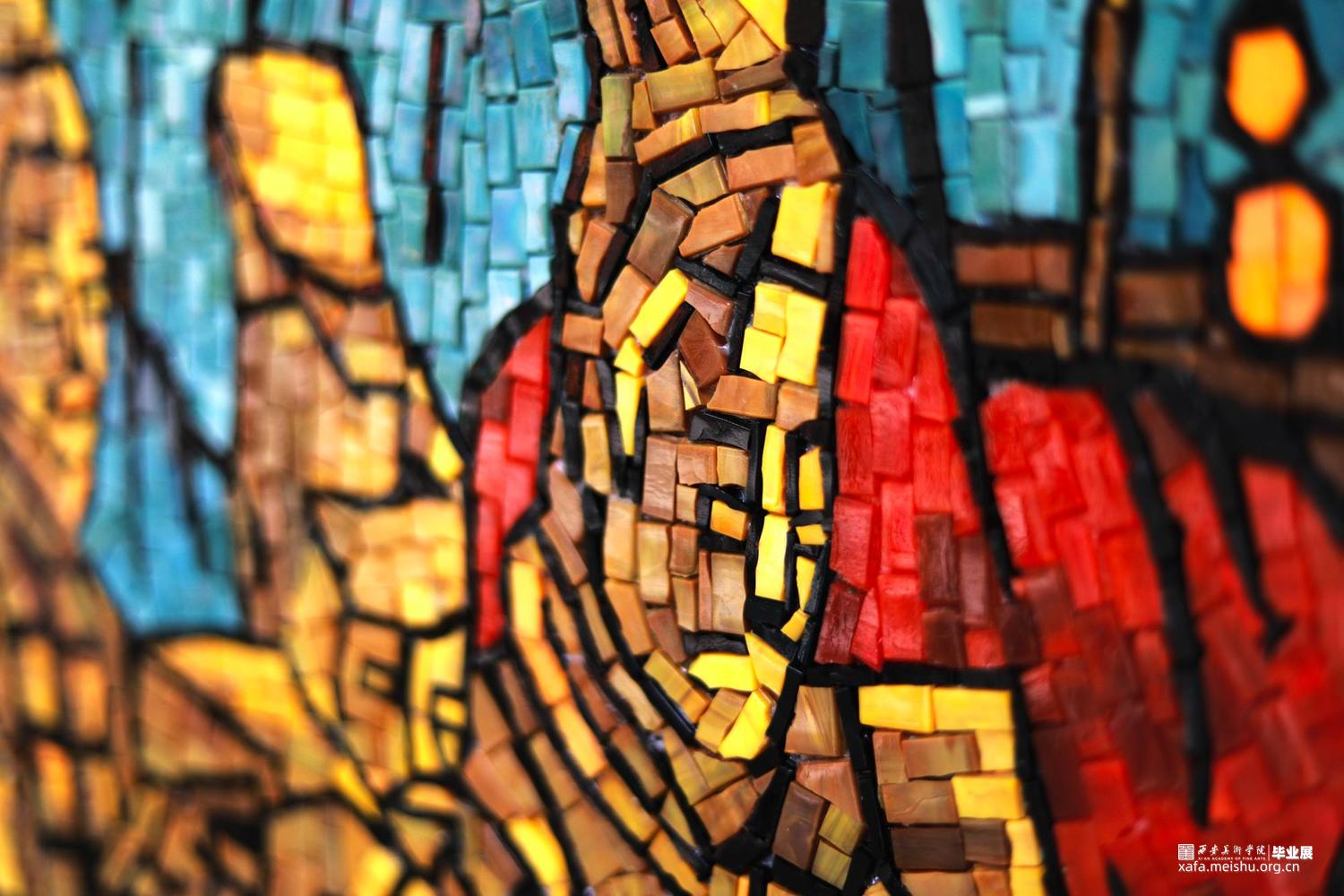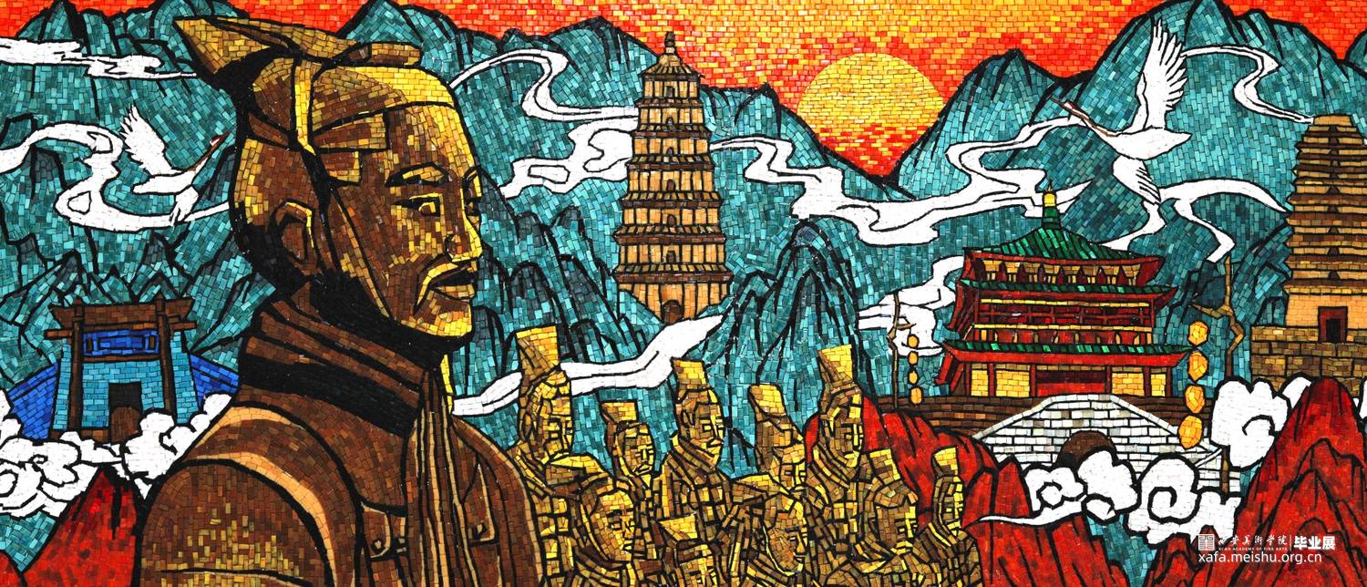 世界上有七大奇迹,秦兵马俑的发现,完全可以算得上是第八大奇迹!不看金字塔不算到埃及,而不看秦兵马俑就不算到过中国。作品以兵马俑为主题,选取西安文化历史中的元素,诸如:秦始皇兵马俑、永宁门、大雁塔、小雁塔、钟楼、华山、旭日东升、飞翔的场景等画面勾勒出了具有西安历史文化特色的马赛克室内装饰作品。