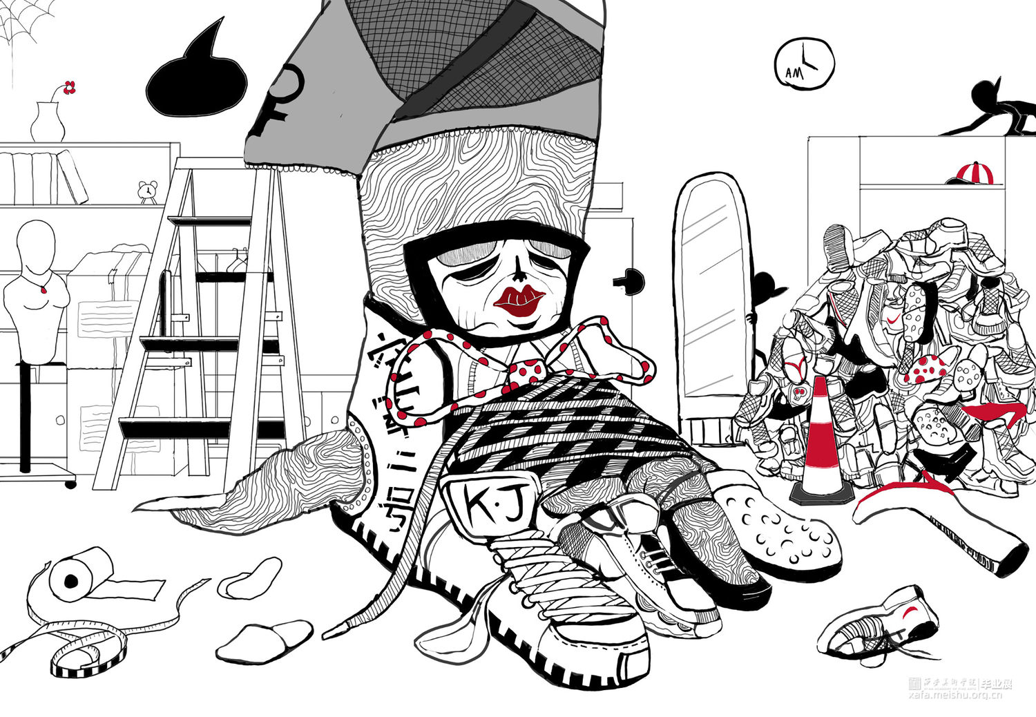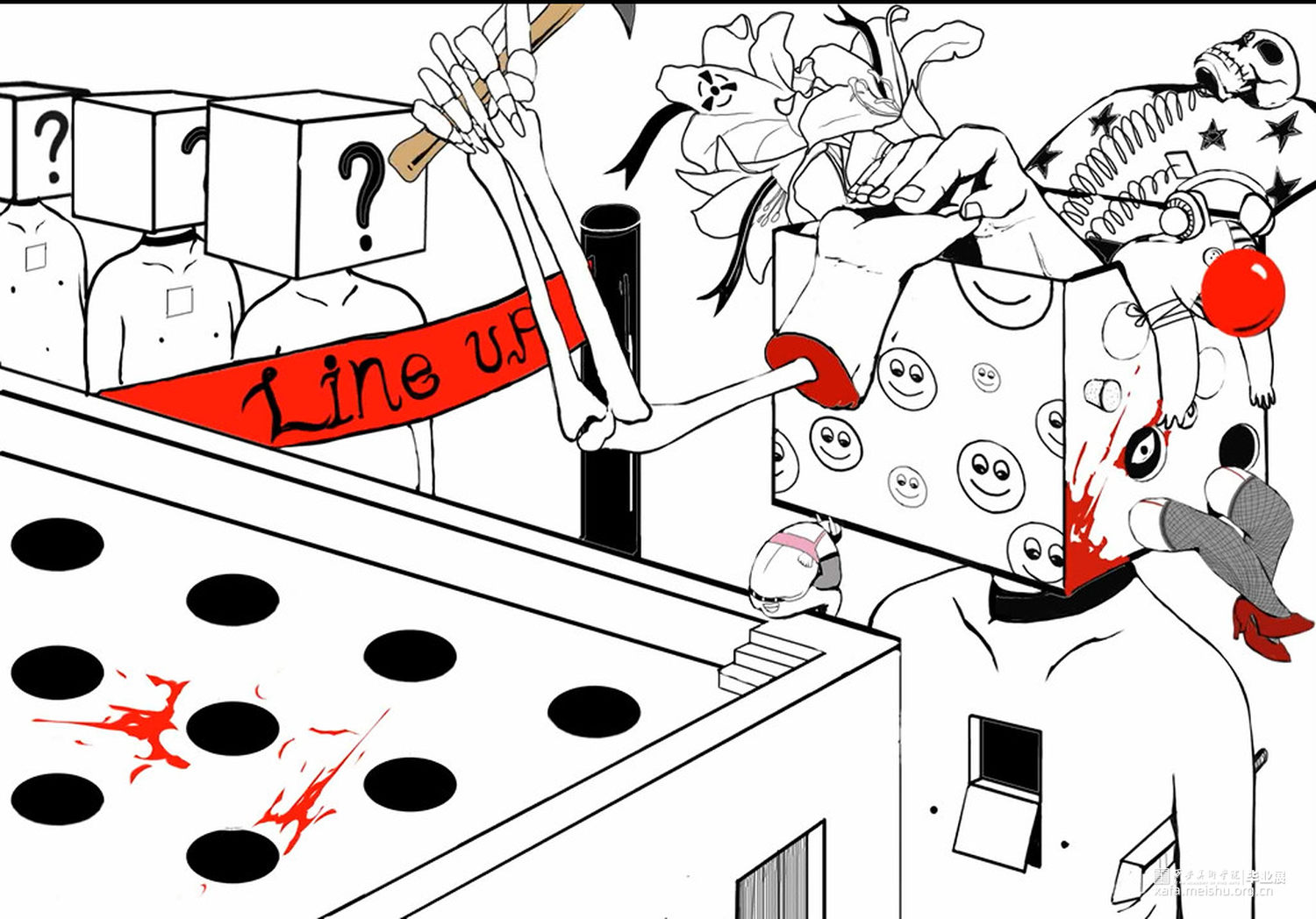 插画的主角设定为一名患有罕见心理疾病的肥宅,现实里,他在人们眼中是个毫不起眼,浑浑噩噩的油腻肥宅,本作插画我们以它的视角来锁定他生活中的不同镜头,这个视角下所呈现的同时也是另一个平行世界里的它 : 一个无法用正常语言形容的怪咖。我们可以从插画中透露出一些关于主角的细节,他的思想,言语,行为,深刻感染了他所触及的事物和人,其所到之处便会出现奇怪的影子,粘稠的触手,另人战栗的突刺,无处不在的鲜血及裂痕......在那里,他就是自封的冠冕堂皇的救世主,任何存在于我们世界的物质,在他的世界必将变得怪异疯狂,直到黑