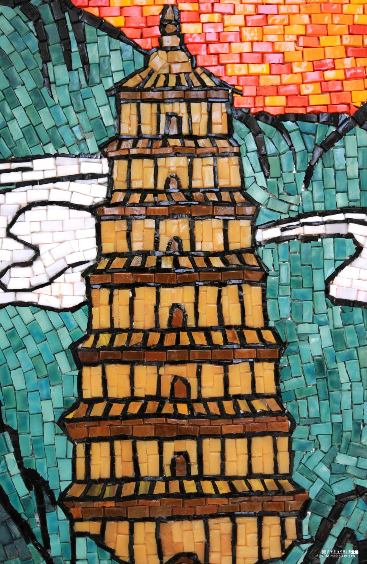 世界上有七大奇迹,秦兵马俑的发现,完全可以算得上是第八大奇迹!不看金字塔不算到埃及,而不看秦兵马俑就不算到过中国。作品以兵马俑为主题,选取西安文化历史中的元素,诸如:秦始皇兵马俑、永宁门、大雁塔、小雁塔、钟楼、华山、旭日东升、飞翔的场景等画面勾勒出了具有西安历史文化特色的马赛克室内装饰作品。