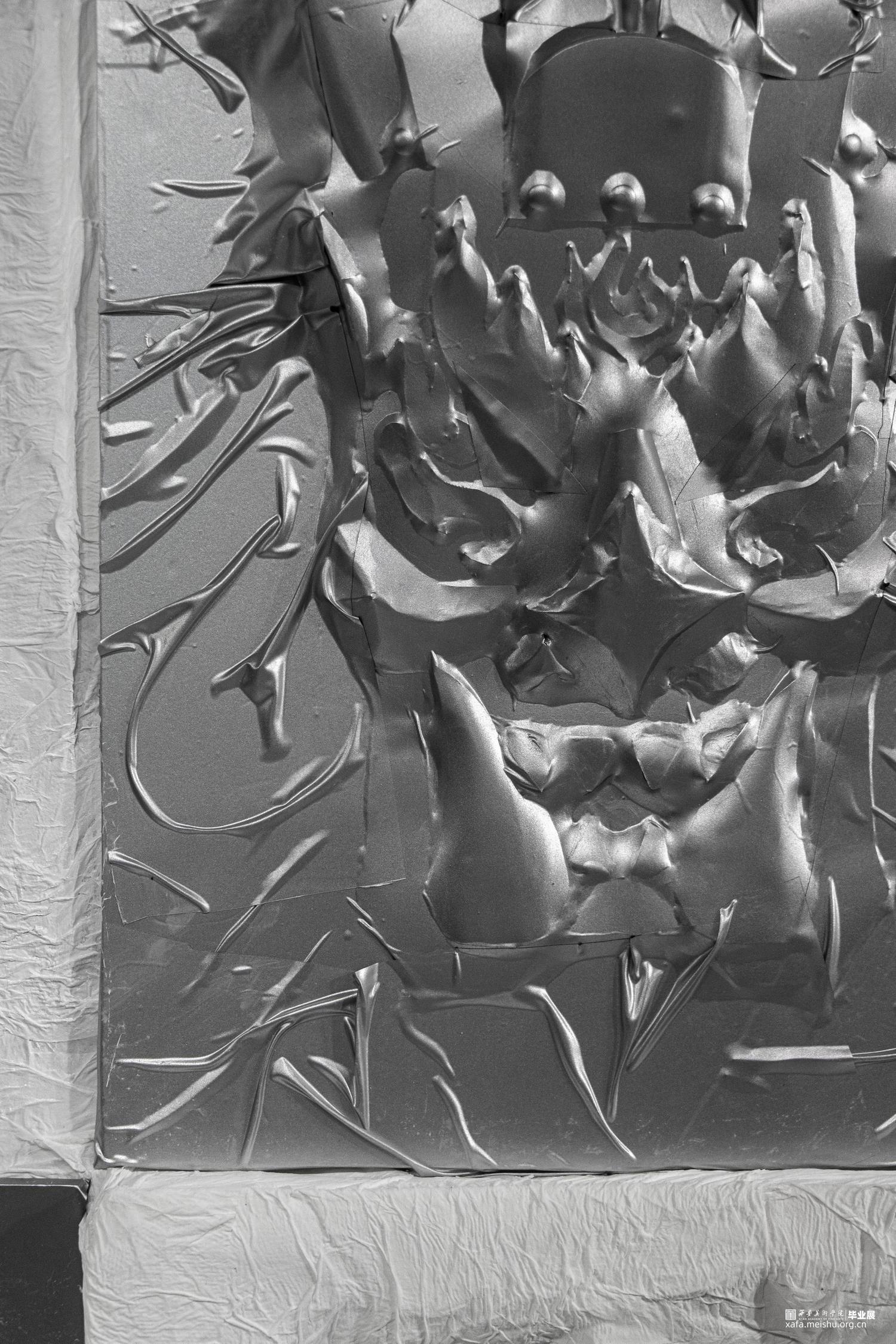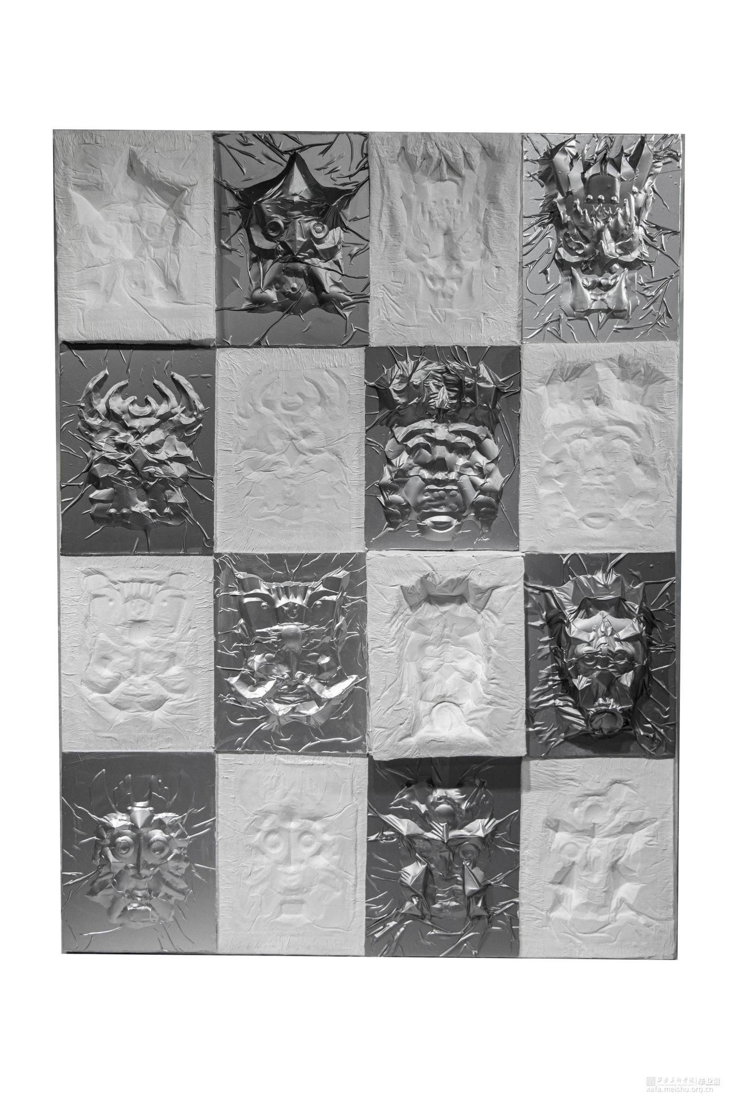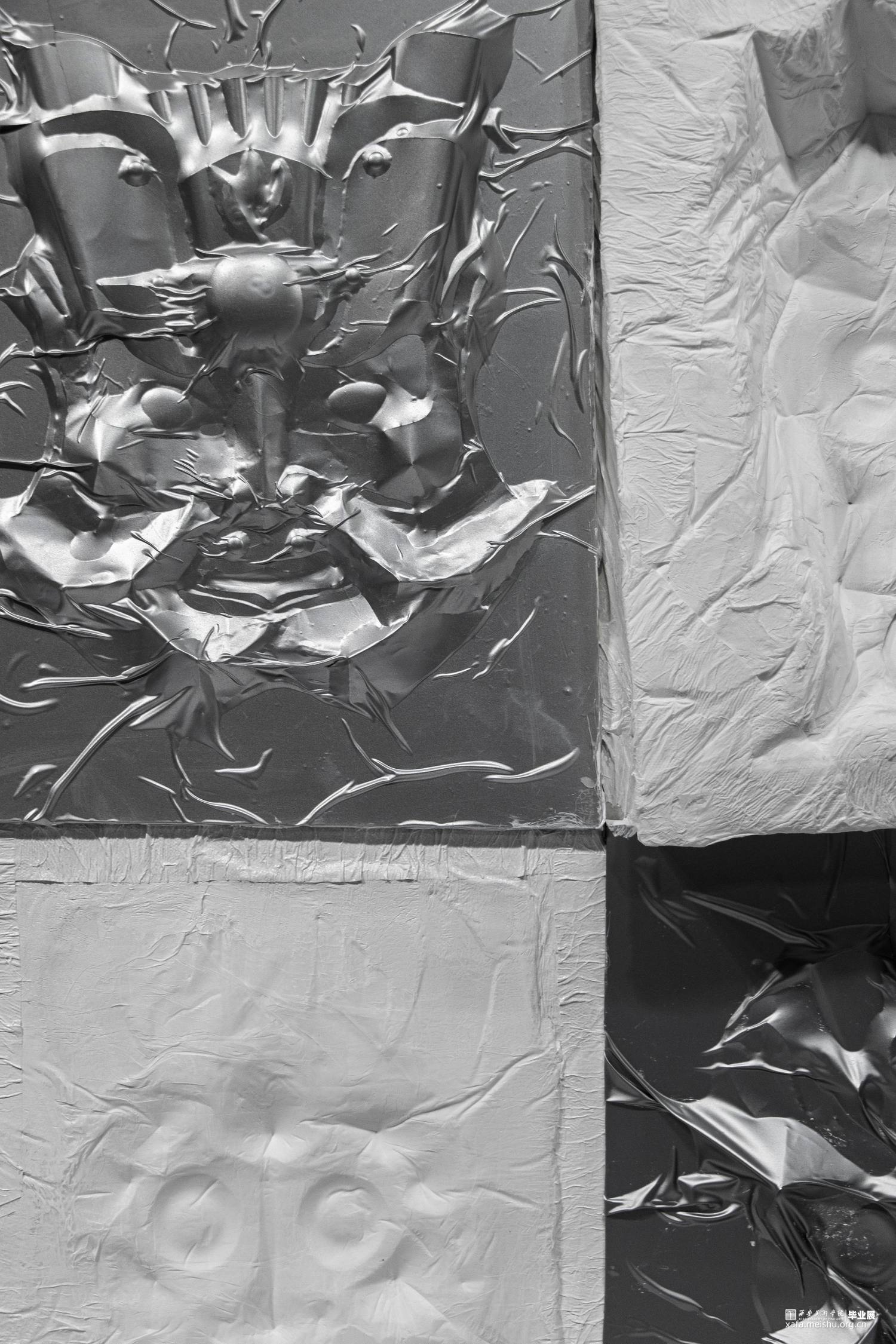 本作品旨在通过易拉罐铝皮,纸巾等材料,利用折纸包装平面图的方法,将细节折出来或裁剪出来再拼接,最后用纸覆于之上脱膜,再将两者结合。体现傩面“神鬼”的一面,表达傩面本身造型所体现的情感。