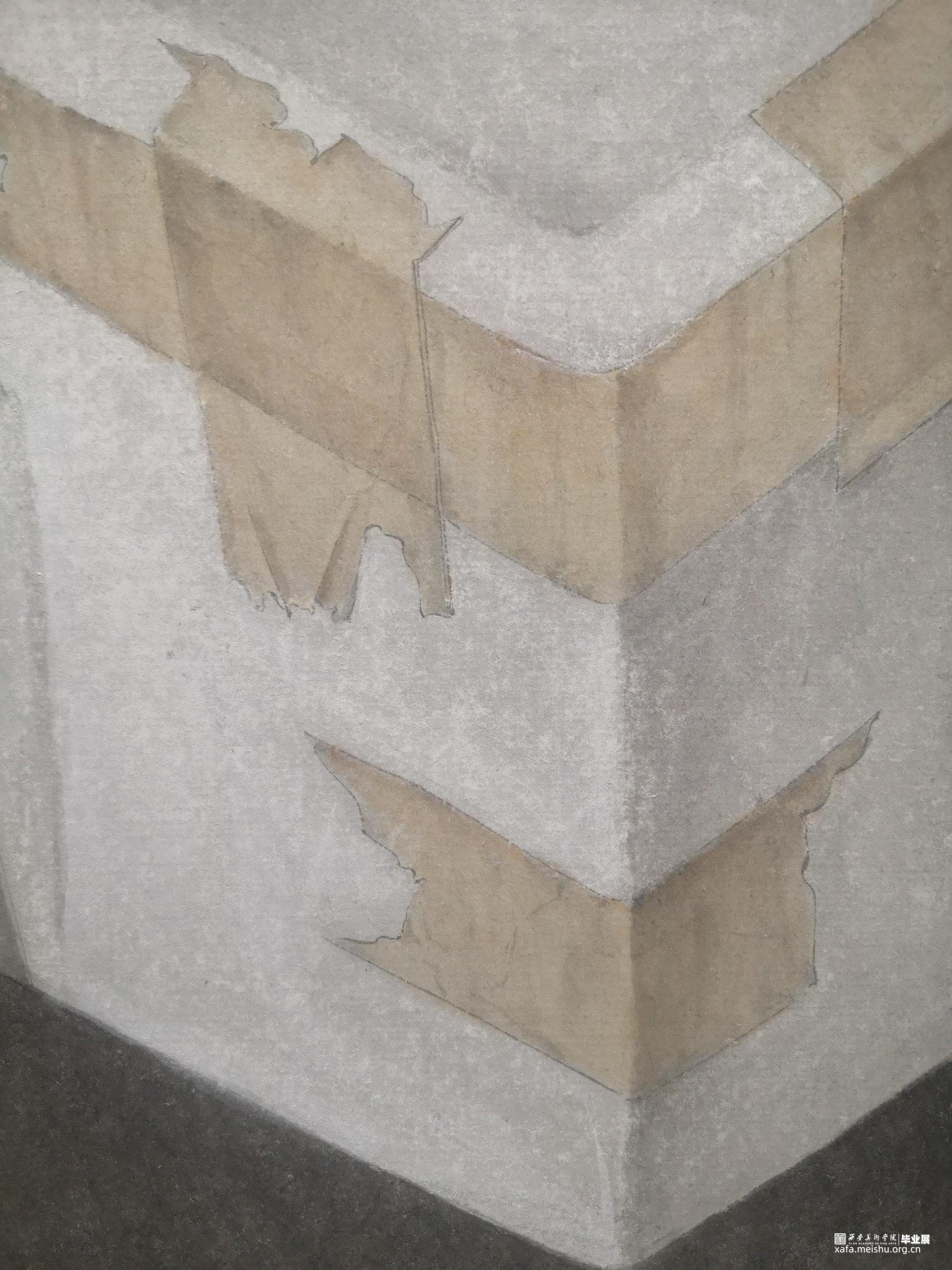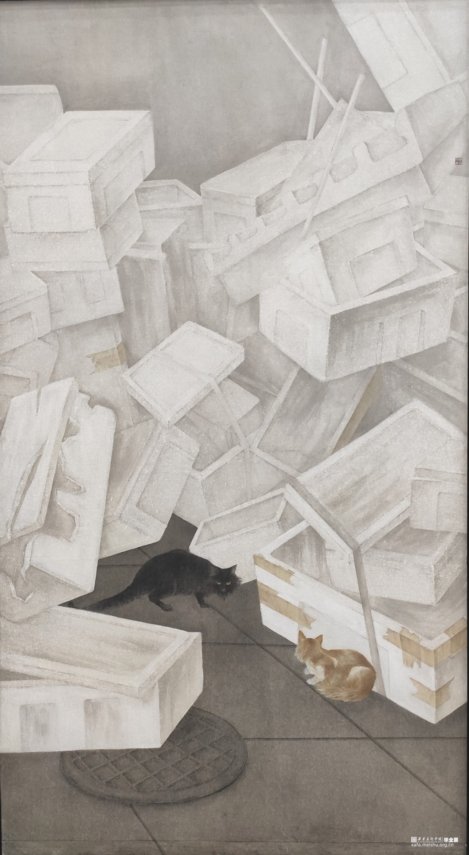 本次创作《泡沫》选择泡沫箱和猫为主要表现物象,以矛盾为画面支撑,以泡沫箱的棱角分明,锋芒毕露和猫的圆润温顺形成对比,以人文产物所占篇幅之多和自然生灵所占画面所占比例之少形成对比,以泡沫箱的随意堆放并且充满张力随时继续侵占画面和猫警惕不安以及随时准备逃离形成鲜明对比。希望可以带给观者一个第三视角,去思考其他生灵如何在人类的规矩下生存。