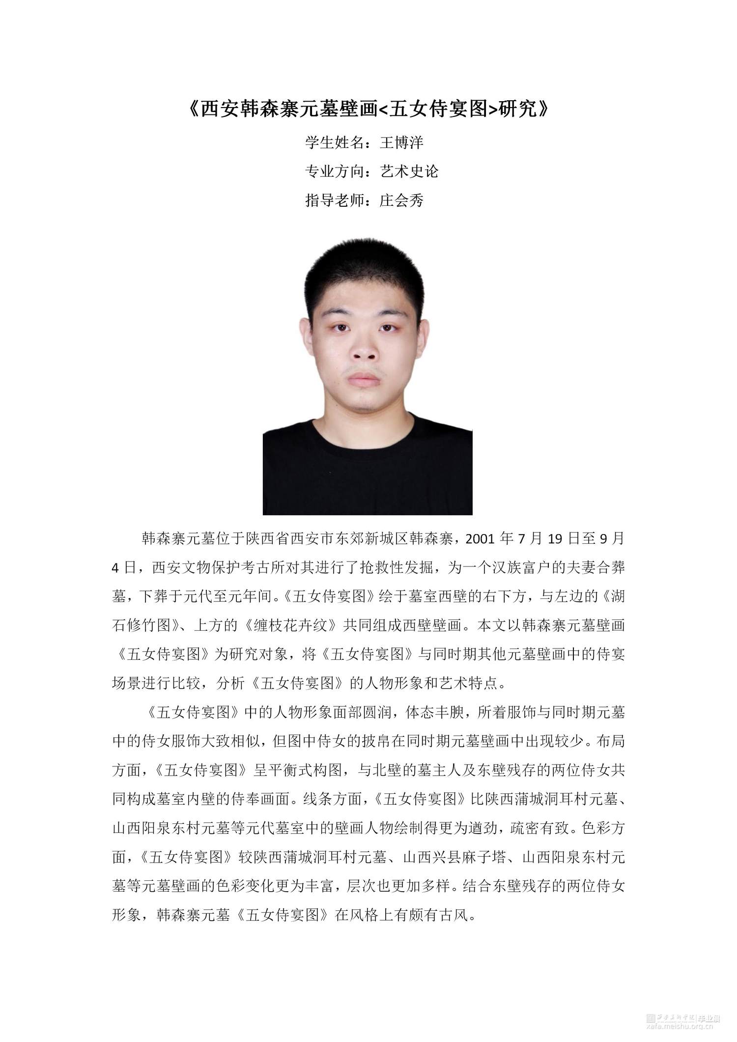 韩森寨元墓位于陕西省西安市东郊新城区韩森寨,2001年7月19日至9月4日,西安文物保护考古所对其进行了抢救性发掘,为一个汉族富户的夫妻合葬墓,下葬于元代至元年间。《五女侍宴图》绘于墓室西壁的右下方,与左边的《湖石修竹图》、上方的《缠枝花卉纹》共同组成西壁壁画。本文以韩森寨元墓壁画《五女侍宴图》为研究对象,将《五女侍宴图》与同时期其他元墓壁画中的侍宴场景进行比较,分析《五女侍宴图》的人物形象和艺术特点。