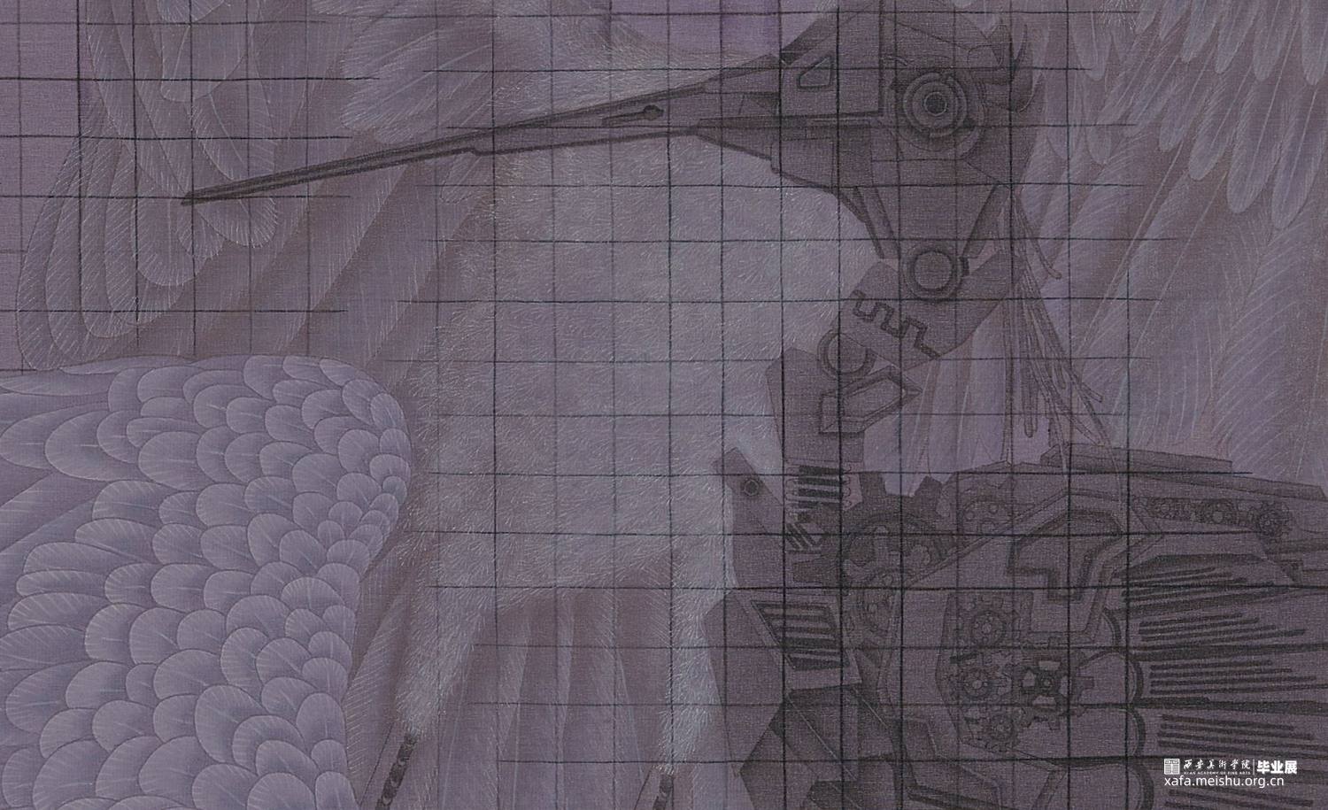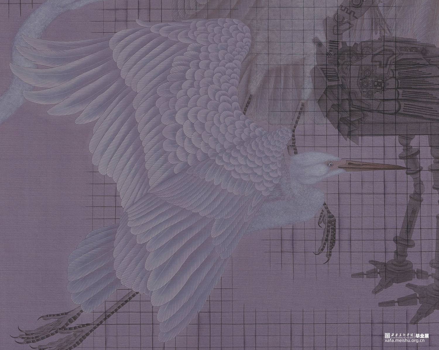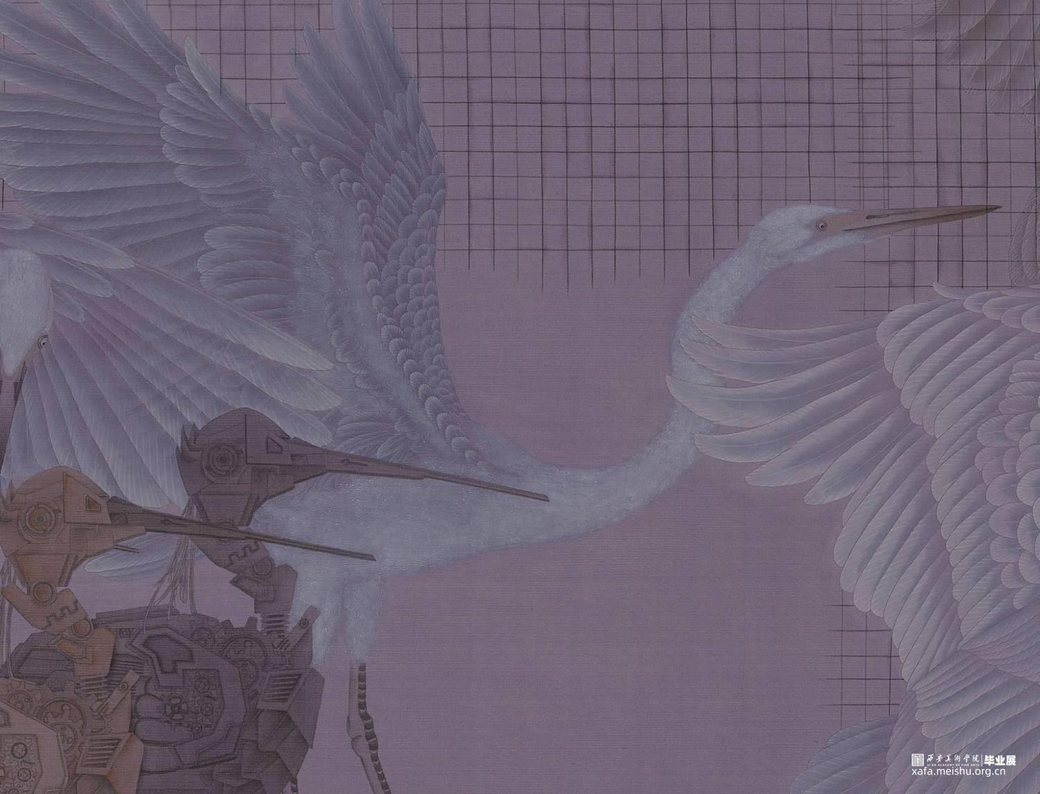 《羽·翼》作品创作构思来源于我对现下的观察和对未来的思考。人工智能的快速发展,将来当机器人也拥有智慧和情感的那一天,机器人和自然是否可以和人与自然一样和睦共处。我力求以第三者的视角理性的去分析和看待机器人与自然的关系,所以《羽·翼》作品创作选择了,对生态变化较为敏感的鸟类作为画面的素材,运用工笔的语言从勾线造型再到意境营造,力图把机器鸟和自然界的鸟同置于一个冷漠的数字虚拟空间当中,作品画面中生动的鹭鸶与冰冷的机器鸟呈现了鲜明的对比,它们在未来同作为这蔚蓝星球的邻居,是否可以友好相处?是否可以共同翱翔于天际
