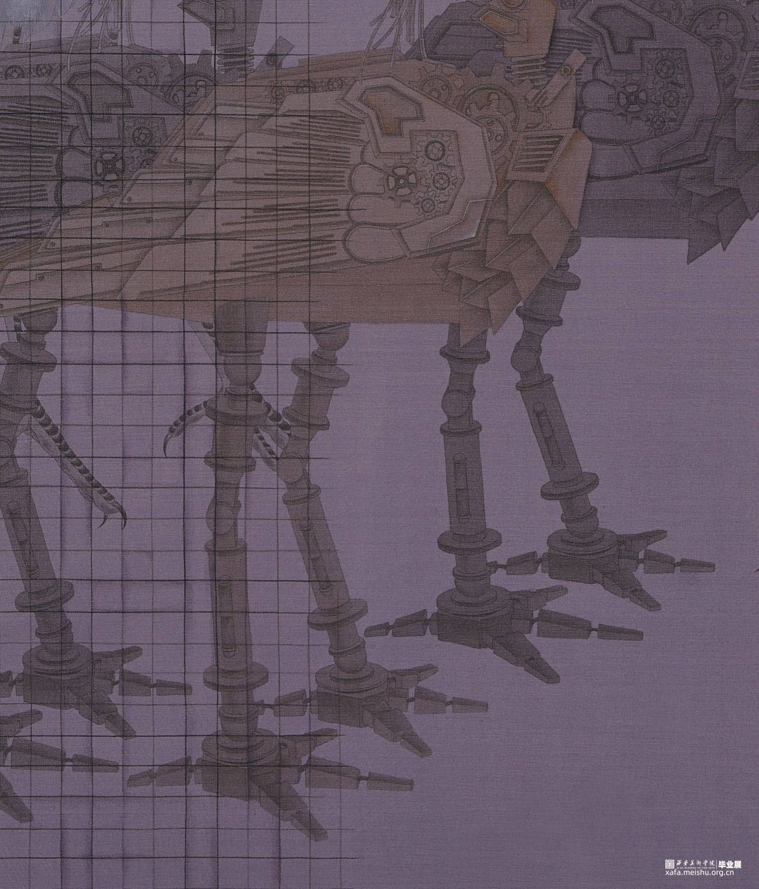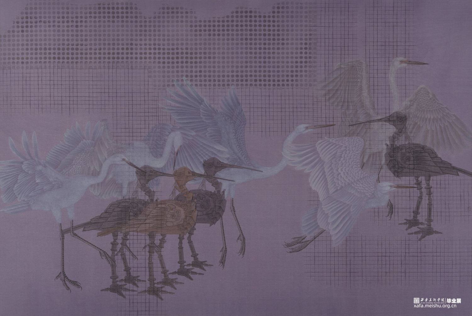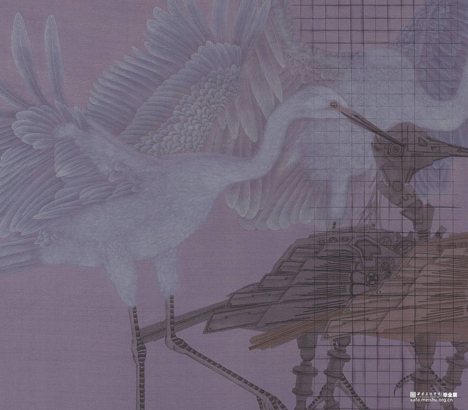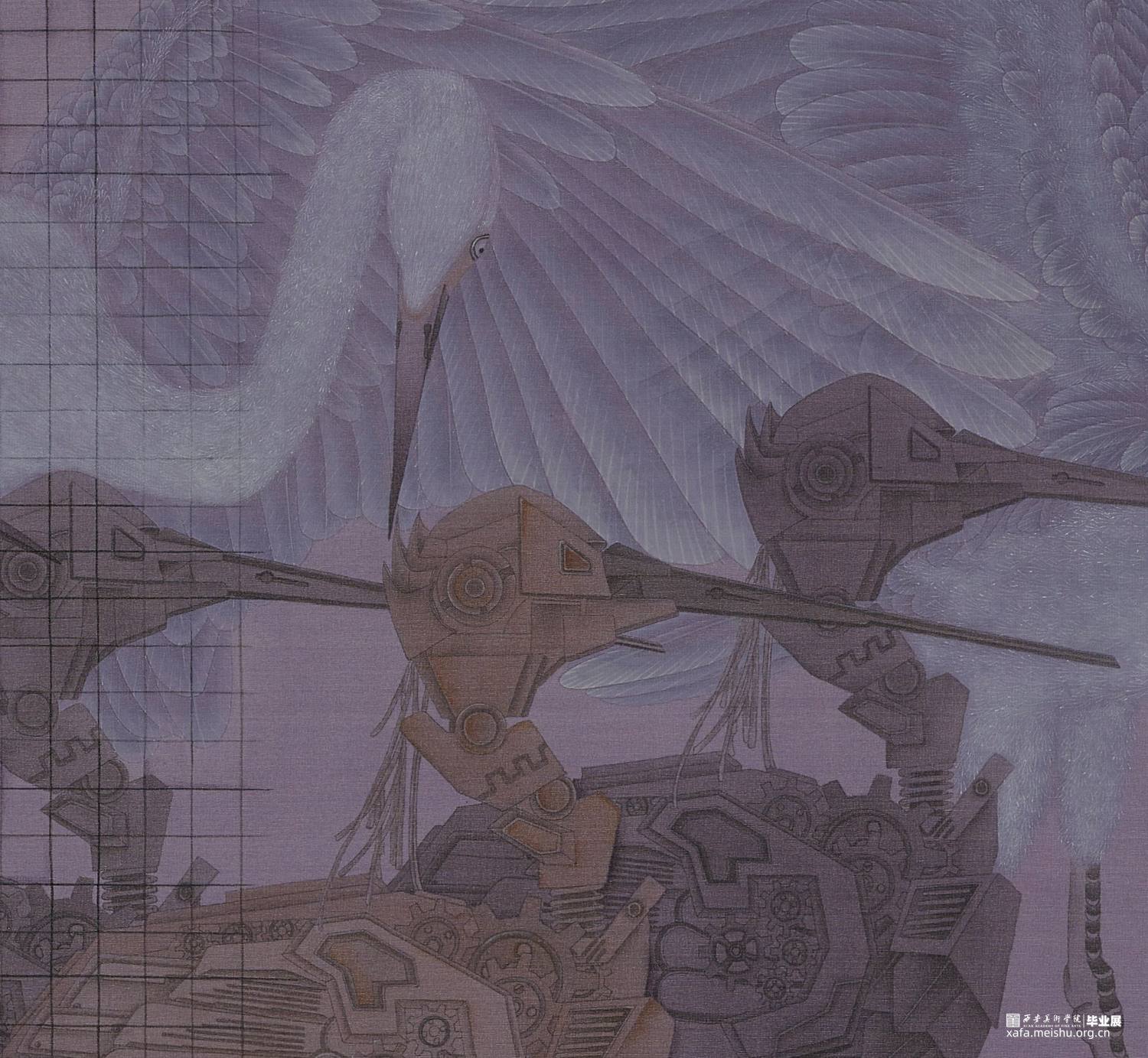 《羽·翼》作品创作构思来源于我对现下的观察和对未来的思考。人工智能的快速发展,将来当机器人也拥有智慧和情感的那一天,机器人和自然是否可以和人与自然一样和睦共处。我力求以第三者的视角理性的去分析和看待机器人与自然的关系,所以《羽·翼》作品创作选择了,对生态变化较为敏感的鸟类作为画面的素材,运用工笔的语言从勾线造型再到意境营造,力图把机器鸟和自然界的鸟同置于一个冷漠的数字虚拟空间当中,作品画面中生动的鹭鸶与冰冷的机器鸟呈现了鲜明的对比,它们在未来同作为这蔚蓝星球的邻居,是否可以友好相处?是否可以共同翱翔于天际