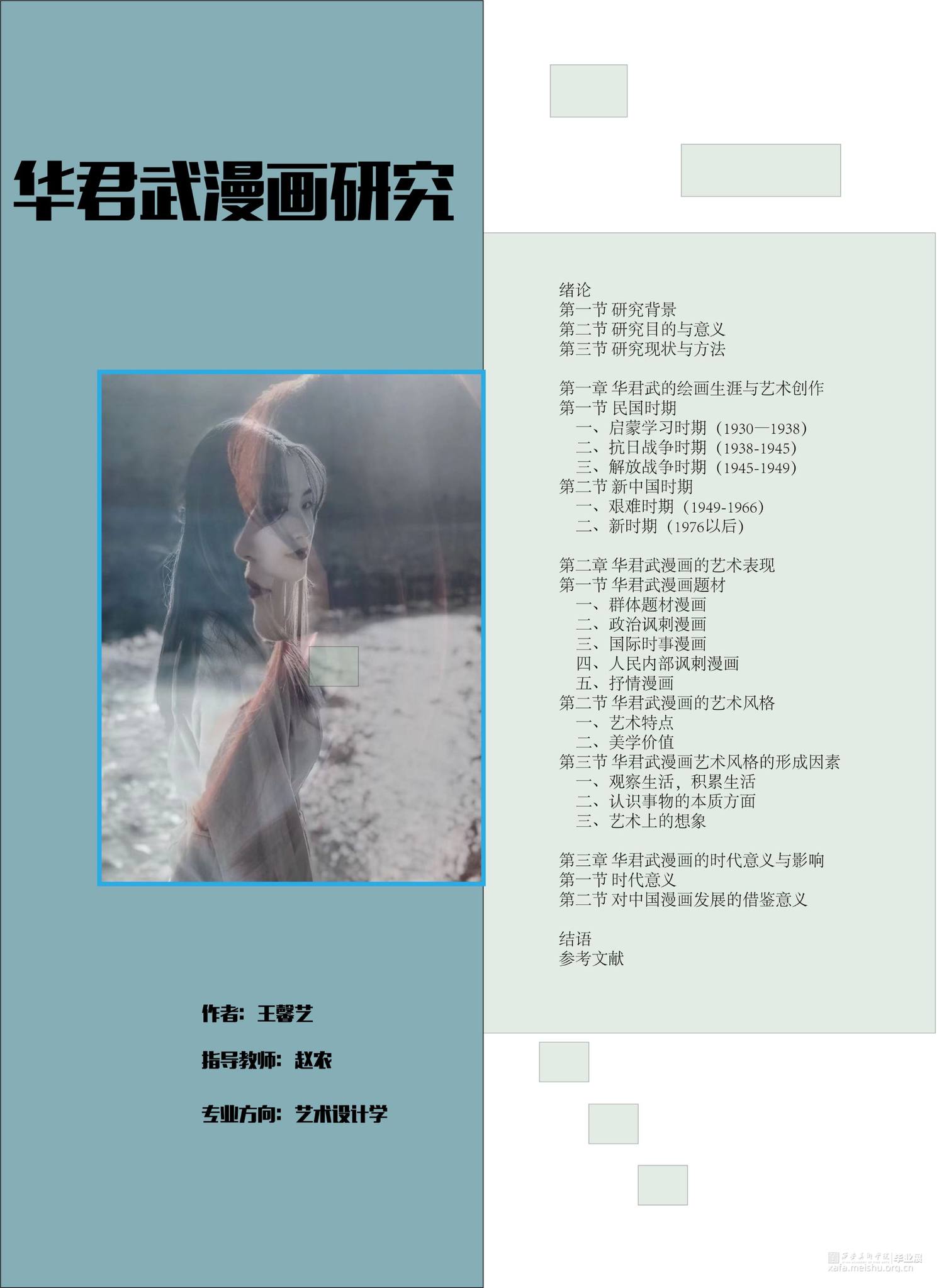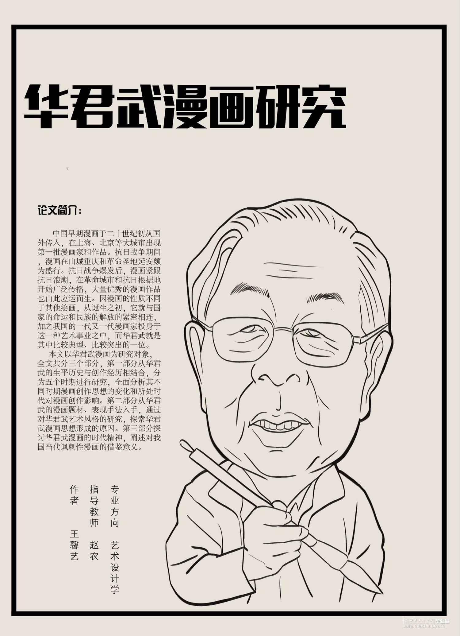 本文耗时四个月,最终以18500字结束。目前有关华君武及其漫画创作的文献资料,主要集中于华君武本人的生平事迹和艺术思想上进行研究。目前有丰富的文献资料研究华君武漫画,但大多情感大于理论,文学性比较强,因此很多资料得出的结论就缺乏美术理论的支撑。而本文主要从美术学角度出发,但不同的文献资料都有着不同的研究角度。本文对研究华君武主要分为三个方面,第一是对华君武人生经历的研究,第二是对华君武漫画及漫画创作思想的研究,第三就是对华君武漫画艺术风格的研究。