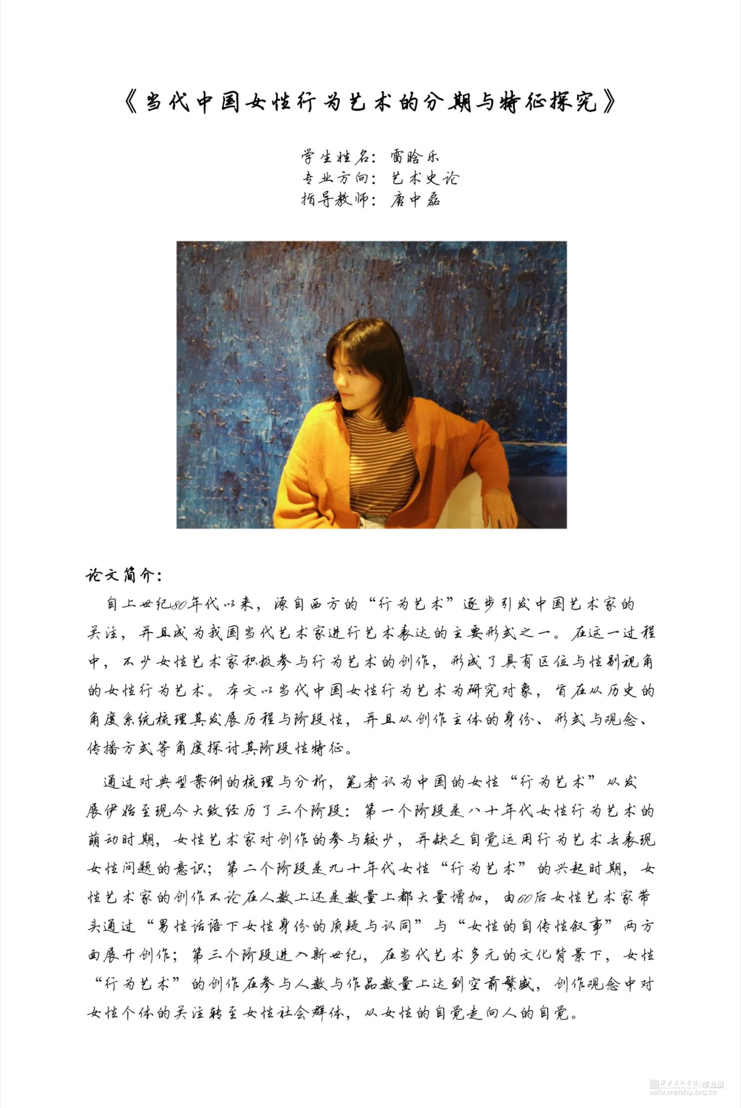 题 目:当代中国女性行为艺术的分期与特征探究作 者:雷晗乐指导老师:唐中磊摘 要:中国当代女性行为艺术的首次发生在上世纪八十年代末的现代美术展之上,自此之后的女性行为艺术发展至今日大致形成三个阶段,各阶段具有不同的背景、观念与特征。中国当代的女性主义艺术立足于当代舞台,其表现形式是多元且丰富的,因此对行为艺术这一表现形式的选择可以说是受艺术整体环境的影响,但同时也是女艺术家们立足于女性主义艺术自身所做...