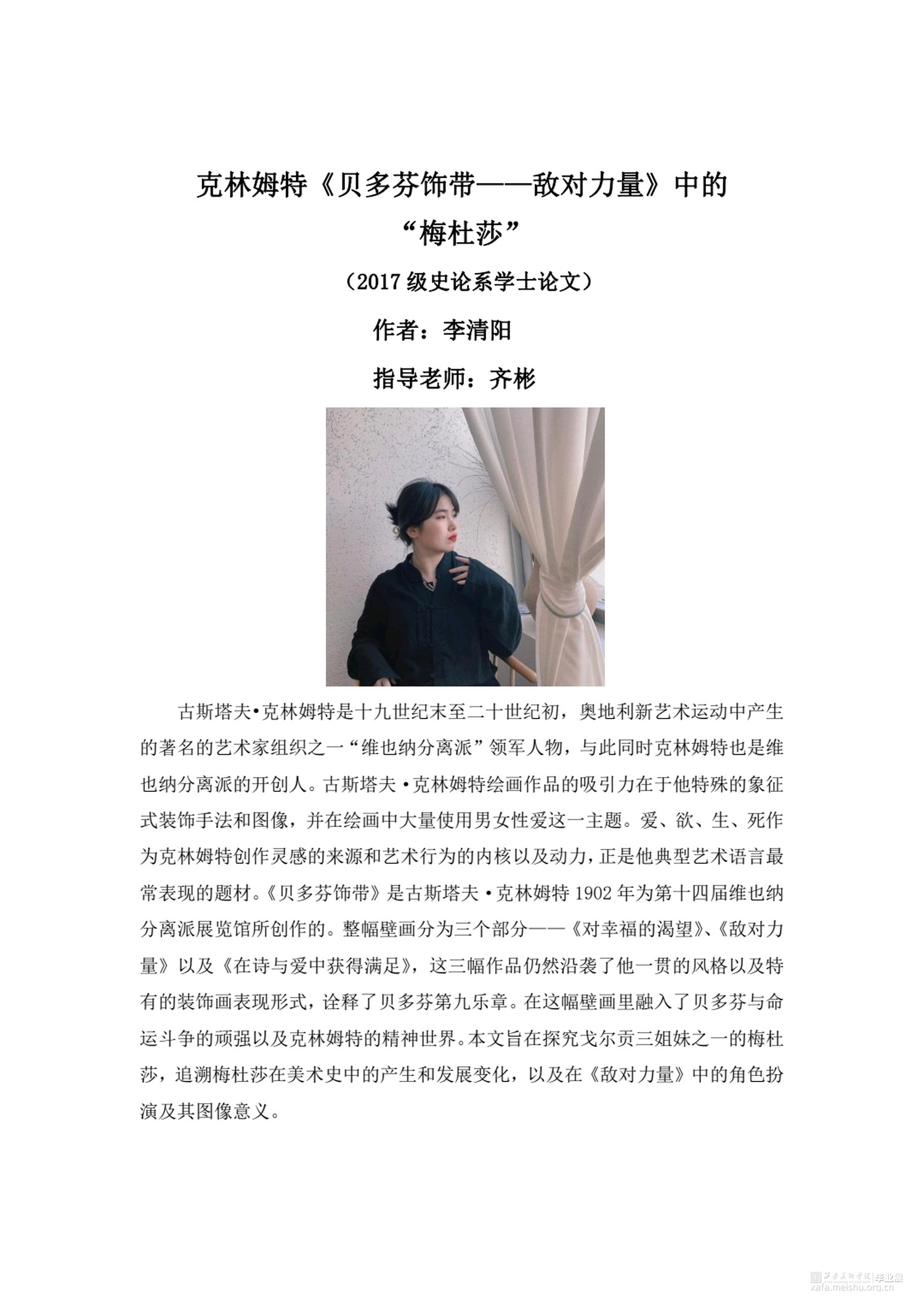 古斯塔夫•克林姆特是十九世纪末至二十世纪初,奥地利新艺术运动中产生的著名的艺术家组织之一“维也纳分离派”领军人物,与此同时克林姆特也是维也纳分离派的开创人。古斯塔夫·克林姆特绘画作品的吸引力在于他特殊的象征式装饰手法和图像,并在绘画中大量使用男女性爱这一主题。爱、欲、生、死作为克林姆特创作灵感的来源和艺术行为的内核以及动力,正是他典型艺术语言最常表现的题材。《贝多芬饰带》是古斯塔夫·克林姆特1902年为第十四届维也纳分离派展览馆所创作的。整幅壁画分为三个部分——《对幸福的渴望》、《敌对力量》以及《在诗与爱中获得满足》,这三幅作品仍然沿袭了他一贯的风格以及特有的装饰画表现形式,诠释了贝多芬第九乐章。在这幅壁画里融入了贝多芬与命运斗争的顽强以及克林姆特的精神世界。本文旨在探究戈尔贡三姐妹之一的梅杜莎,追溯梅杜莎在美术史中的产生和发展变化,以及在《敌对力量》中的角色扮演及其图像意义。