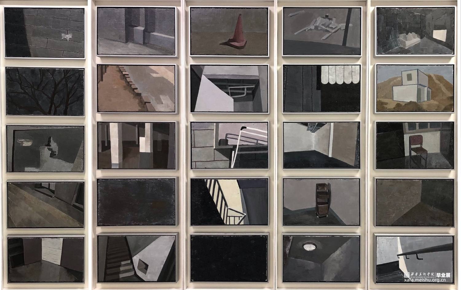 生活,充斥着片片清晰或模糊的记忆,混杂着怅然若失,挥之不去的淡淡回忆。时光如水,岁月无痕,随着网络技术的飞速进步,生活被划分成了方方面面的碎片,更多时候我们只能匆匆而来,然后匆匆而过。在我的童年记忆里,是一直辗转反侧的,不停的搬家搬家,换了一个又一个环境,有在城市,有在农村,不安的内心一直保存到了现在,现在重回故地,已然没有当年的人头攒动、车水马龙,目前状态是一堆碎片砖瓦、一片废墟,或是有的地方已经变成了超级商场、贸易区。现在,我带着新的视角记录居住地的变迁,试图重拾记忆,关注点放在以前从未关注过的小犄角旮旯,并且遵从构成原则,记录下不为人知的地方。其实是这样的,对于我来说,碎片化记忆是我再回到过去生活中找寻不曾发现过的蛛丝马迹并且通过图像记录下来。以往的各种书籍或者图画册带给我们的都是完整连续的故事,而现在我想探寻一种新的视角或是观察的方式。以往我们走过一条街巷,可能记住的是路边哪家小吃摊或者什么游戏厅、玩具店,而此刻,我用了一个月的时间搜寻童年的每一片地方,仔细观察所有常人不会注意到的地方, 我所选择的图像,更多的是当我看到这个地方,会让我头脑一震,似乎是没有色彩的图像,我所拍摄图像背后的力量才是吸引我的地方,我拍摄的题材是市井气息?亦或是小巷?又或是残砖瓦砾?其实我给自己所定义的,是没有分别的,其实并没有明确的拍摄主题,我痴迷于走在那条街上,并不知道转角会出现什么,然而当你发现一些东西时的那种畅快淋漓或者舒适感才是最迷人的,正是如此,才会让我有无尽的灵感和创作表达的欲望,可以说,这是对这片土地的独特理解,带着老旧的童年的记忆而去搜寻现当下的生活印象。我经过小稿实验,发现传统的绘画方式并不能满足我的表达欲,细腻入微的软磨硬泡式的绘画方式我并不倾向,对于童年的记忆碎片,我并不能细腻的描绘每一个细节,于是我采取刮刀绘画的方式,大刀阔斧的劈开细节,对于刮刀这个绘画工具的选择,让我主动的放弃掉了细节,从而可以追寻一种简单质朴的方式,此简单并非传统意义上的简单,而可以这么理解,这是一种大智若愚的感觉:简化景物的构成,在仅有的几块构成中搜寻彼此的关系,忽视画面中细致入微的细节,描绘大的画面构成感觉,这正呼应了童年碎片化的记忆,那是不明确的一种记忆,它就真实的存在,可我又不是那么熟悉,将童年回忆真实质朴的情感注入画面,不断的打磨作品,一遍遍用刮刀“雕刻”淳朴的印记,每一遍都有不同的体会和感受,并且利用刮刀这一绘画工具的特性,制作出这一绘画工具特有的笔触与肌理,画面有薄有厚,虽然色彩比较单一,但可以明显的感觉到一种朴实感,当然需要不断的绘制,在旧的画面上进行新的覆盖,这是对作品的深入打磨,也是我对童年回忆的进一步体会,我享受回忆的过程,仿佛我不是在绘制一幅作品,而是在重现一种脑海中灰黑色且简洁单纯的自然,极大多数人都体验过从一个地方到另一个地方,从简单到复杂的生活,我因此试图用作品让观者深陷其中,引起共鸣,这次设计从上千张图片中选取二十五张图像进行绘制,前后耗时五个月,在绘画的过程中,不断的有新体会,最终,先用作品打动自己,再打动观者。