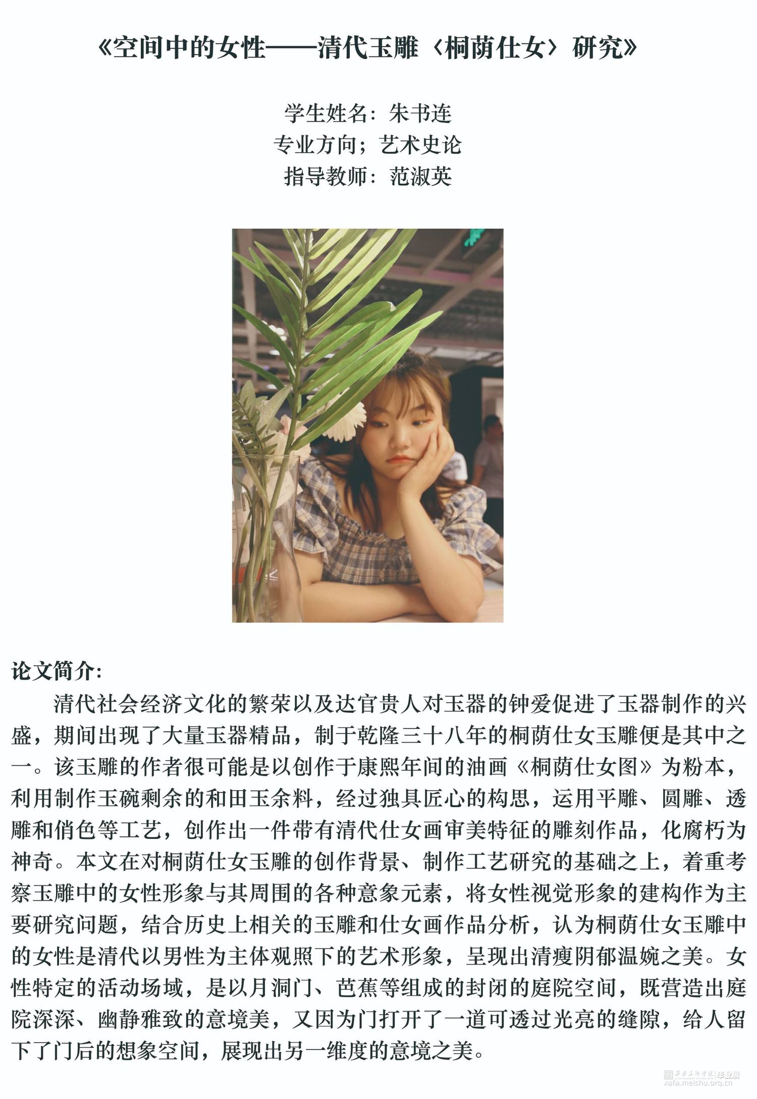 标题:空间中的女性——清代玉雕《桐荫仕女》研究作者:朱书连指导老师:范淑英摘要:清代社会经济文化的繁荣以及达官贵人对玉器的钟爱促进了玉器制作的兴盛,期间出现了大量精品,制于乾隆三十八年的桐荫仕女玉雕便是其中之一。该玉雕的作者很可能是以创作于康熙年间的油画《桐荫仕女图》为粉本,利用制作玉碗剩余的和田玉余料,经过独具匠心的构思,运用平雕、圆雕、透雕和俏色等工艺,创作出一件带有清代仕女画审美特征的雕刻作...