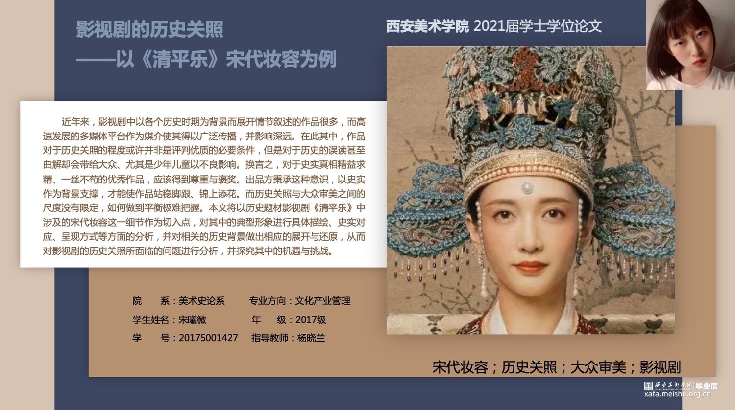 近年来,影视剧中以各个历史时期为背景而展开情节叙述的作品很多,而高速发展的多媒体平台作为媒介使其得以广泛传播,并影响深远。在此其中,作品对于历史关照的程度或许并非是评判优质的必要条件,但是对于历史的误读甚至曲解却会带给大众、尤其是少年儿童以不良影响。换言之,对于史实真相精益求精、一丝不苟的优秀作品,应该得到尊重与褒奖。出品方秉承这种意识,以史实作为背景支撑,才能使作品站稳脚跟、锦上添花。而历史关照与大众审美之间的尺度没有限定,如何做到平衡极难把握。本文将以历史题材影视剧《清平乐》中涉及的宋代妆容这一细节