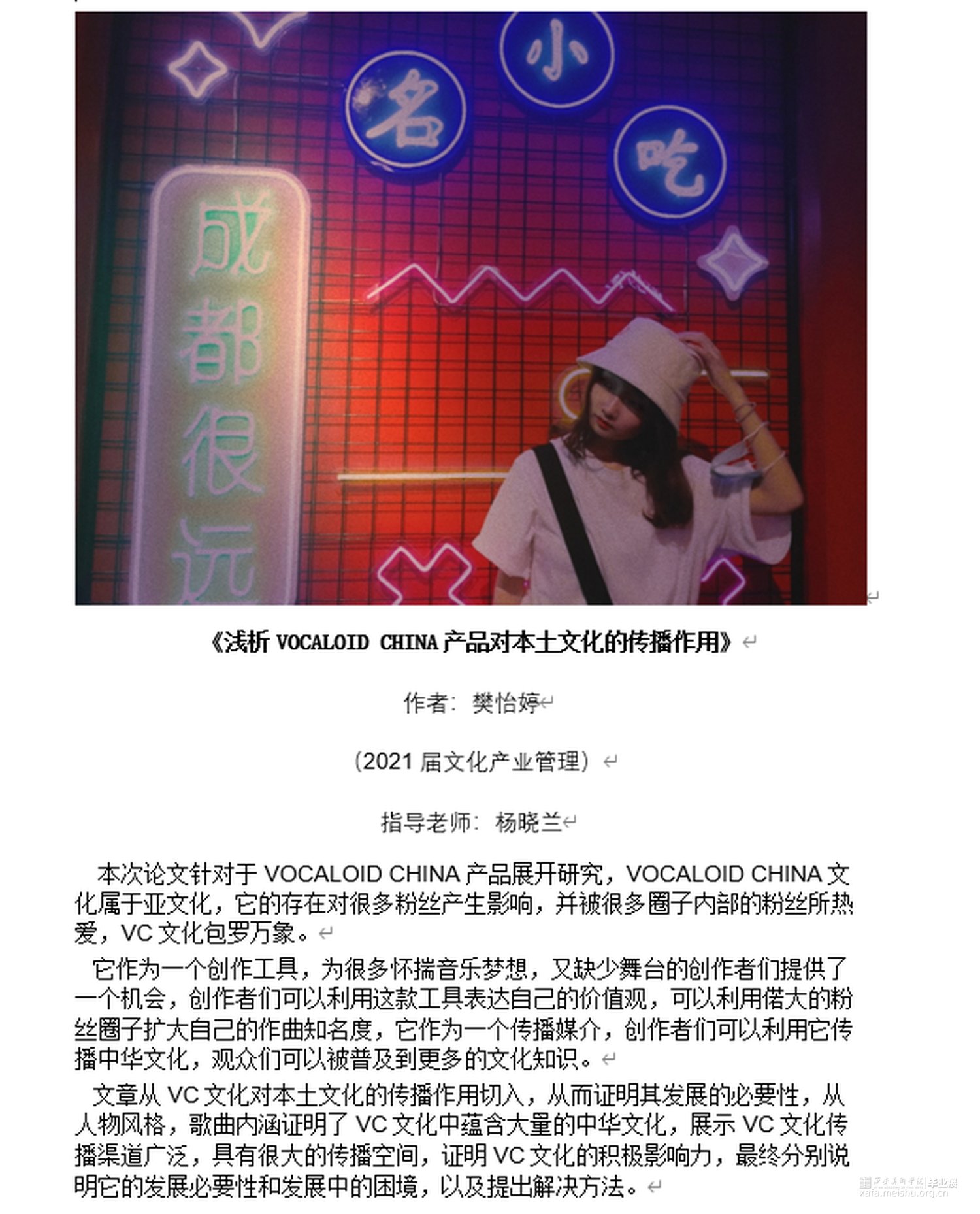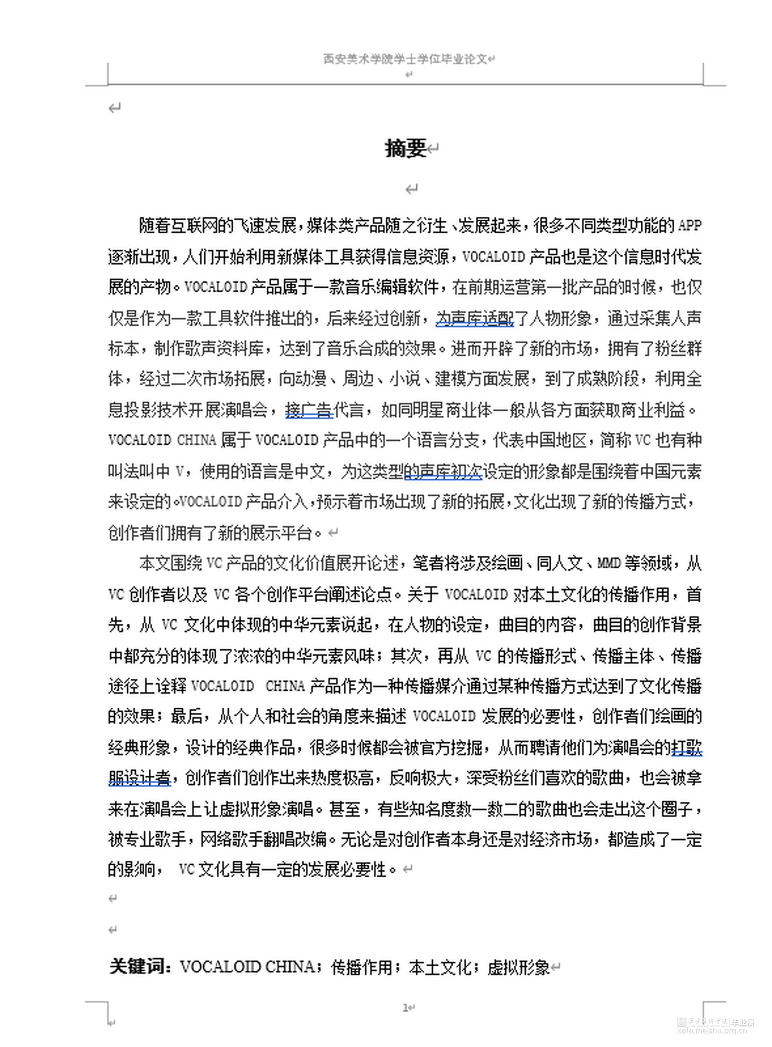 从论文目标的确立,到论文框架目录的编排,再到最终论文的完成一共用了两个月的时间,这期间从各个渠道获取资料,总结结论,自主调查,看到了一些不一样的看法,也学习到了别人看问题的新角度,VC文化一直属于小众亚文化,并且近几年在其他形式的介入下开始淡化,笔者从VOCALOID的分支VC入手,探究其对中华本土文化的传播作用。