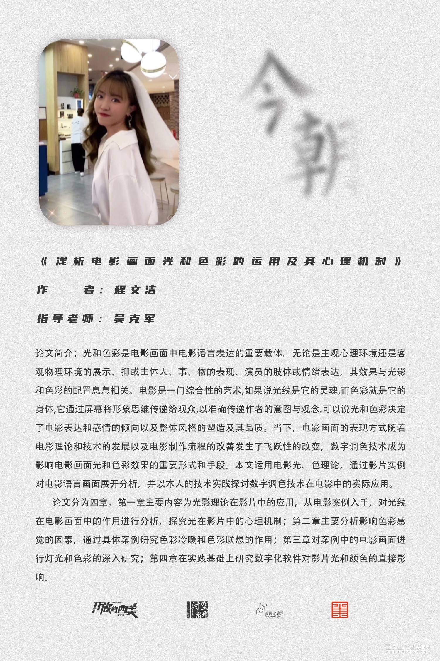 论文分为四章。第一章主要内容为光影理论在影片中的应用,从电影案例入手,对光线在电影画面中的作用进行分析,探究光在影片中的心理机制;第二章主要分析影响色彩感觉的因素,通过具体案例研究色彩冷暖和色彩联想的作用;第三章对案例中的电影画面进行灯光和色彩的深入研究;第四章在实践基础上研究数字化软件对影片光和颜色的直接影响。