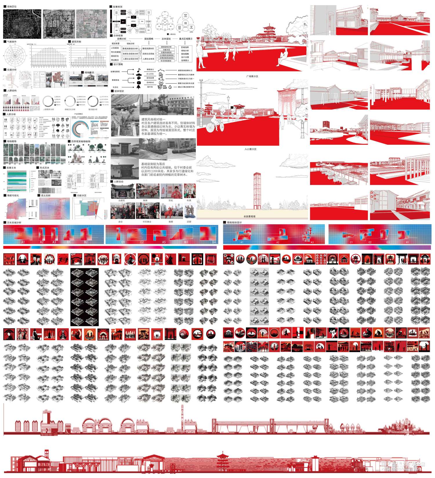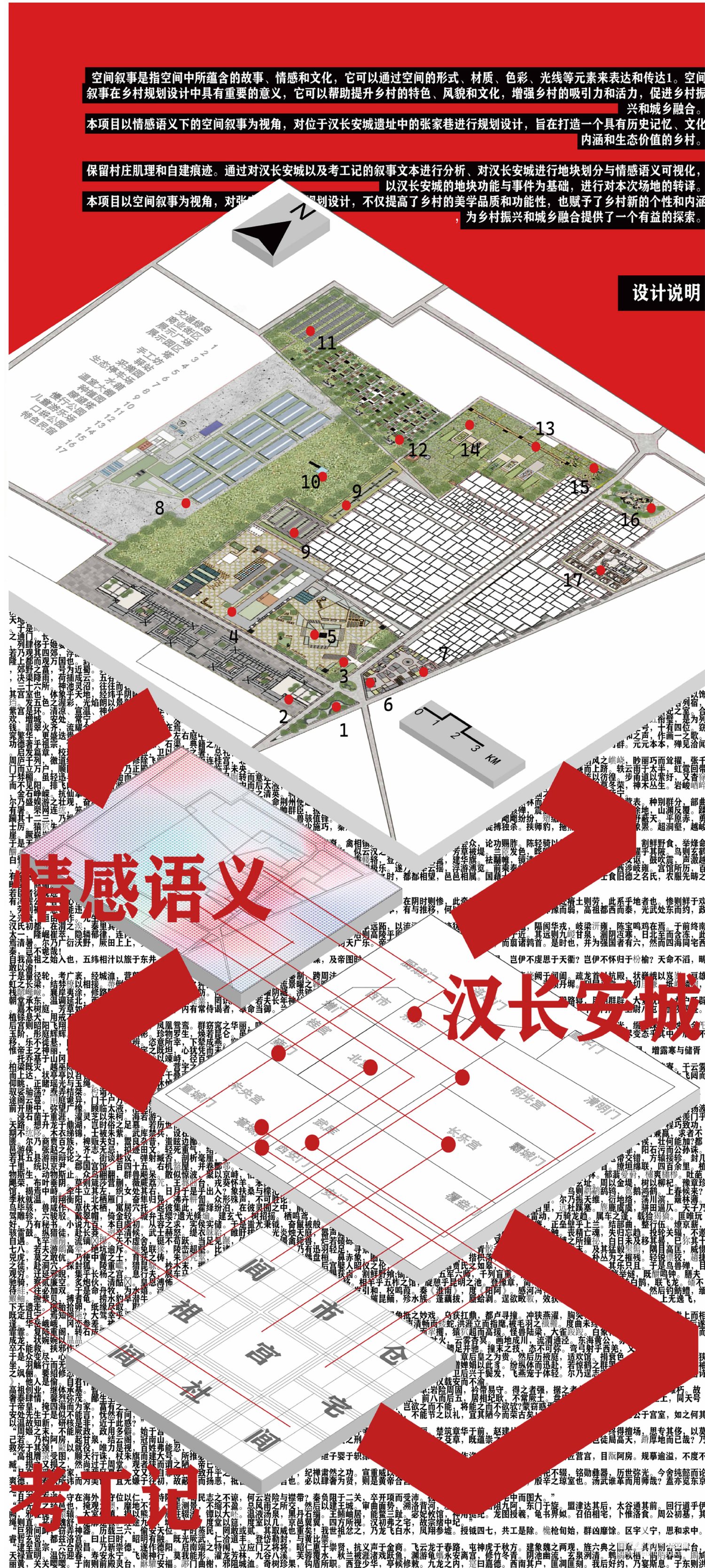 设计理念为保留村庄肌理和自建痕迹。通过对汉长安城以及考工记的叙事文本进行分析、对汉长安城进行地块划分与情感语义可视化,以汉长安城的地块功能与事件
