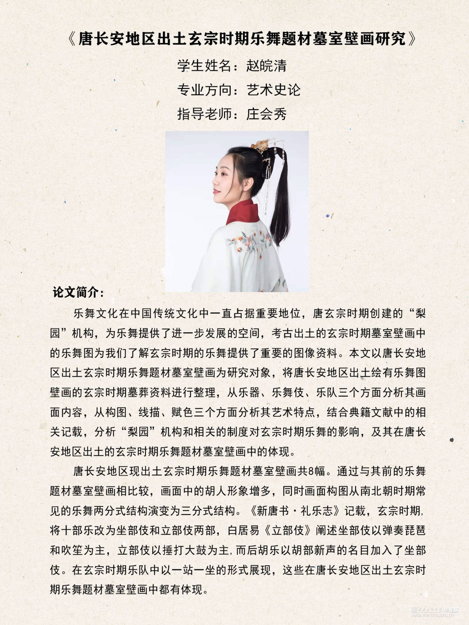《唐长安地区出土玄宗时期乐舞题材墓室壁画研究》作者:赵皖清 指导老师:庄会秀 乐舞文化在中国传统文化中一直占据重要地位,唐玄宗时期创建的“梨园”机构,为乐舞提供了进一步发展的空间,考古出土的玄宗时期墓室壁画中的乐舞图为我们了解玄宗时期的乐舞提供了重要的图像资料。本文以唐长安地区出土玄宗时期乐舞题材墓室壁画为研究对象,将唐长安地区出土绘有乐舞图壁画的玄宗时期墓葬资料进行整理,从乐器、乐舞伎、乐队三个...