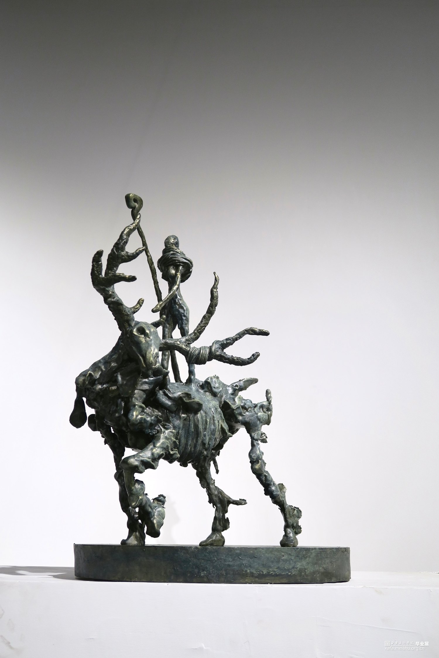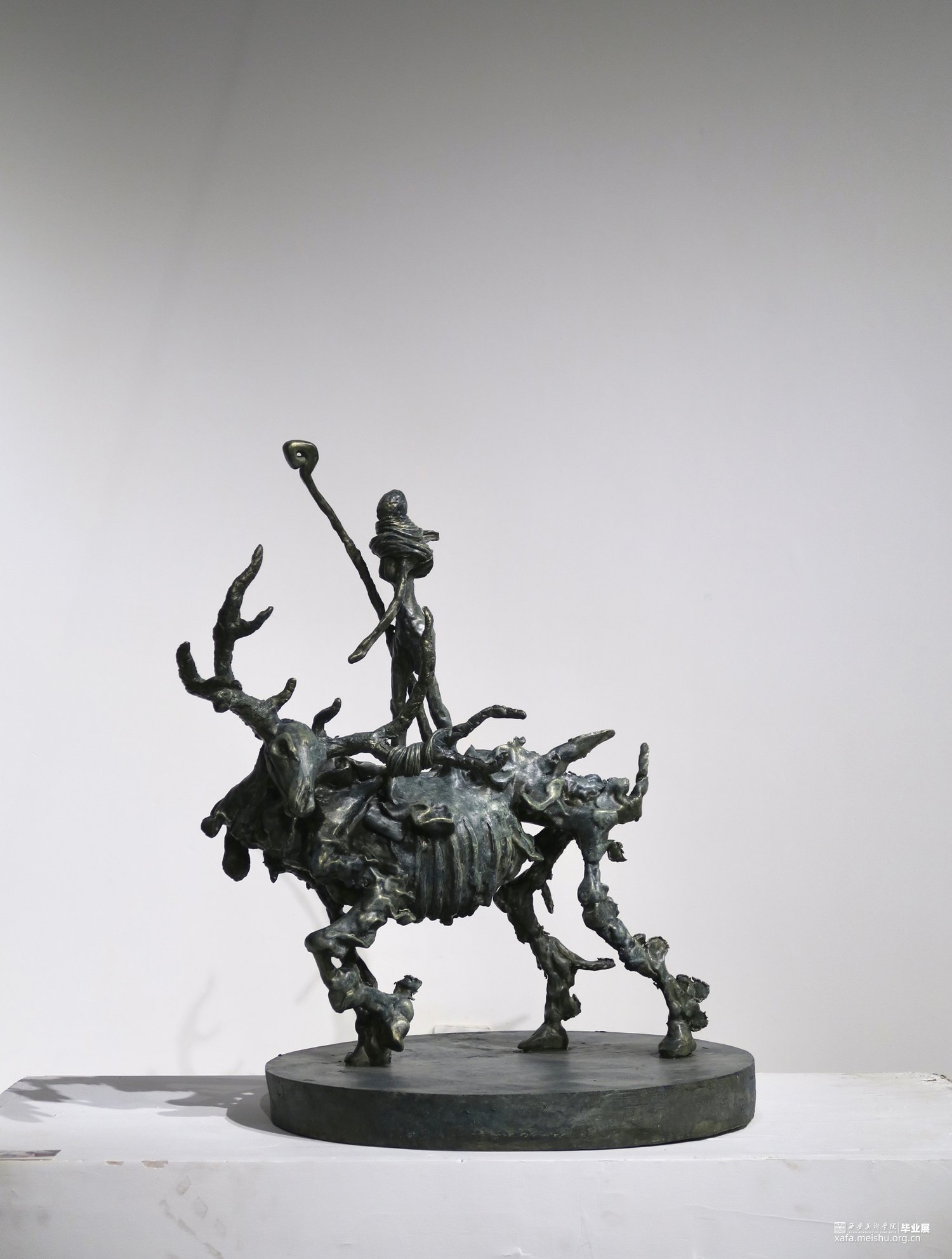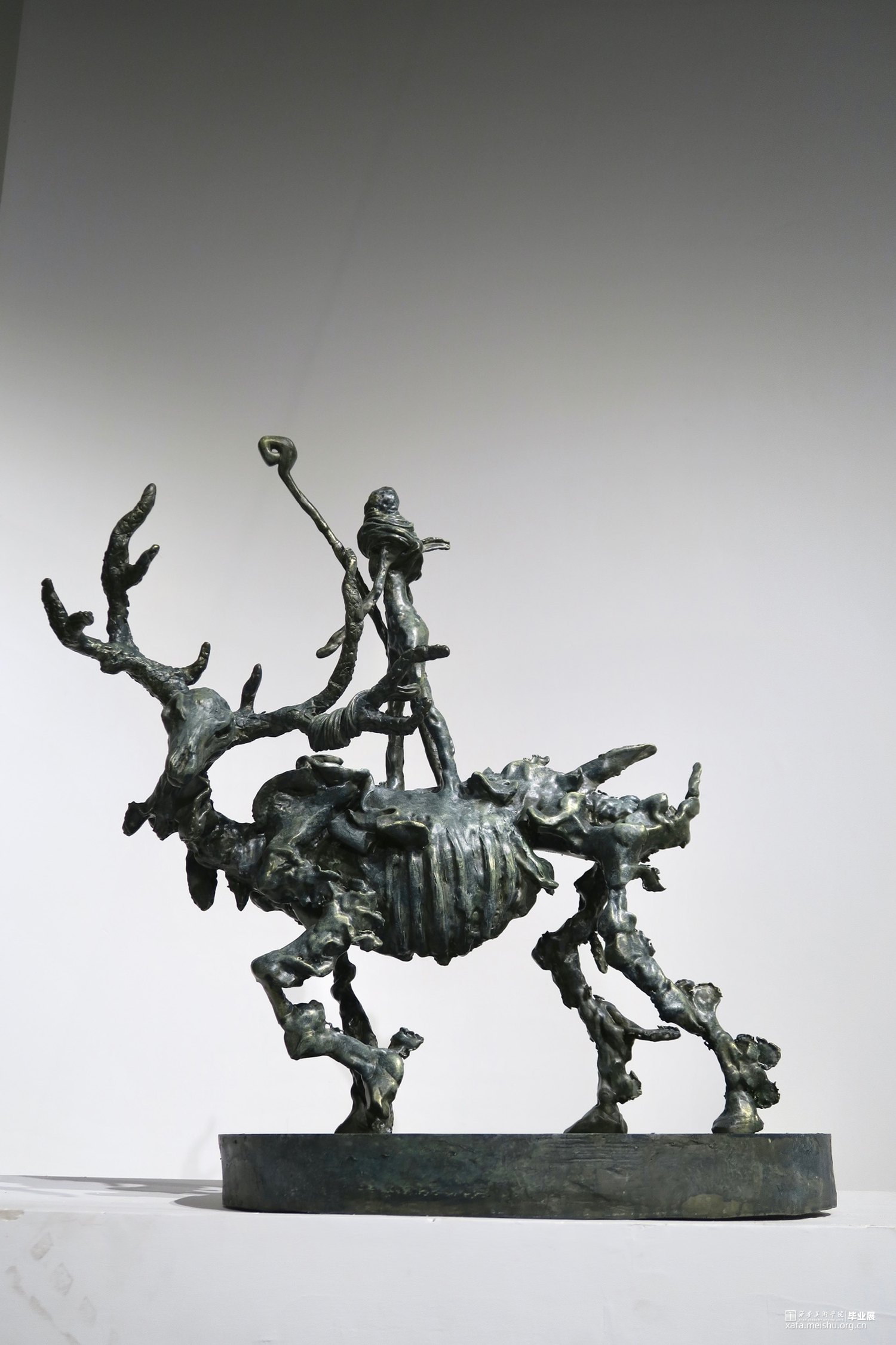作品《在“路”上》将鹿与人物结合体现出人与动物、自然的共生。作品自身的斑驳感也是自然界的一种纯粹的美。二者动态的结合反应了人与动物、自然共同在路上。