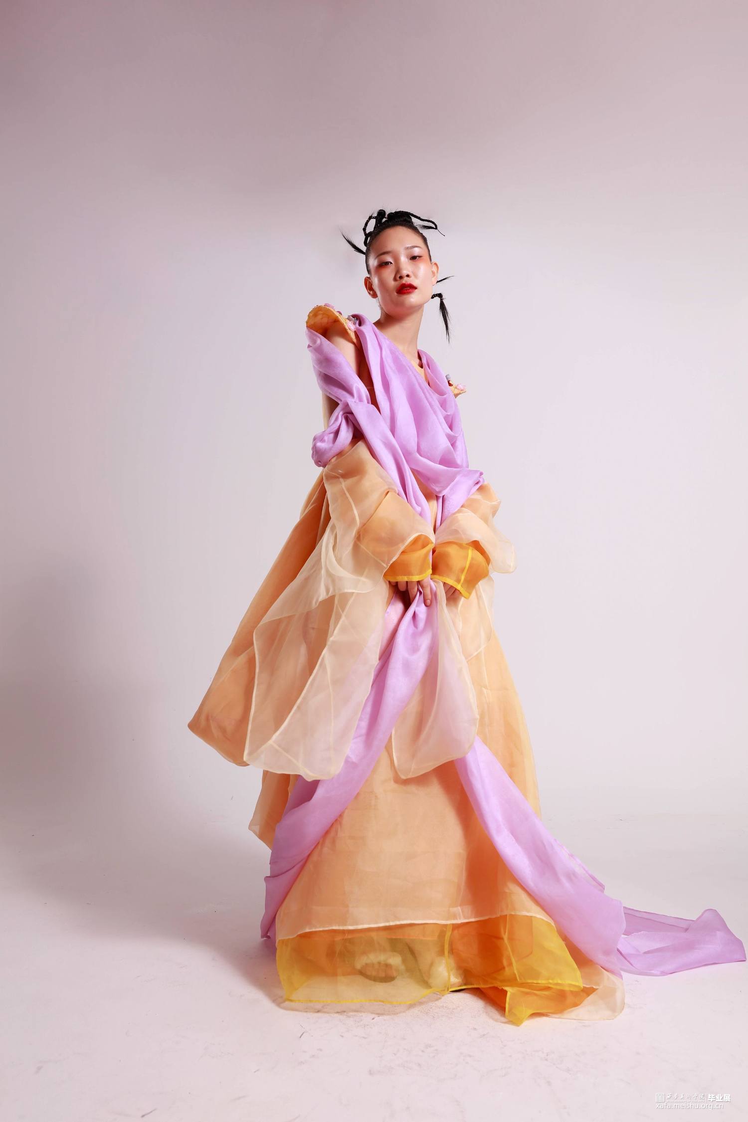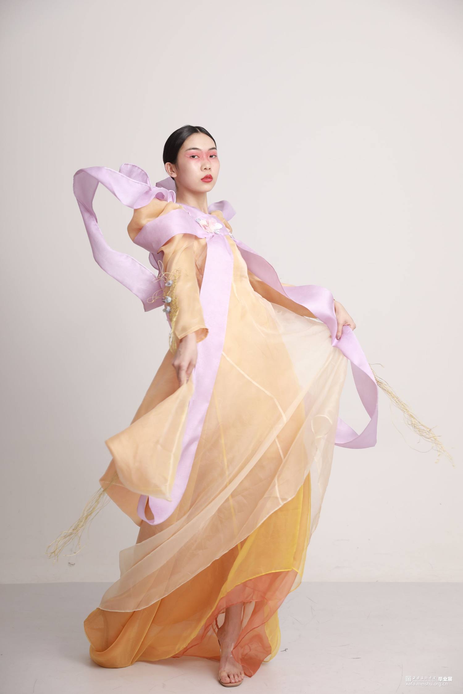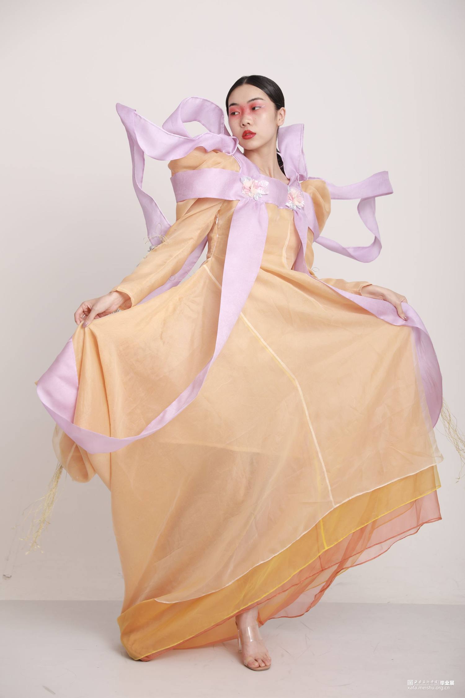 我的毕业创作以披帛为灵感来源,将其运用在服装面料的设计上,结合减法裁剪带来的怪诞不确定造型,经过多次反复实验和修改最终完成了毕业创作。本设计旨在对披帛的承袭和创新,与减法裁剪相结合,探究中华传统服饰与现代礼服的融合与创新运用。