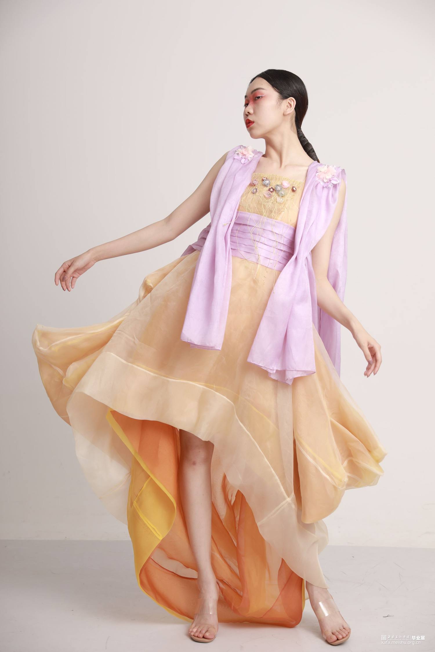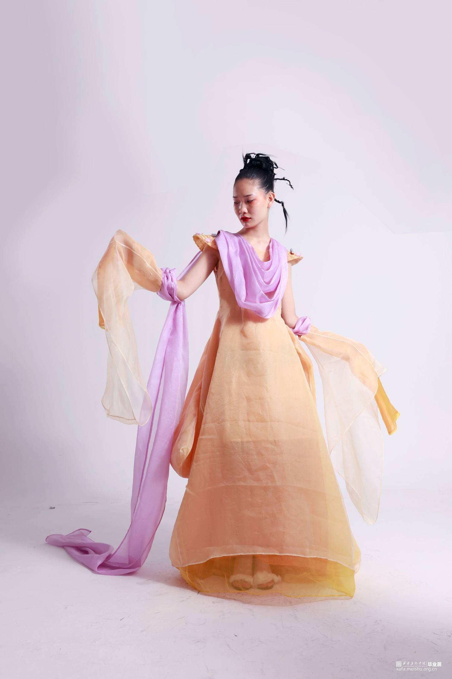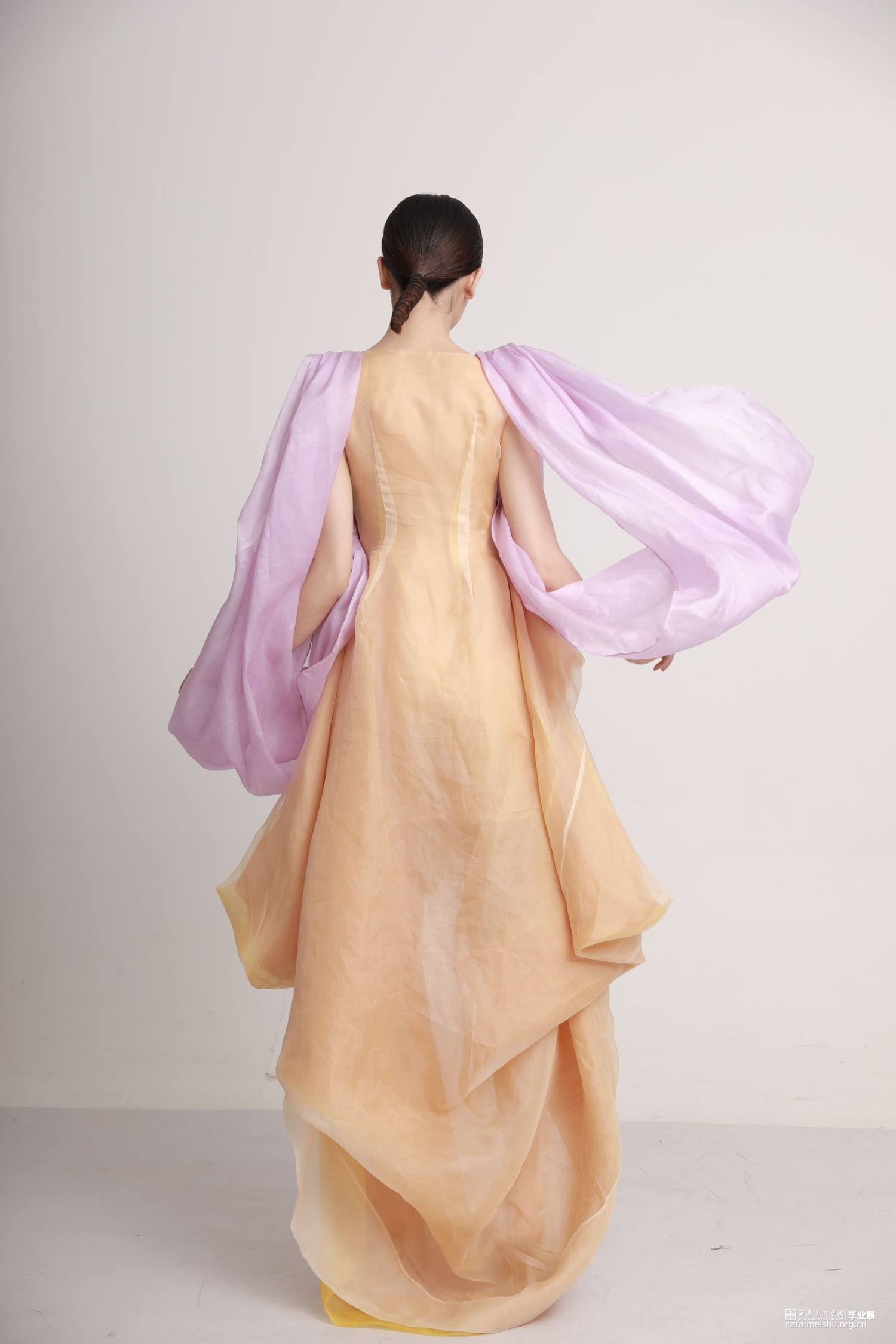 我的毕业创作以披帛为灵感来源,将其运用在服装面料的设计上,结合减法裁剪带来的怪诞不确定造型,经过多次反复实验和修改最终完成了毕业创作。本设计旨在对披帛的承袭和创新,与减法裁剪相结合,探究中华传统服饰与现代礼服的融合与创新运用。