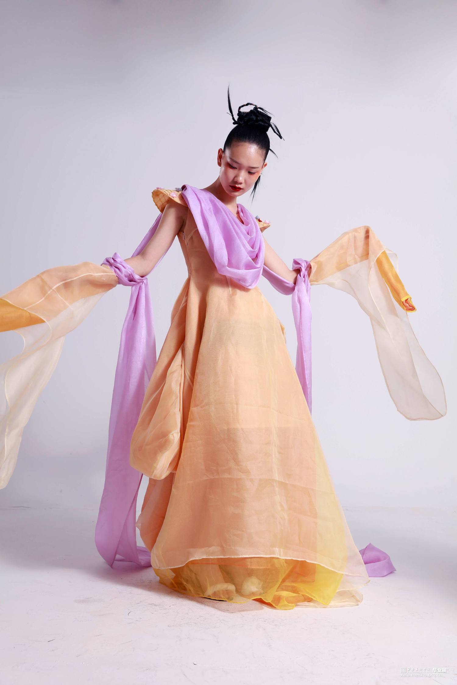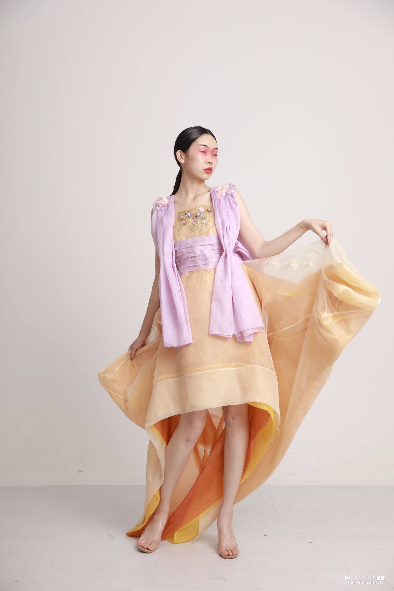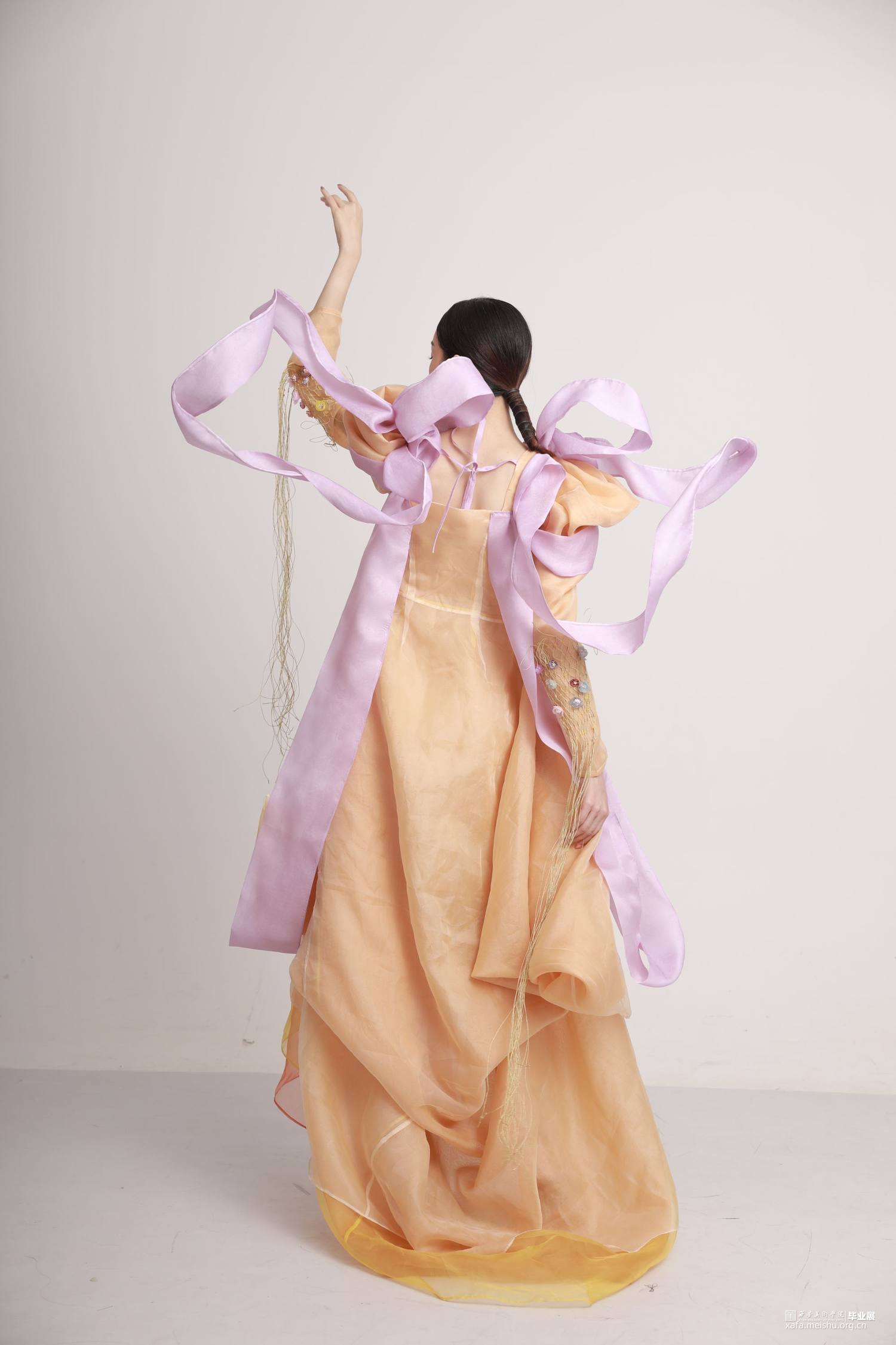 本次设计在款式上不仅借鉴唐代舞女服装的款型特点,还将其夸张、变型,结合现代礼服形制进行融合创新,形成独特的设计风格。在裁剪方法上,将平面裁剪与减法裁剪进行中西结合设计,碰撞中出和谐。在面料选用上,以真丝绡为主要面料,综合运用其他多种材料,其含义也更是符合探索传统艺术文化与当代设计相融合的另一种具象表现。
