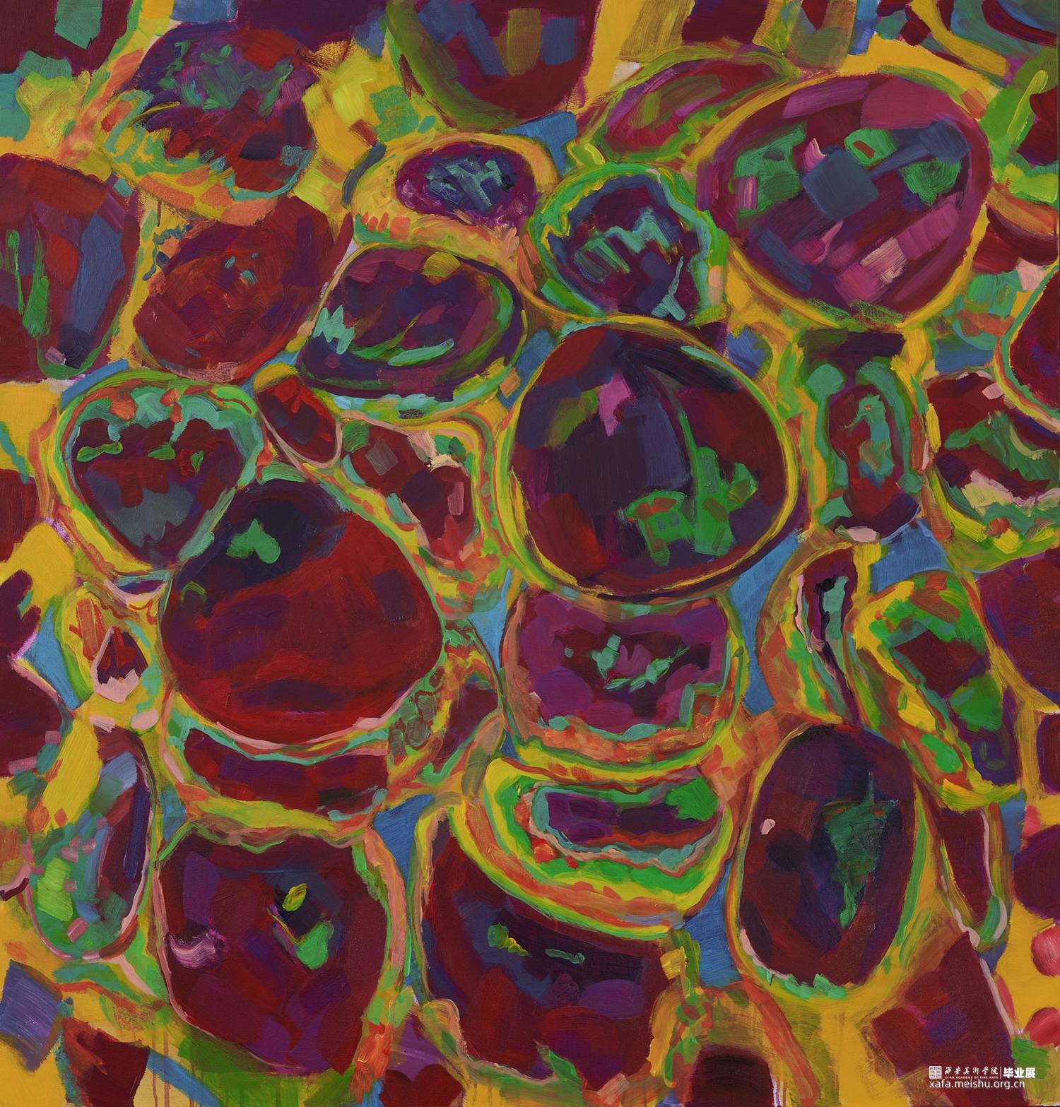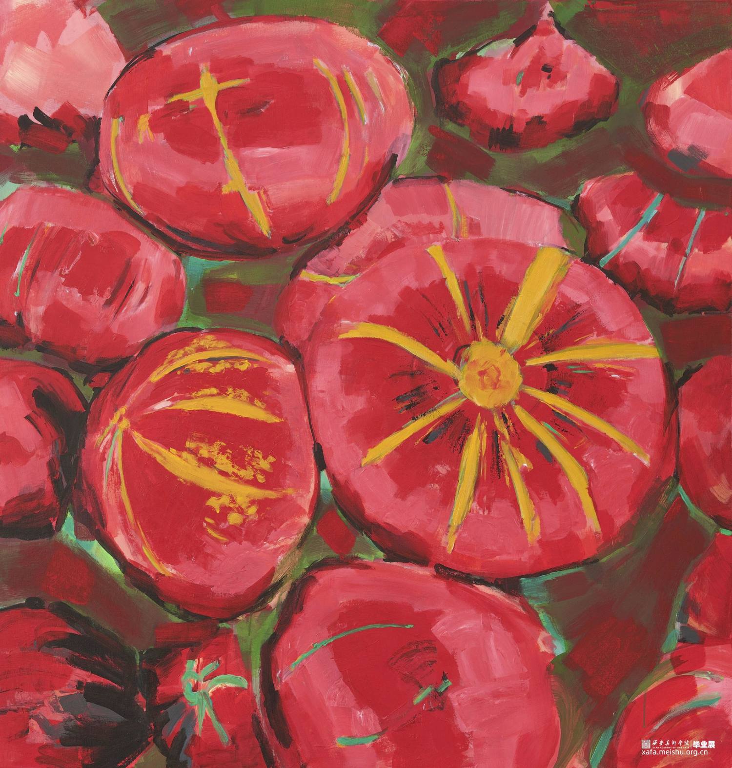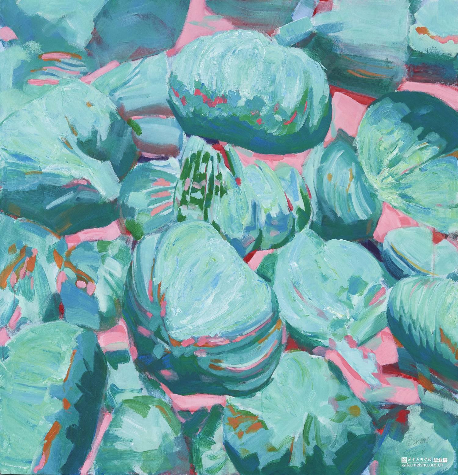 以果蔬为画面主题,不以物体的原本颜色为画面色调,采用不同对比色来搭配成画面色彩,形成色块与色块之间的碰撞。