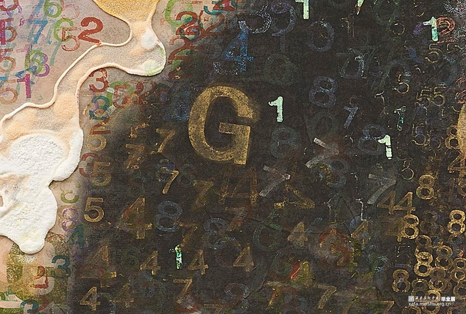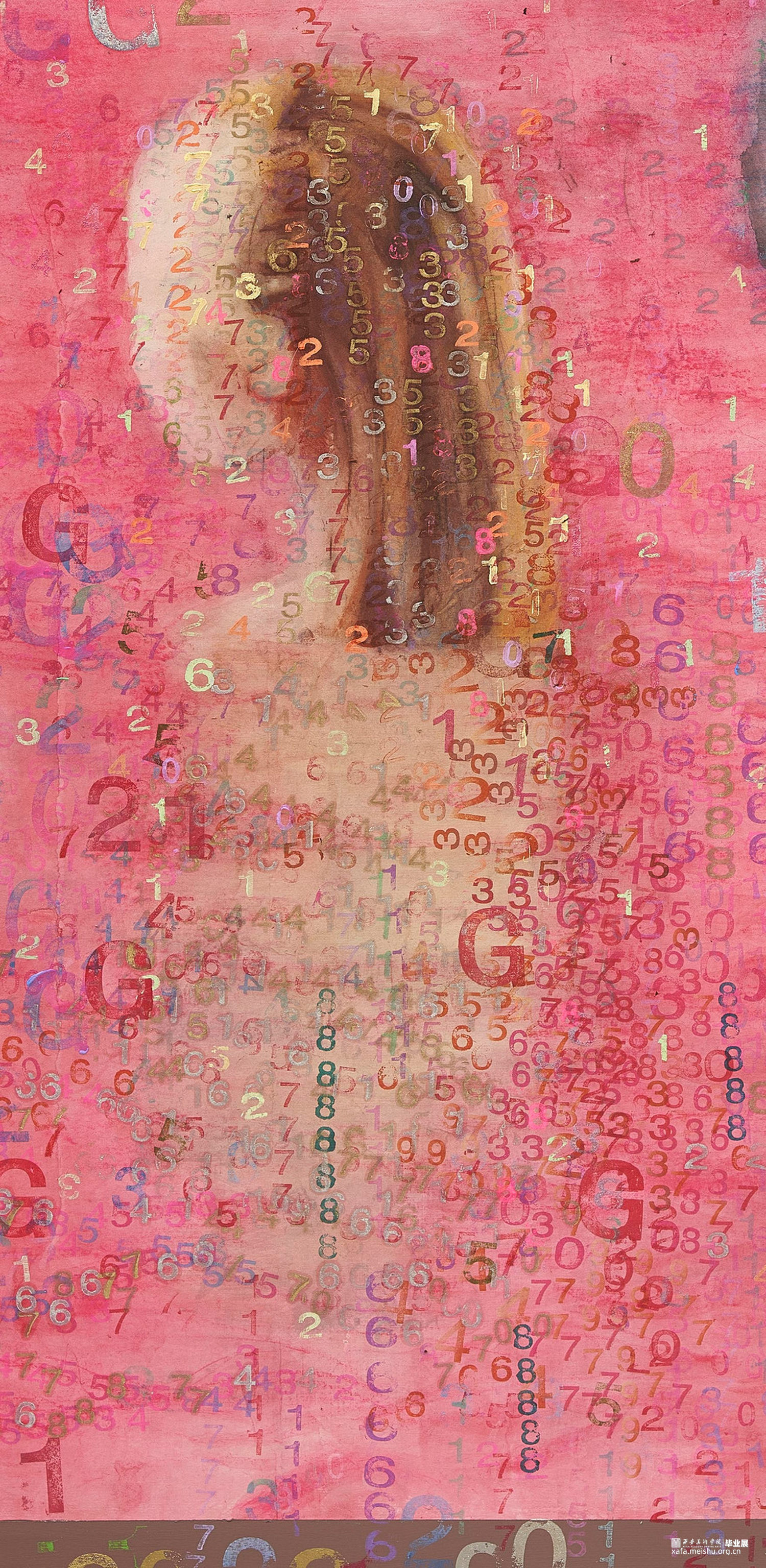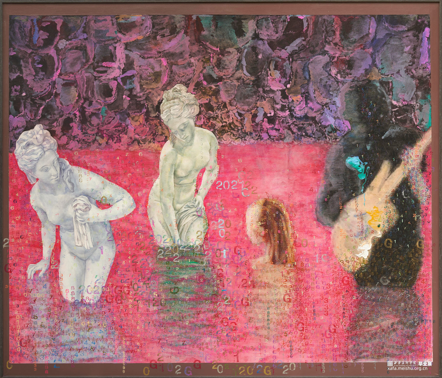 画作被水面明显的区分了上下两部分,上部分色彩绚丽的背景如果倒过来观看会发现是人群的剪影,下半部分水面上飘散着由数字构成的数据流,它们与古典与现代主体共同构成了我们每一个人生存的数据世界,这个G时代。