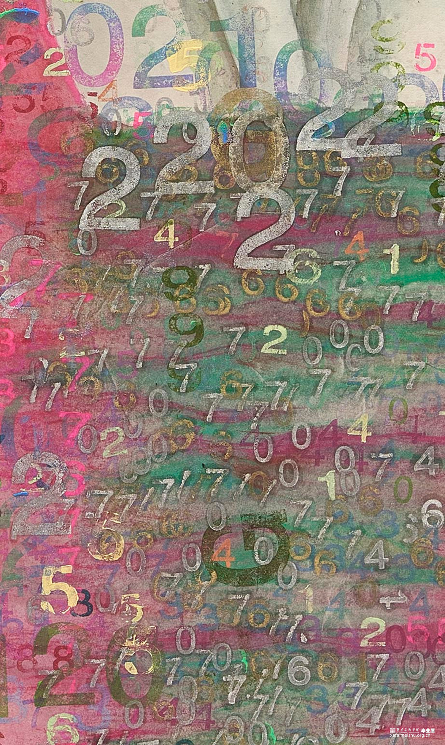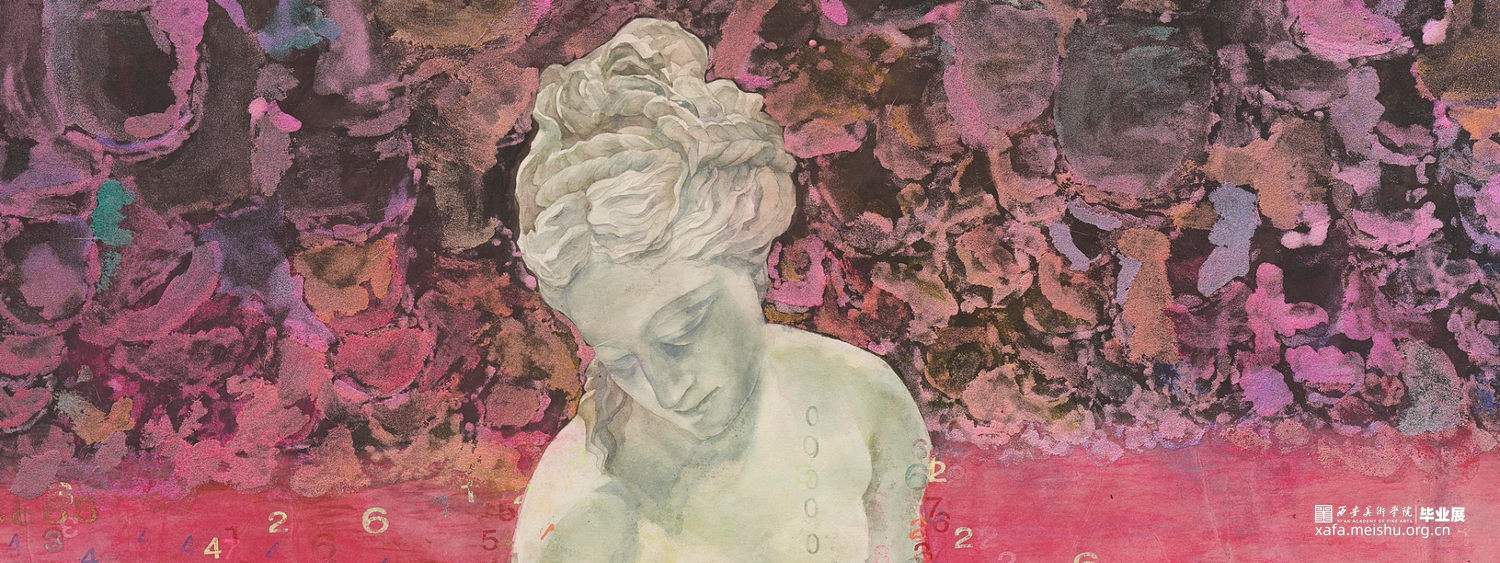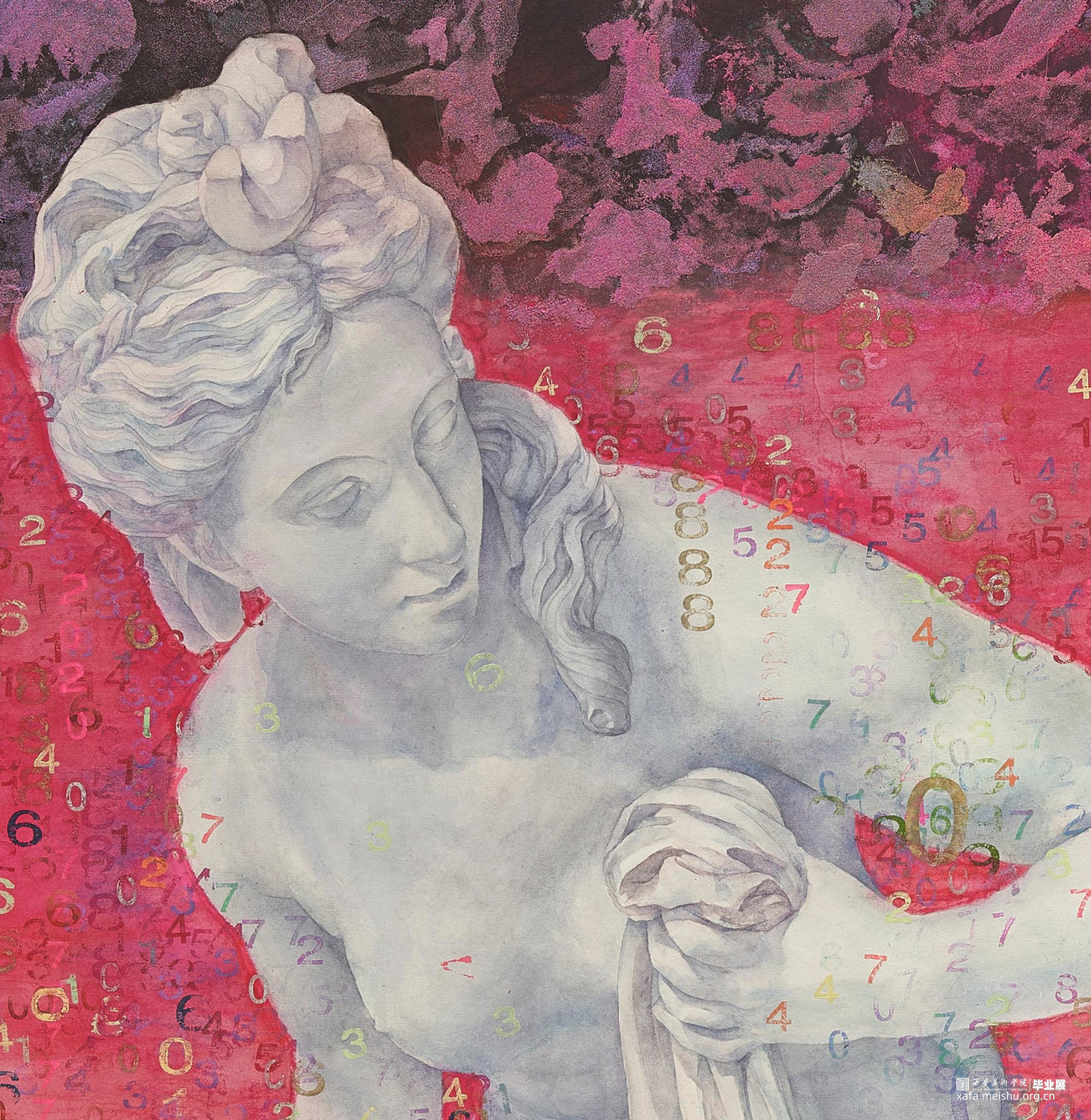 画作被水面明显的区分了上下两部分,上部分色彩绚丽的背景如果倒过来观看会发现是人群的剪影,下半部分水面上飘散着由数字构成的数据流,它们与古典与现代主体共同构成了我们每一个人生存的数据世界,这个G时代。
