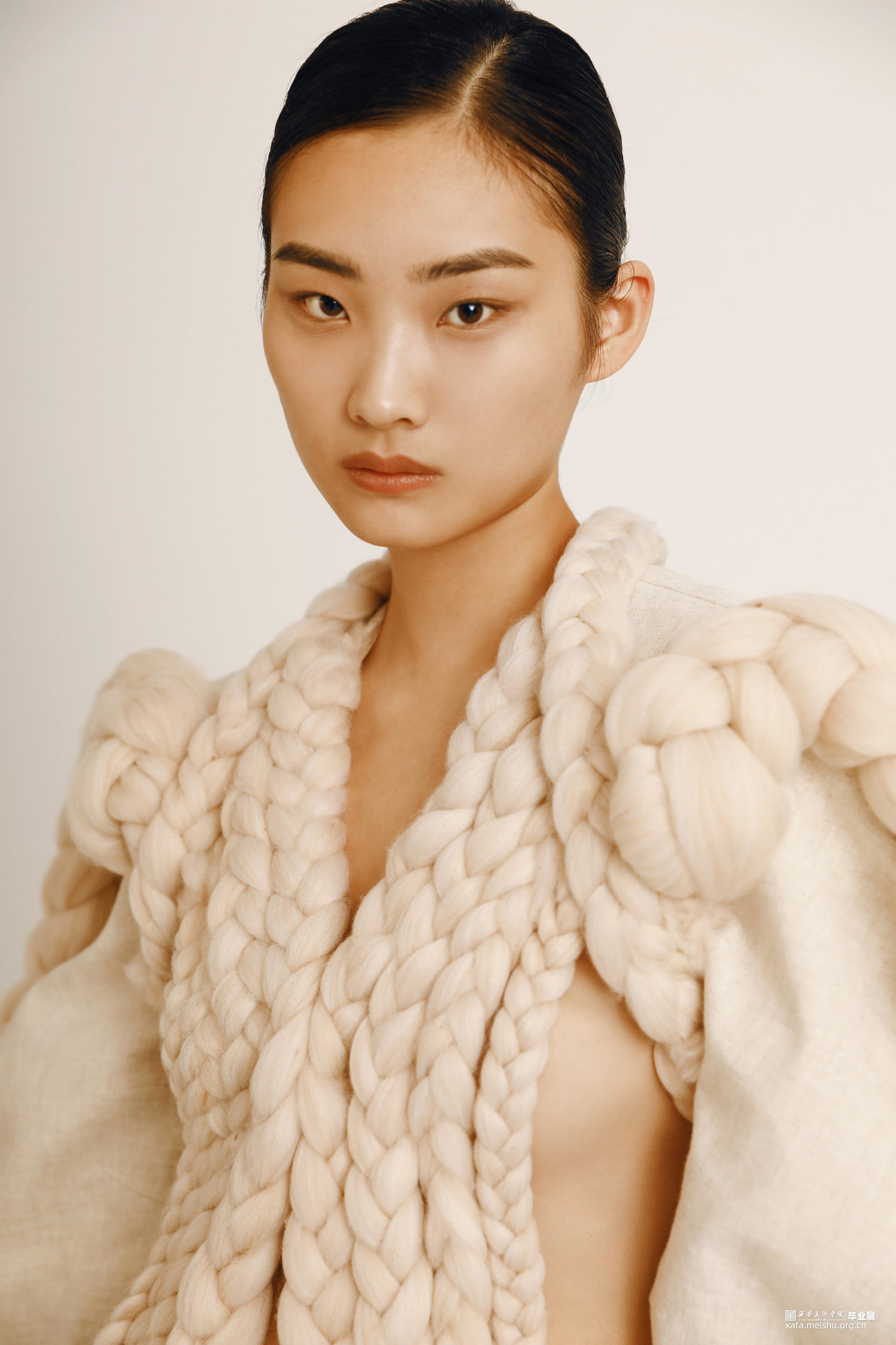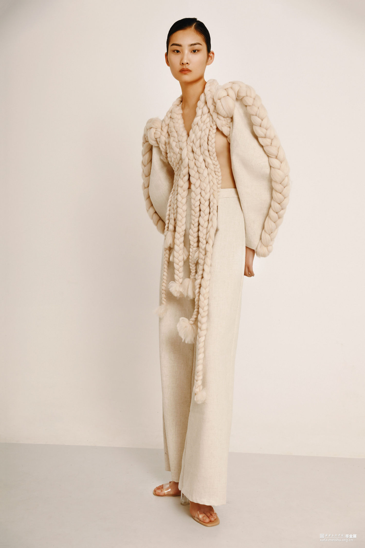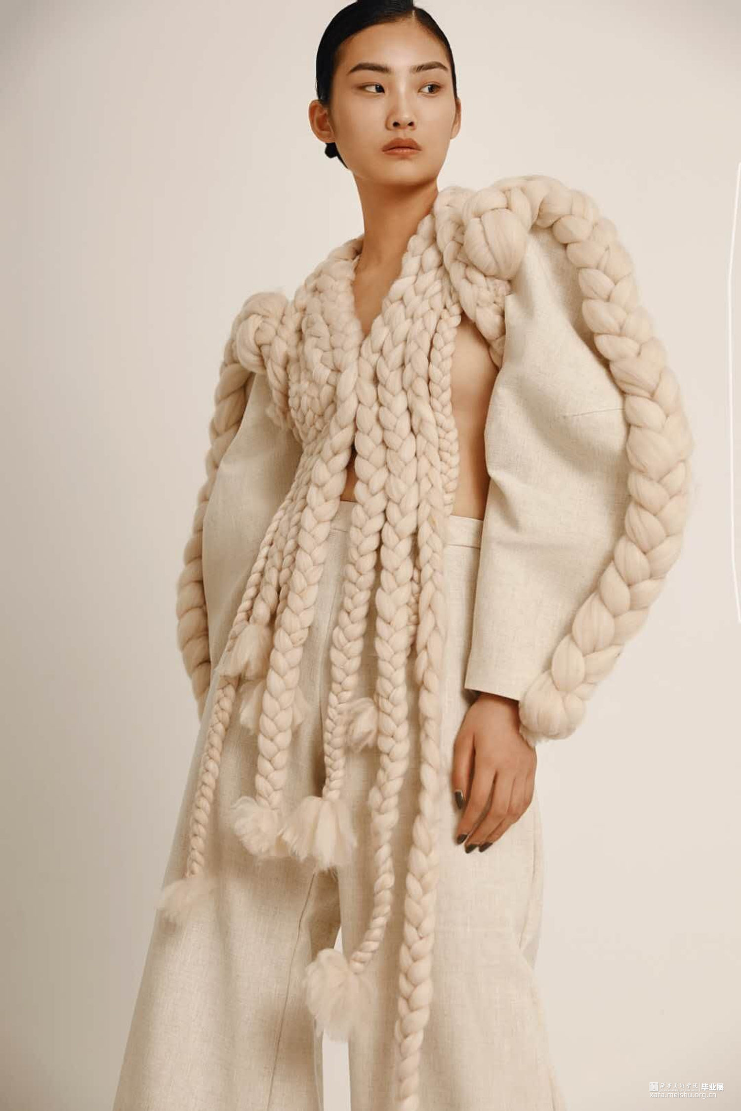 通过对唐代白瓷的研究,发现白瓷艺术也十分强调运用流动的线条体现节奏的韵律。不同的造型应运用不同的装饰手法来进行搭配和点缀,以及考虑装饰在器型的不同部位都会有些什么用途。流动的线条体现出陶瓷外观形态的韵律,纹饰的构图与陶瓷整体造型完美契合,用流动韵律的外在形式表现出无限生命力的内在精神。同理,对服装也是一样,在符合人体体型上,利用各种辅料营造出符合设计师心中所想要的款式造型。在《Timeless》系列中,服装廓形已T型与Y型为主,通过夸张肩部,收紧腰部强调女性线条,整体给人以端庄简约的效果。而在面料改造中主要运用了白瓷装饰手法中的贴塑与装饰纹样中的绳络纹加以编织手法装饰在服装上,使服装更具立体感。