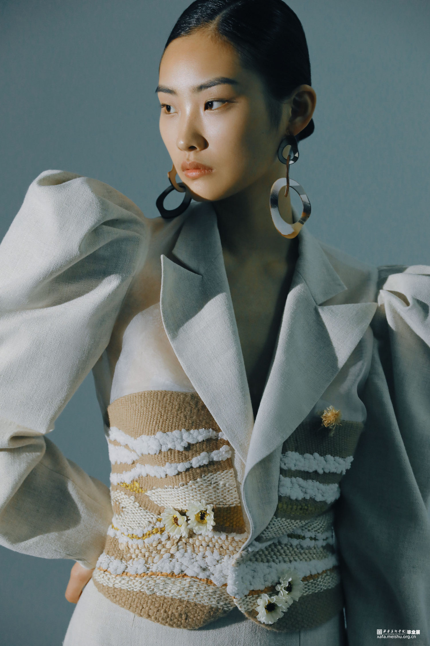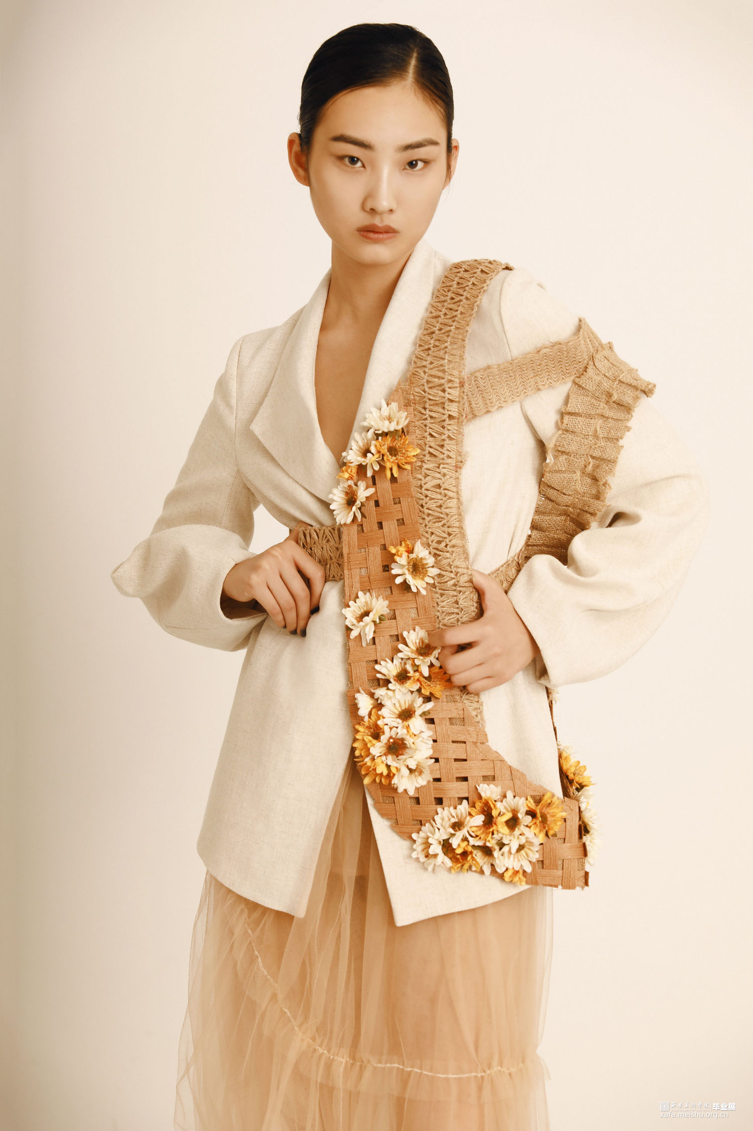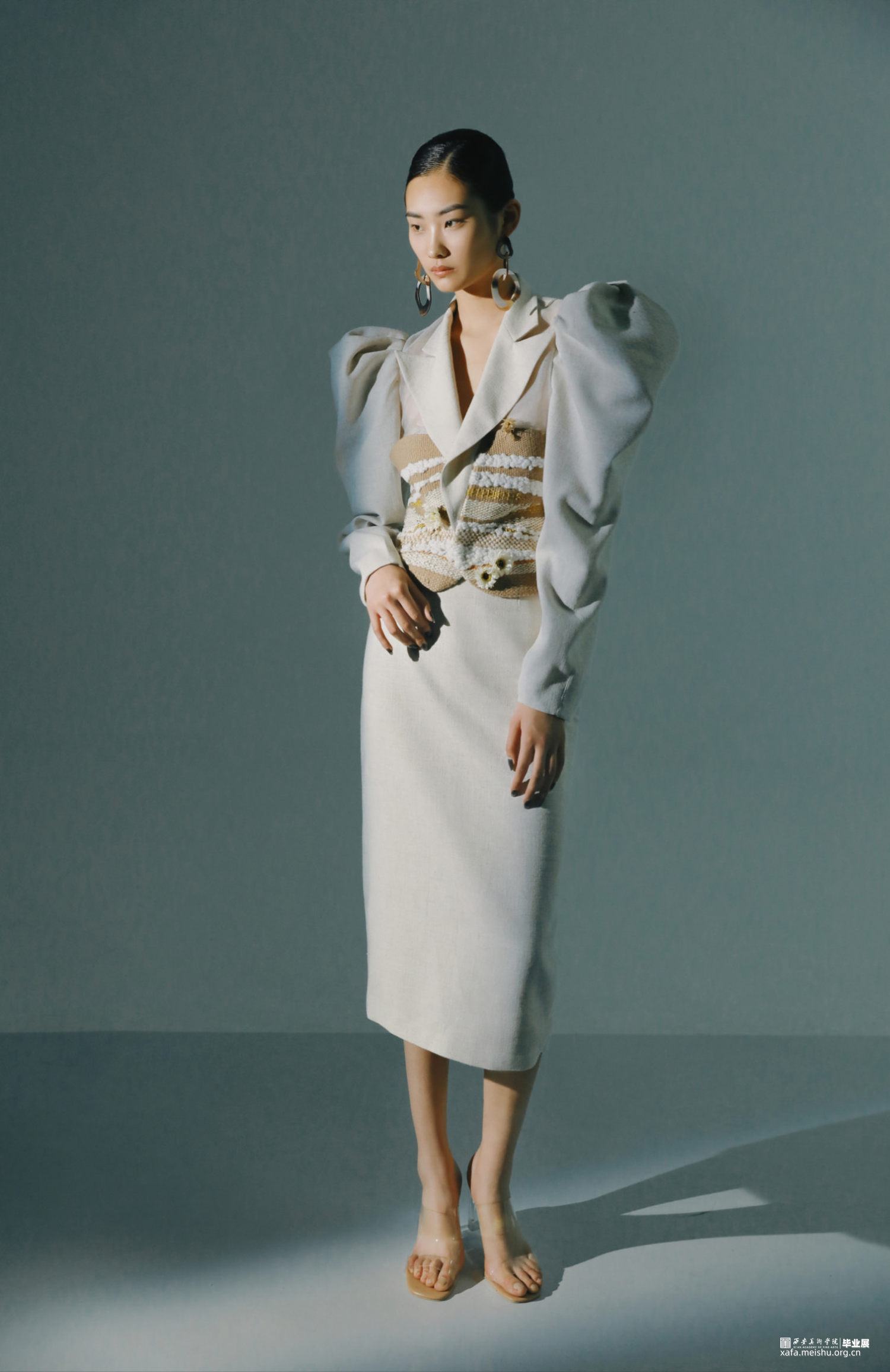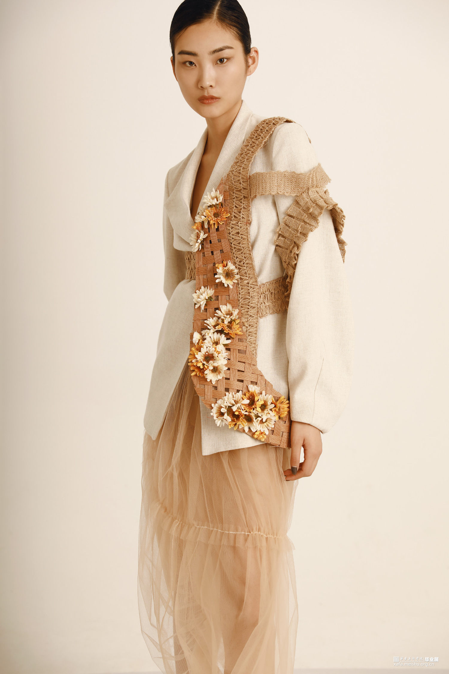 通过对唐代白瓷的研究,发现白瓷艺术也十分强调运用流动的线条体现节奏的韵律。不同的造型应运用不同的装饰手法来进行搭配和点缀,以及考虑装饰在器型的不同部位都会有些什么用途。流动的线条体现出陶瓷外观形态的韵律,纹饰的构图与陶瓷整体造型完美契合,用流动韵律的外在形式表现出无限生命力的内在精神。同理,对服装也是一样,在符合人体体型上,利用各种辅料营造出符合设计师心中所想要的款式造型。在《Timeless》系列中,服装廓形已T型与Y型为主,通过夸张肩部,收紧腰部强调女性线条,整体给人以端庄简约的效果。而在面料改造中主要运用了白瓷装饰手法中的贴塑与装饰纹样中的绳络纹加以编织手法装饰在服装上,使服装更具立体感。