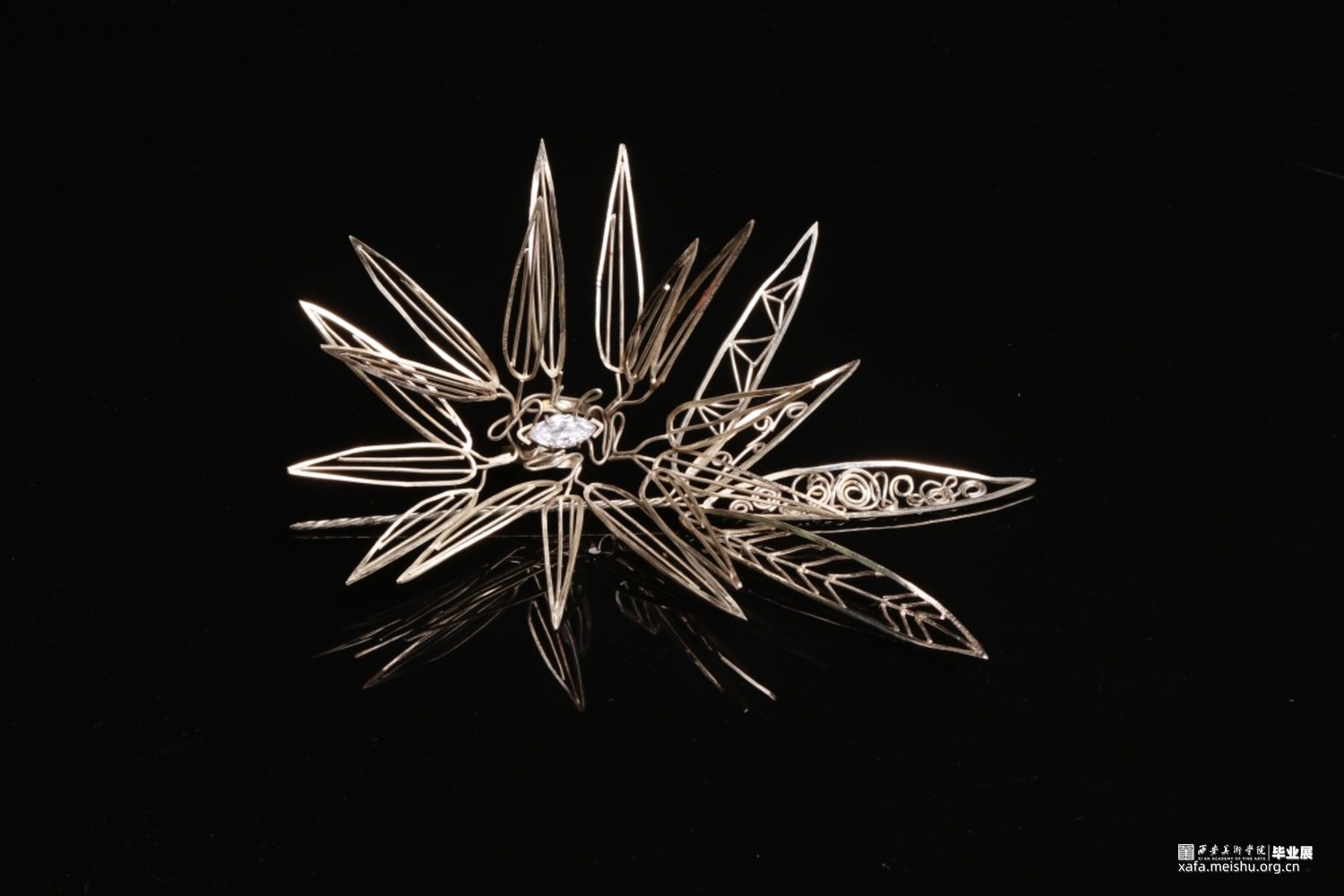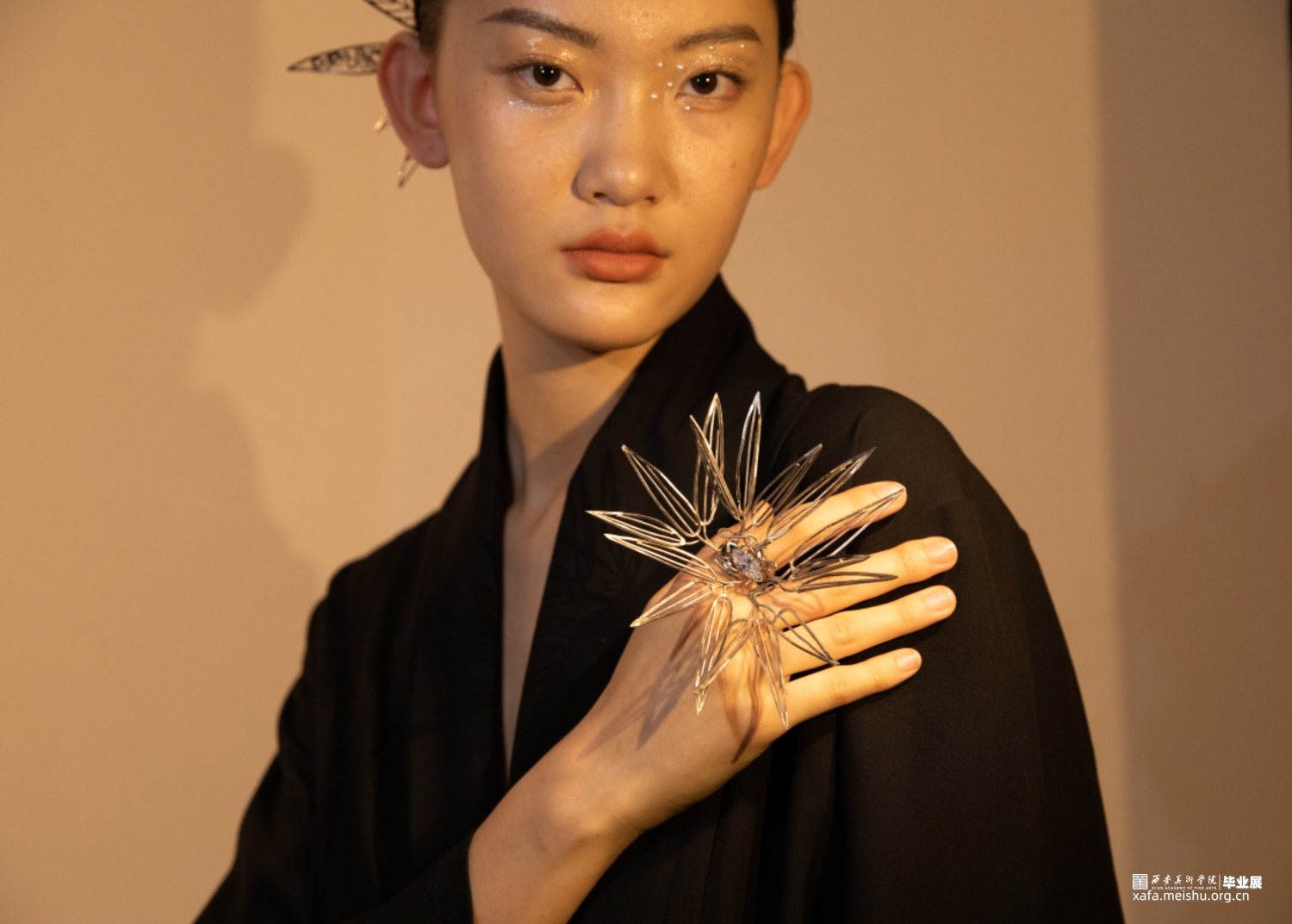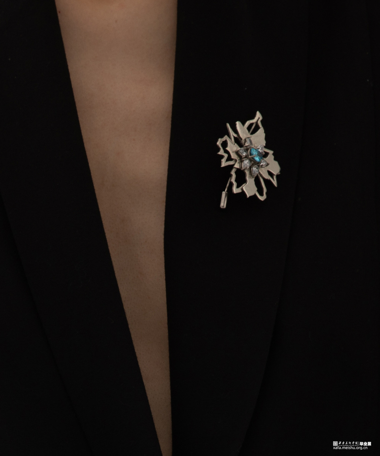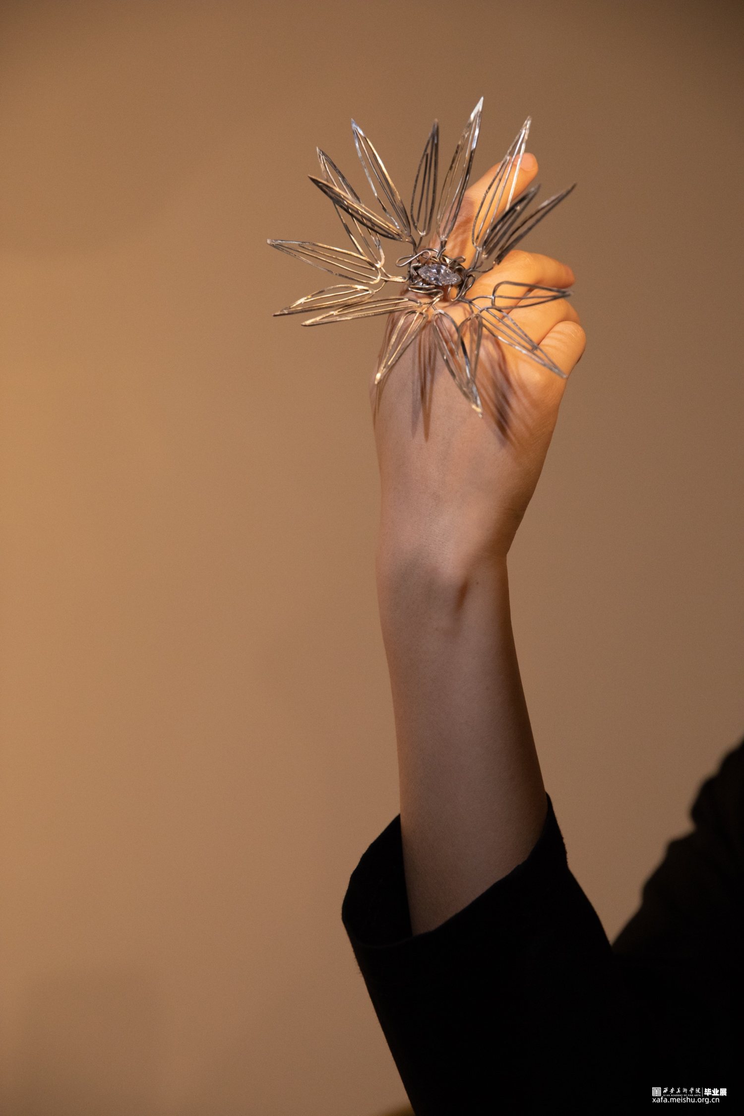我的毕业设计灵感来自于唐草纹与团花纹。之所以选择唐草纹与团花纹也是我对中国文化的喜爱。我的第一件作品取用唐草纹的“S”排列组合并将其打乱形成一种扭曲感。其廓形取用团花图案加入自身感受所形成的戒指。同时戒指的扭曲到发散也代表了我的设计方向以及脑中的构思到找到方向确定制作等。之后的作品也代表着我设计思路的延申,在这个年纪想尝试多种方式的设计表达。我的作品采用白铜,锆石等材料制作,在制作中遇到了许多问题。同时也让我的制成思路得到了许多启发。我是一个向往自由,无拘无束的人。所以我的作品中也融入了一些对各种方向的冲刺之感,还有一些打磨之痕。