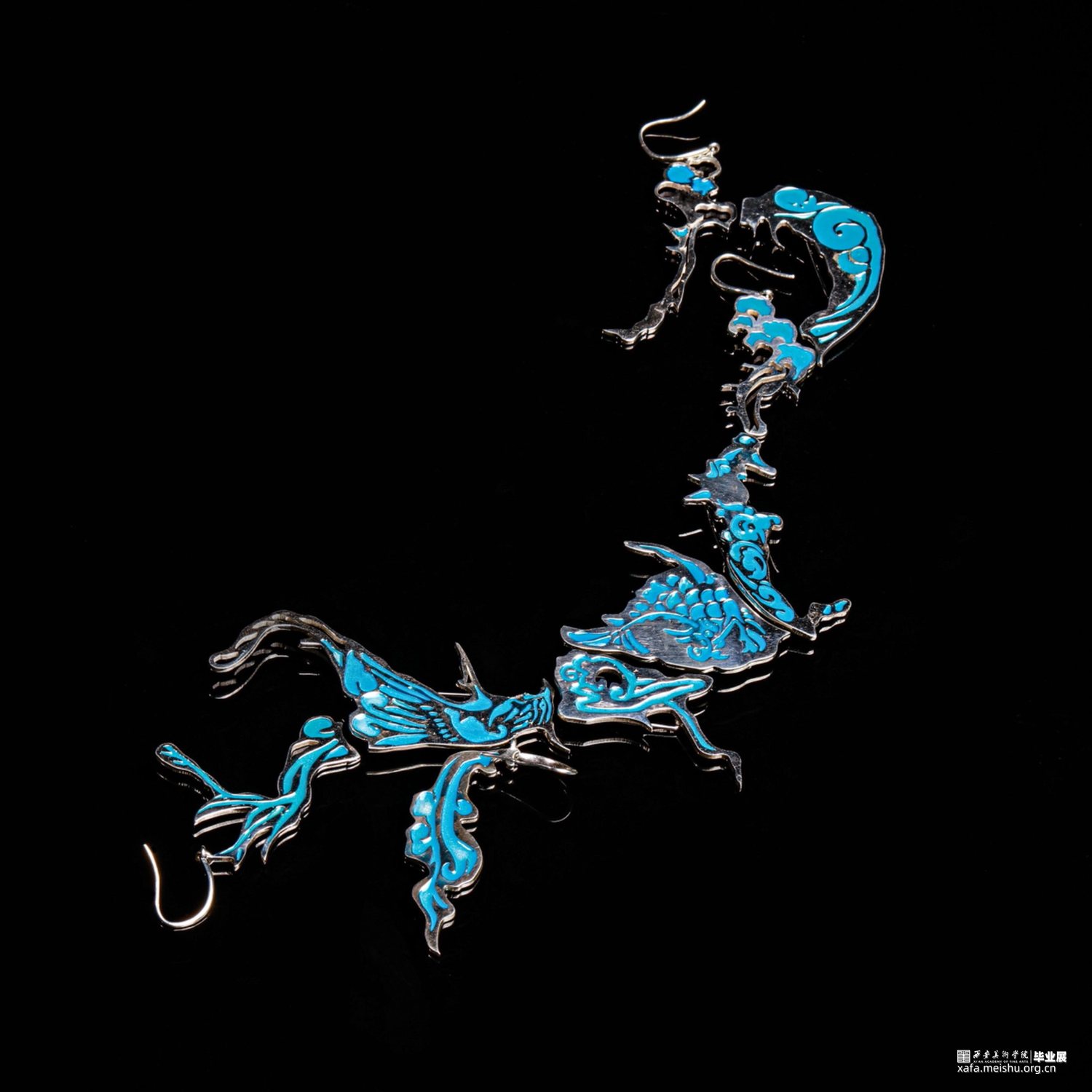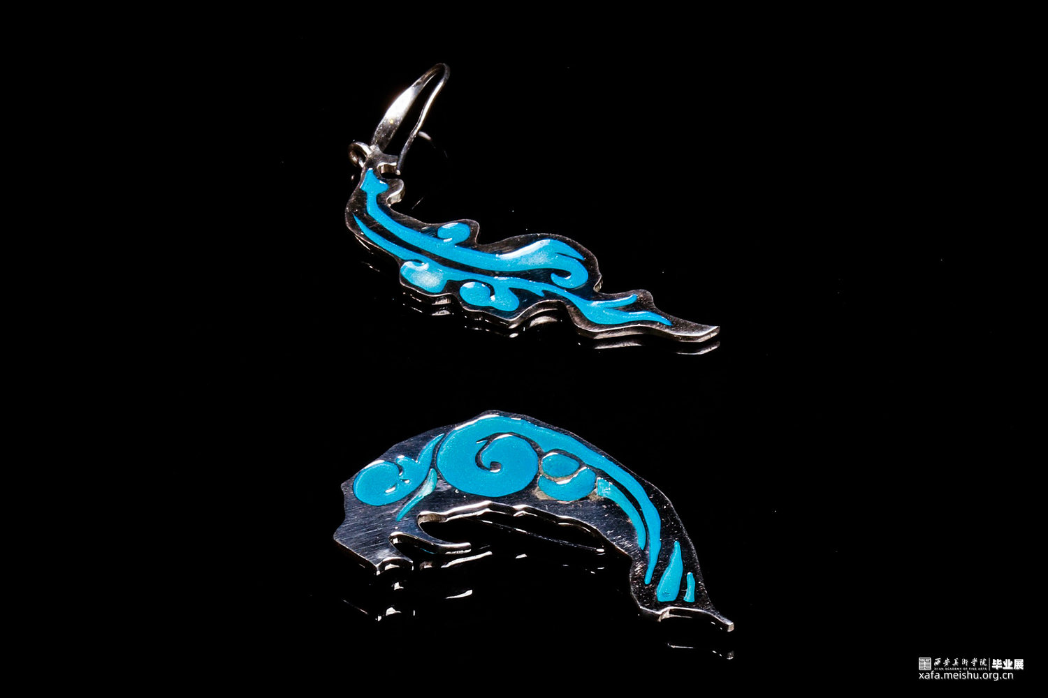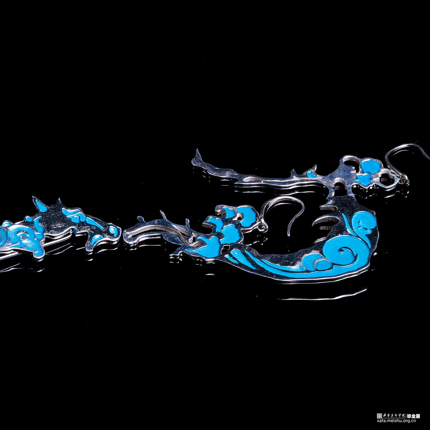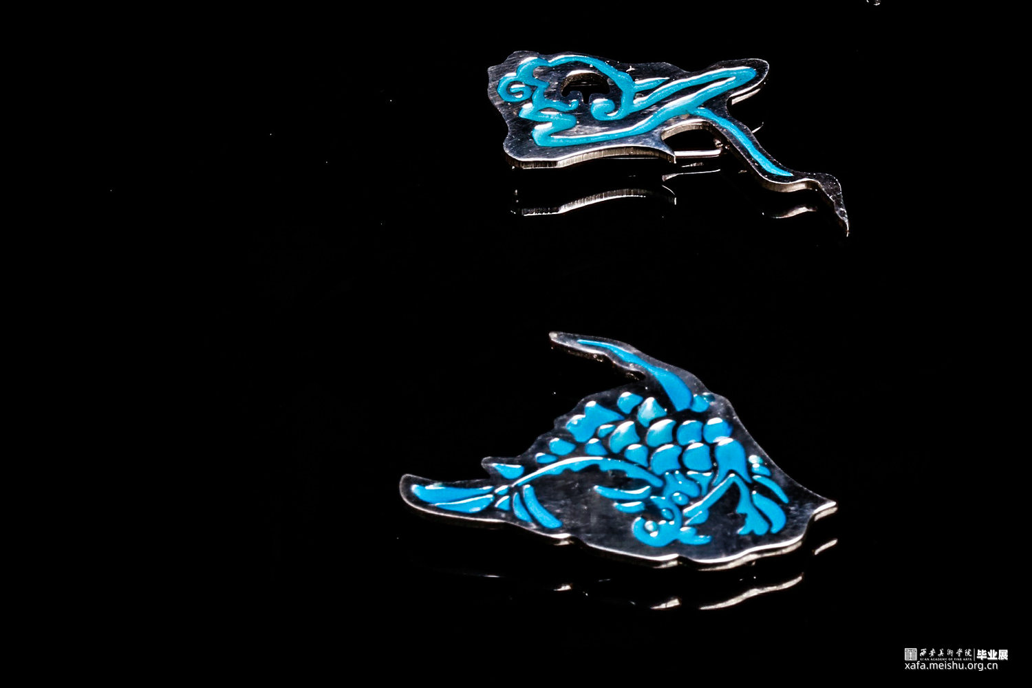 灵感来源于巴山北麓浅山谷口南沙湖,南沙湖是一个季节性的淡水湖泊,秋天的湖面就像一面银镜,风吹又打碎,涟漪泛起又显现出唐代的各种纹饰图案,或树或云,或鸟凤或游鱼,共分九份,组合起来就是南沙湖的的形体,其中纹饰表达采用镂空和珐琅工艺填充,采用空灵的云蓝色,在古典中彰显着活力。