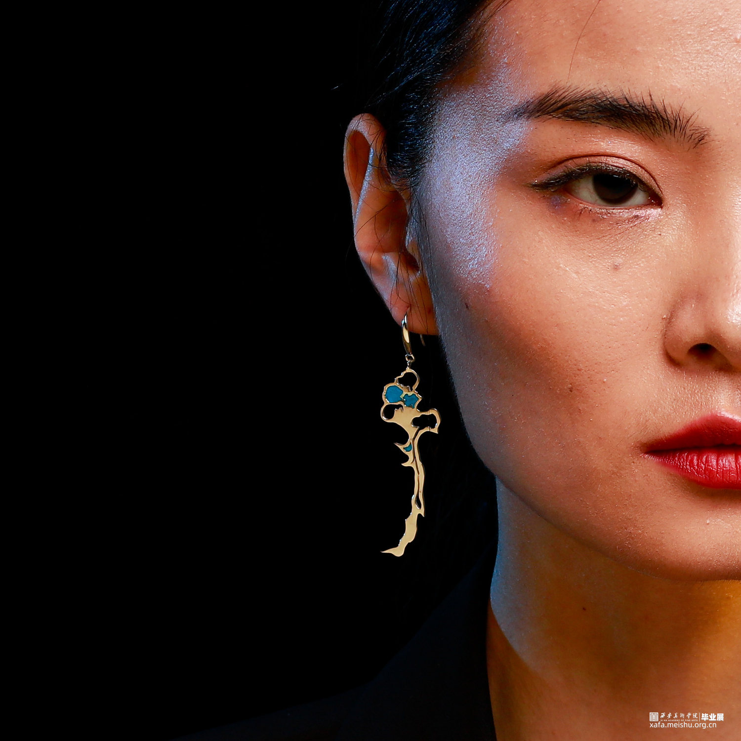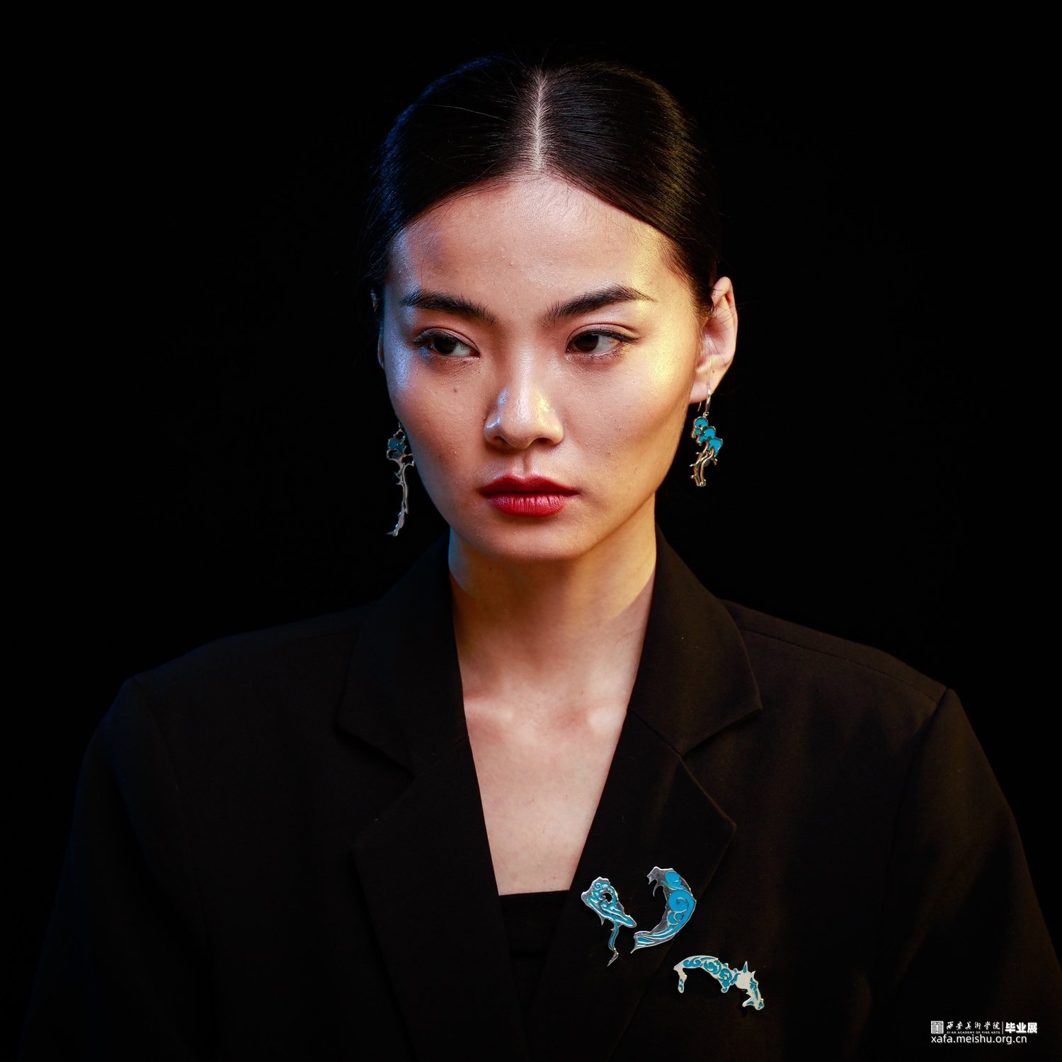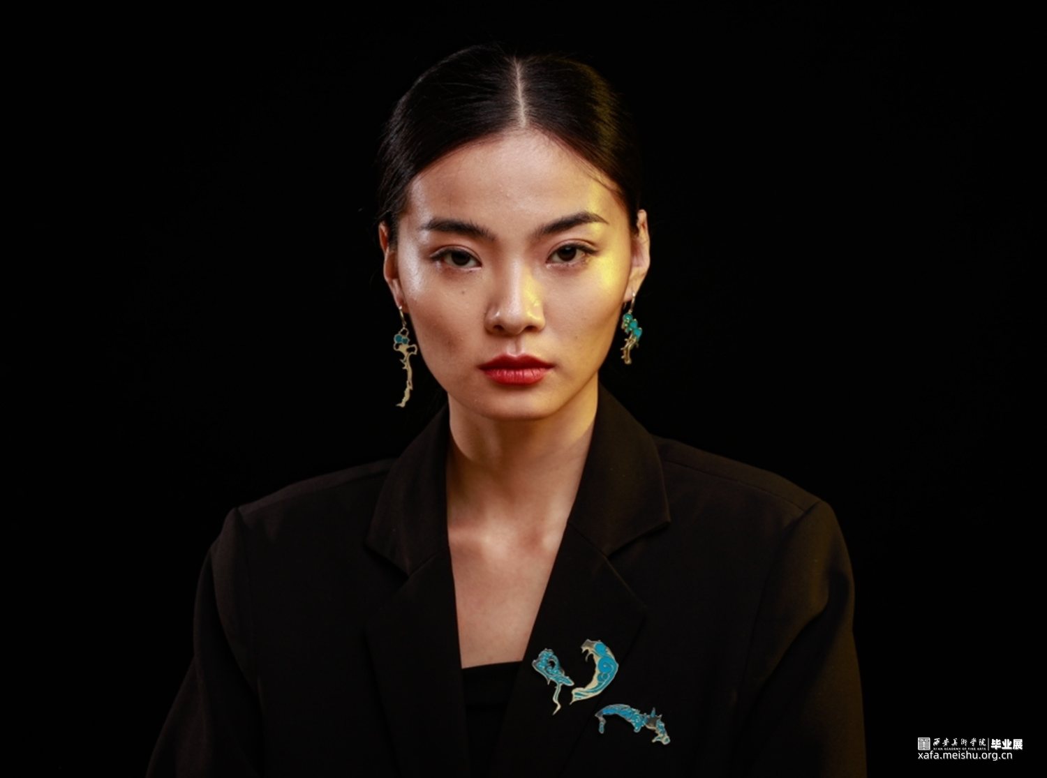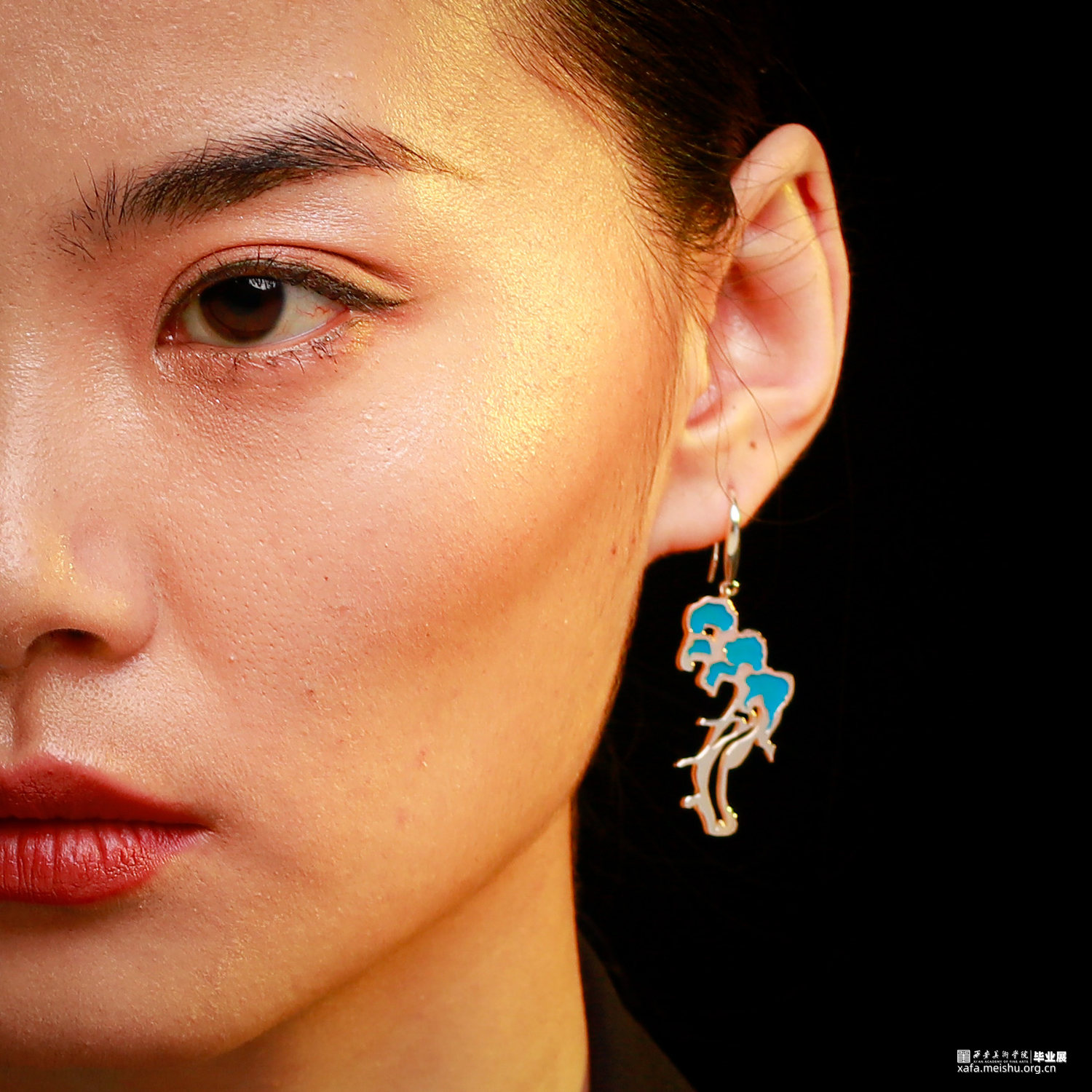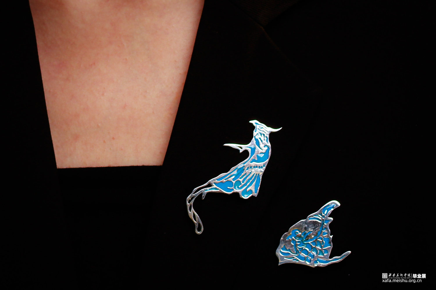 灵感来源于巴山北麓浅山谷口南沙湖,南沙湖是一个季节性的淡水湖泊,秋天的湖面就像一面银镜,风吹又打碎,涟漪泛起又显现出唐代的各种纹饰图案,或树或云,或鸟凤或游鱼,共分九份,组合起来就是南沙湖的的形体,其中纹饰表达采用镂空和珐琅工艺填充,采用空灵的云蓝色,在古典中彰显着活力。