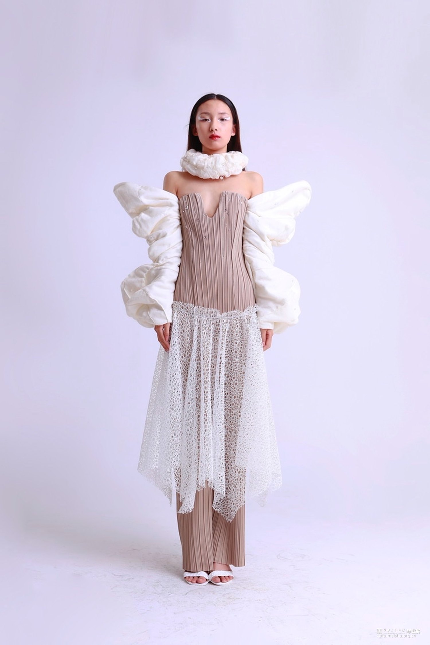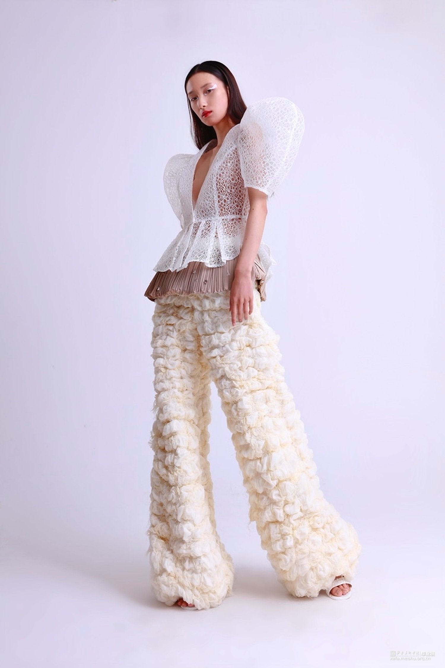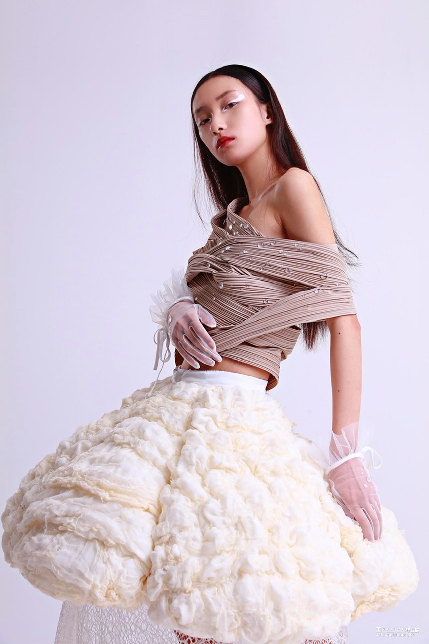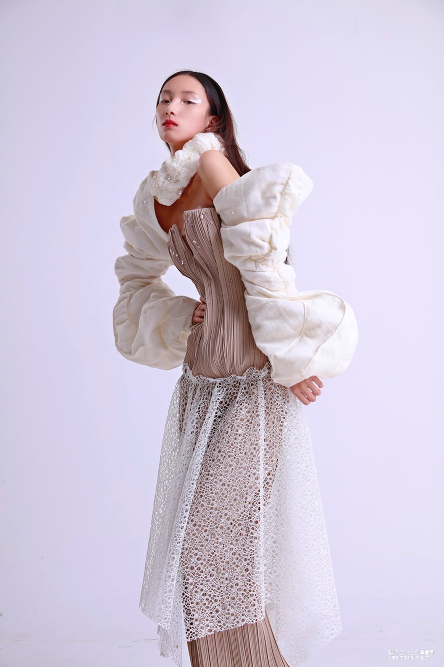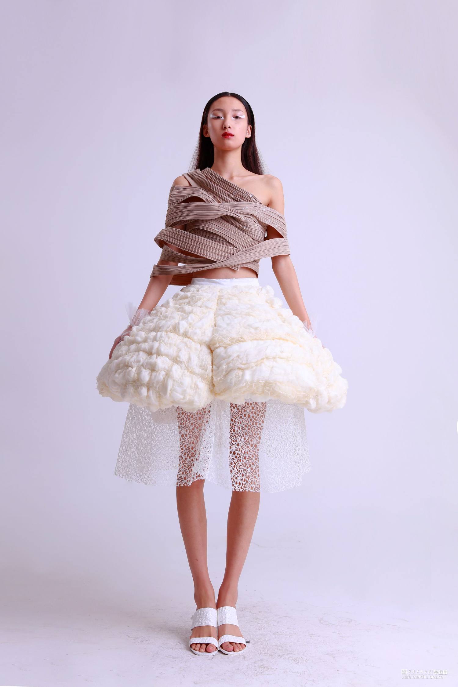 灵感来源于白描山水元素,它的画面意境、线条艺术、留白空间极具审美价值。本次作品将之与服装融合,将传统中国画元素通过服装的形式表现出来。
