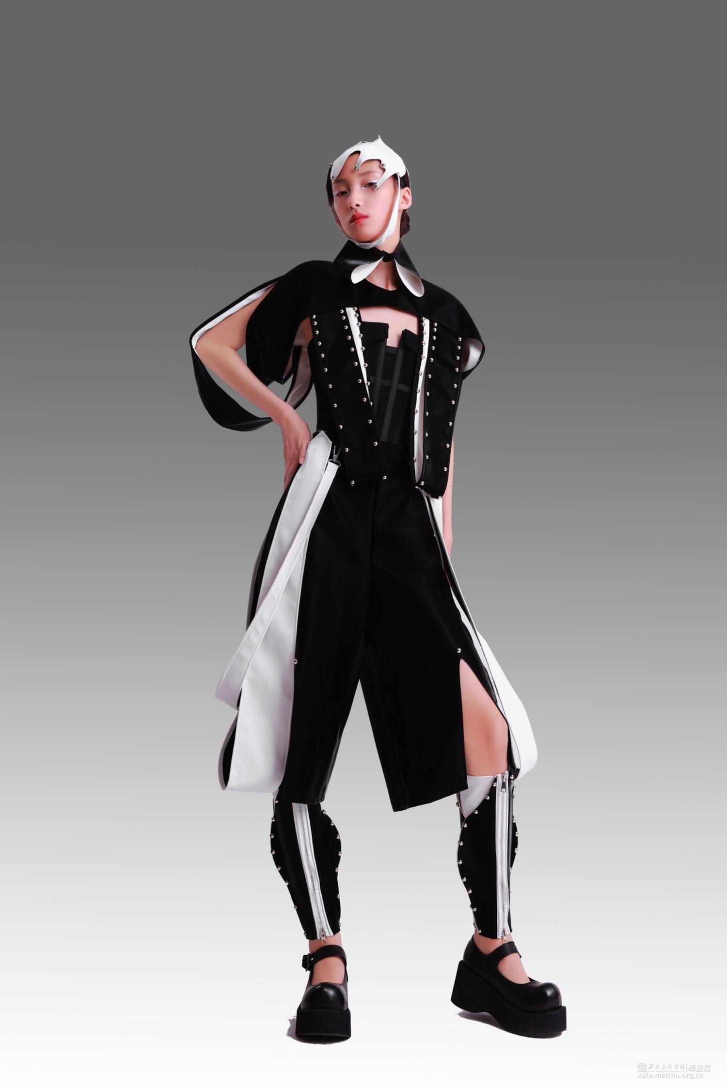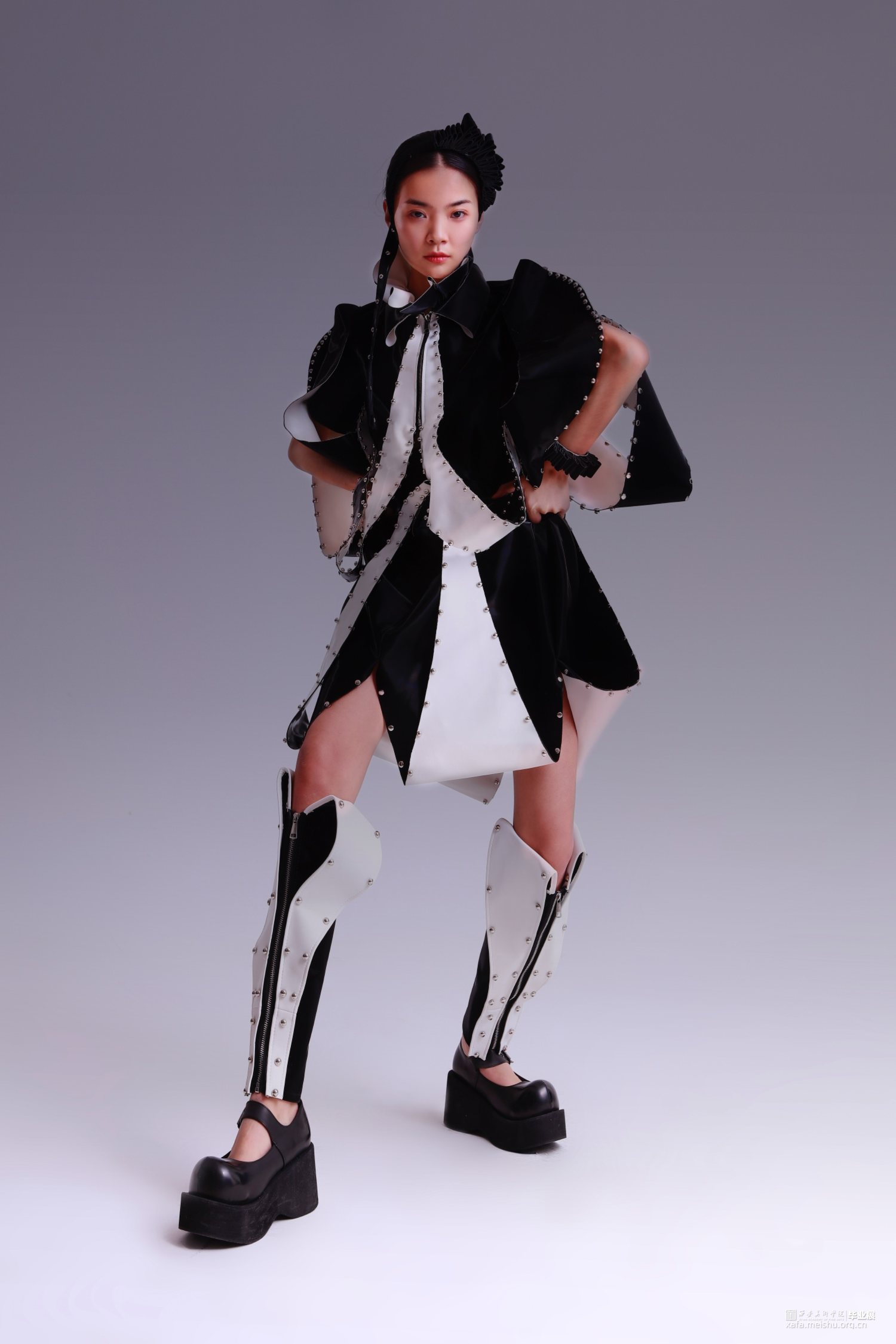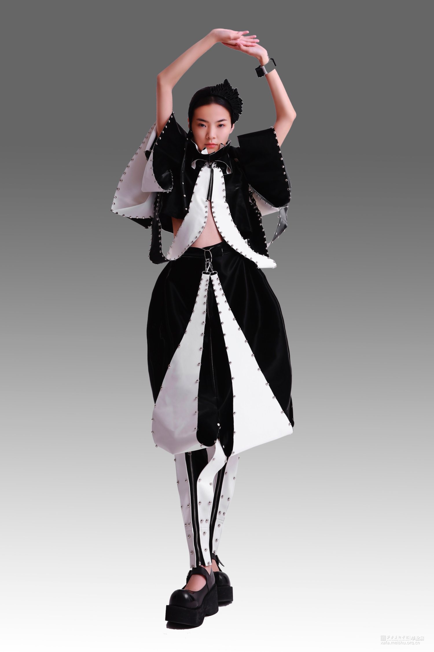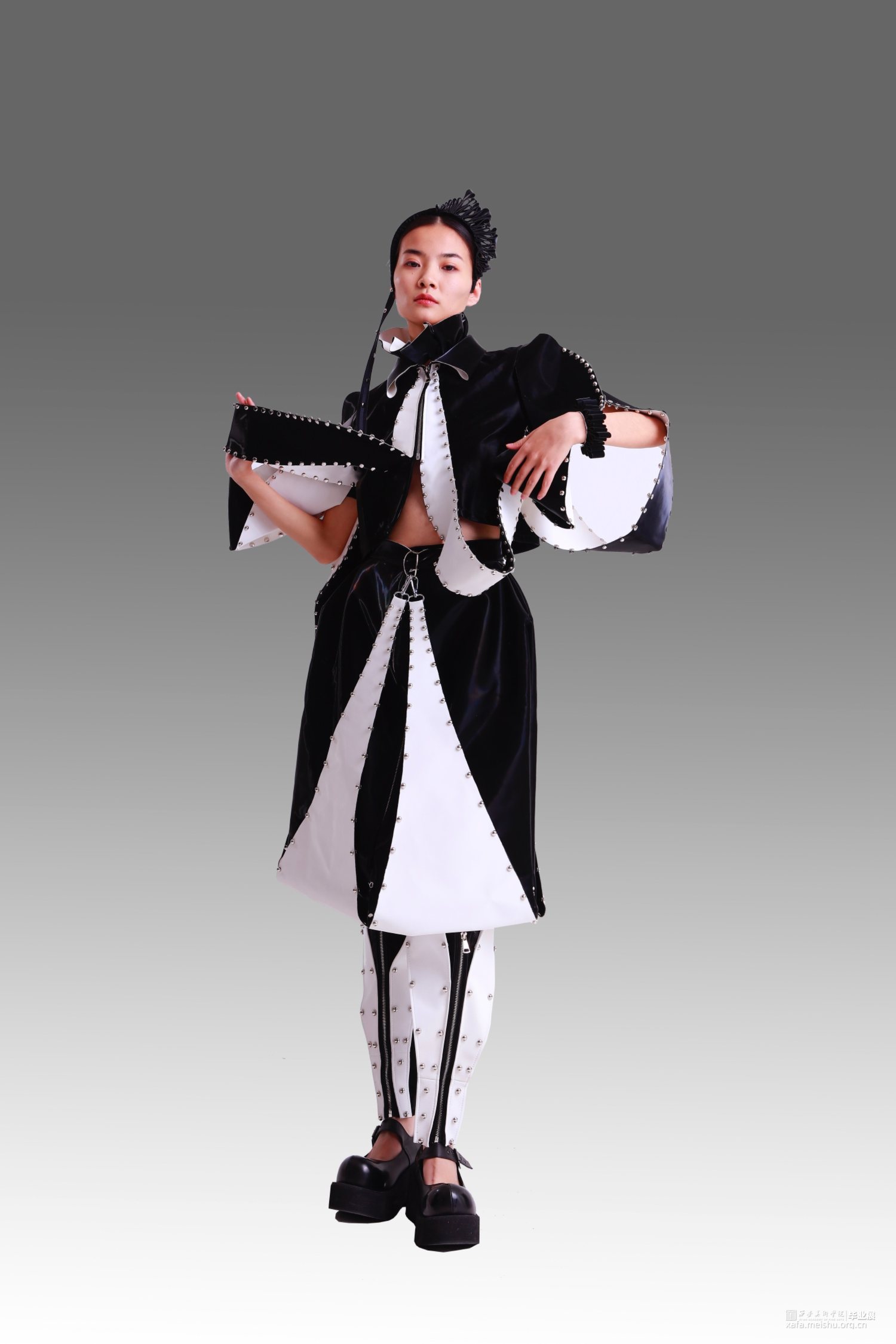 在本次毕业设计中,我将唐代胡服的廓形运用到三款服饰中,设计的中心思想为凸显和张扬女性自信魅力,无论外貌、身材如何,女性自身就是美的一种定义,女性的价值不应该由外界决定。温和的力量是女性最独特的天然优势,在设计服装时,我采用了硬挺的皮革与光感的网纱面料结合,既形成了强烈的对比,又使二者在成衣效果中达到了一种和谐的效果,象征着女性柔软的身体里蕴藏和坚实的力量,同时饰以多颗铆钉,既是点缀也是女性力量张扬的一种表现。这三款服装在设计上都借鉴了胡服缺胯衫两侧开叉的造型以及松垮的条纹裤的裤型,在行动上较为便利,同时沿
