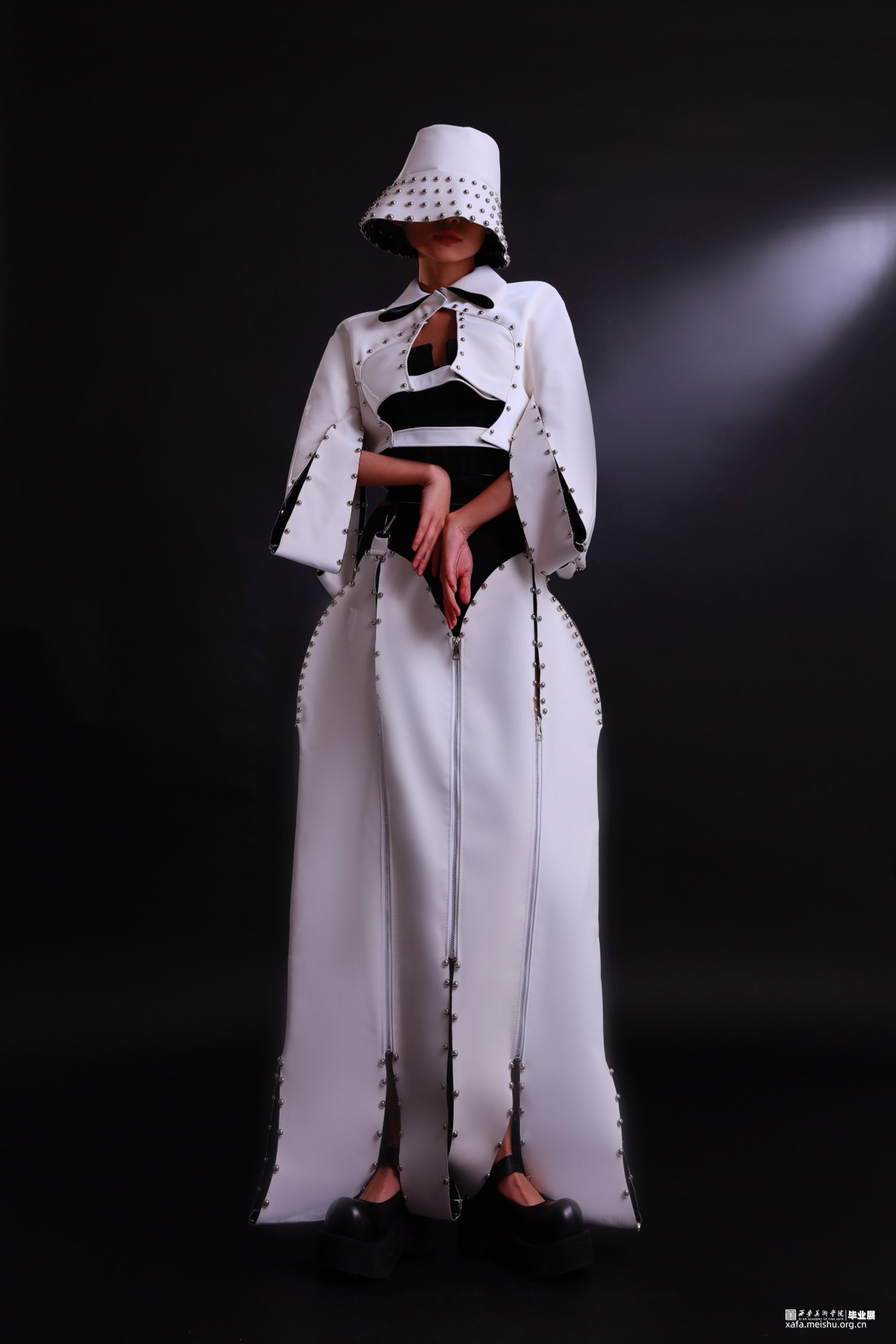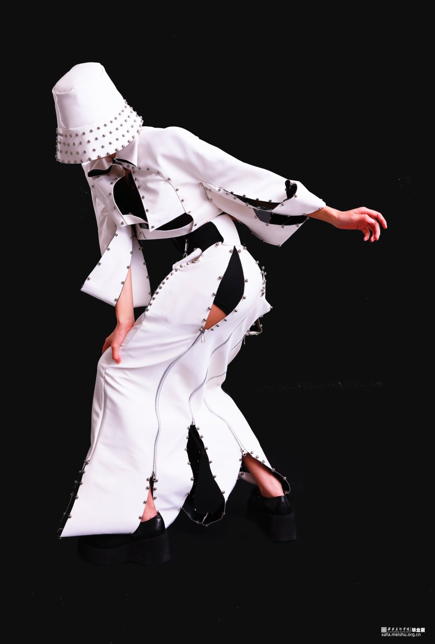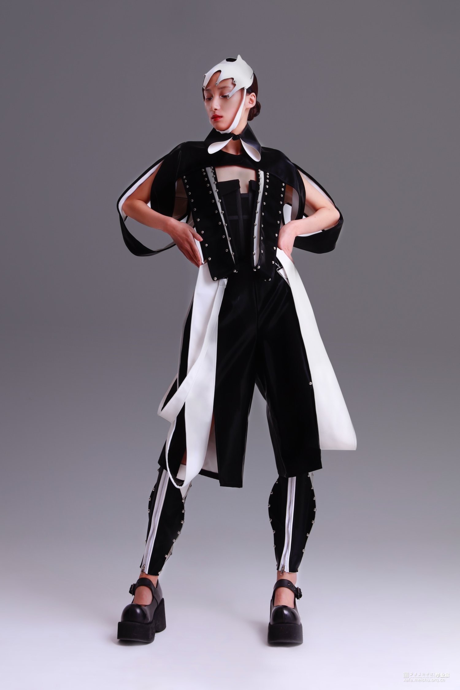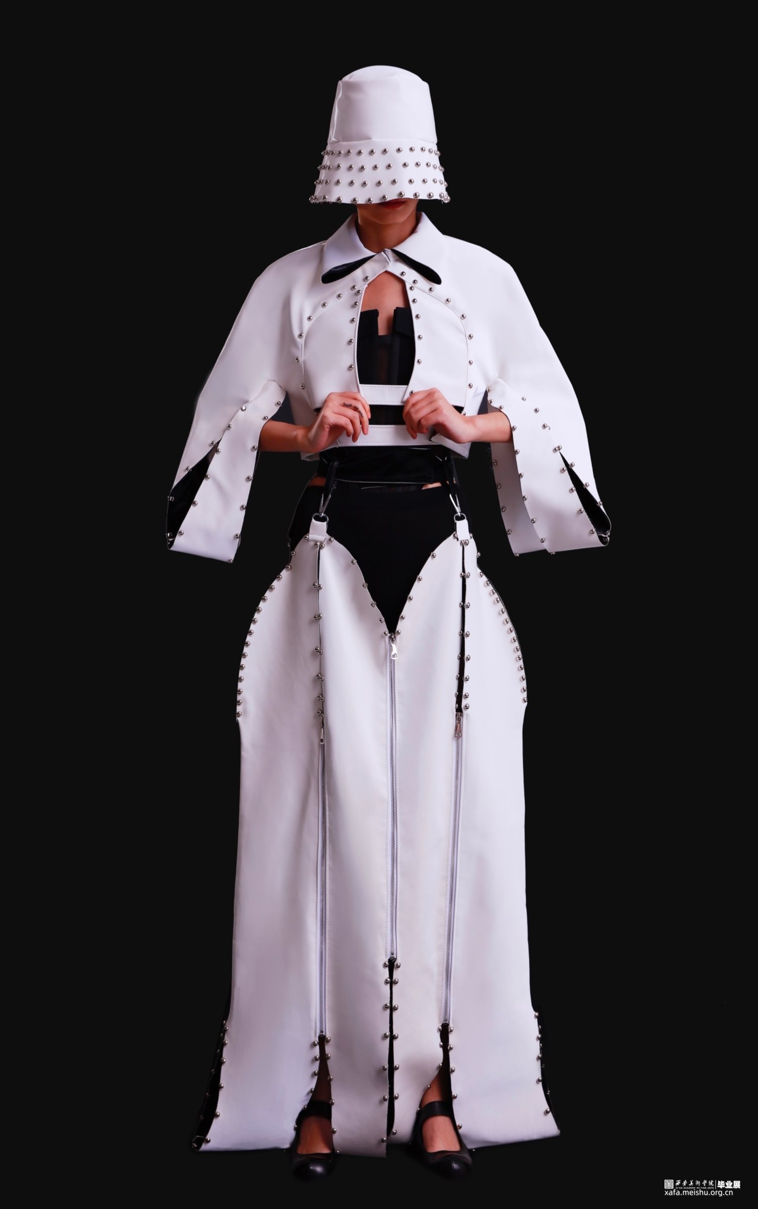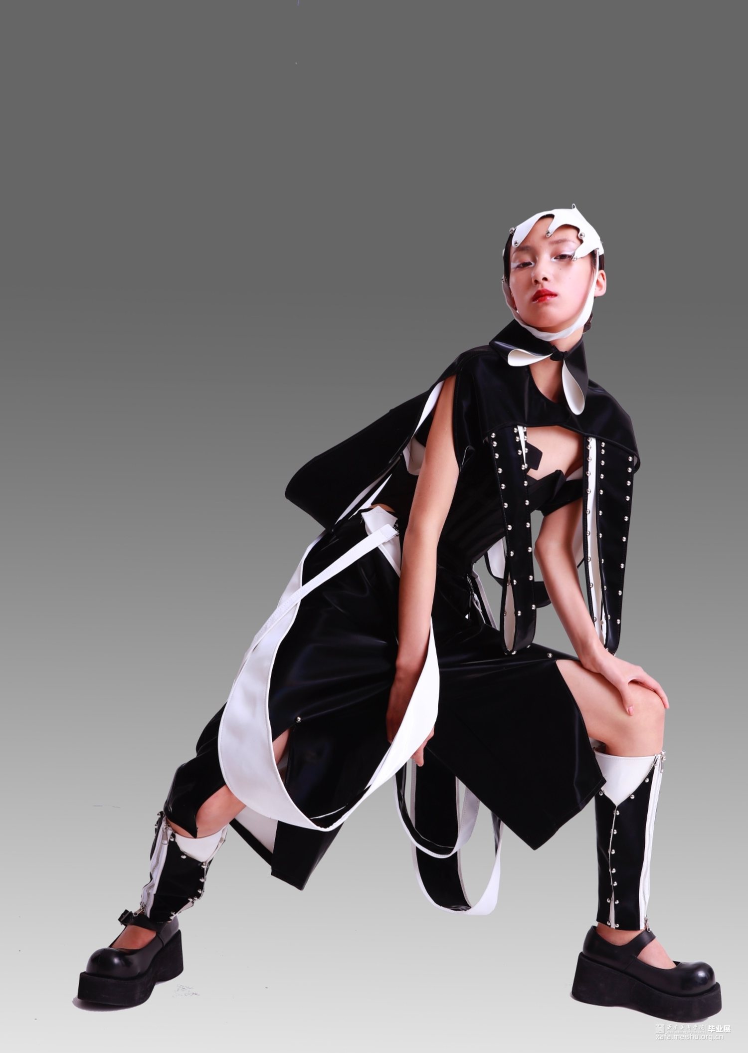 在本次毕业设计中,我将唐代胡服的廓形运用到三款服饰中,设计的中心思想为凸显和张扬女性自信魅力,无论外貌、身材如何,女性自身就是美的一种定义,女性的价值不应该由外界决定。温和的力量是女性最独特的天然优势,在设计服装时,我采用了硬挺的皮革与光感的网纱面料结合,既形成了强烈的对比,又使二者在成衣效果中达到了一种和谐的效果,象征着女性柔软的身体里蕴藏和坚实的力量,同时饰以多颗铆钉,既是点缀也是女性力量张扬的一种表现。这三款服装在设计上都借鉴了胡服缺胯衫两侧开叉的造型以及松垮的条纹裤的裤型,在行动上较为便利,同时沿