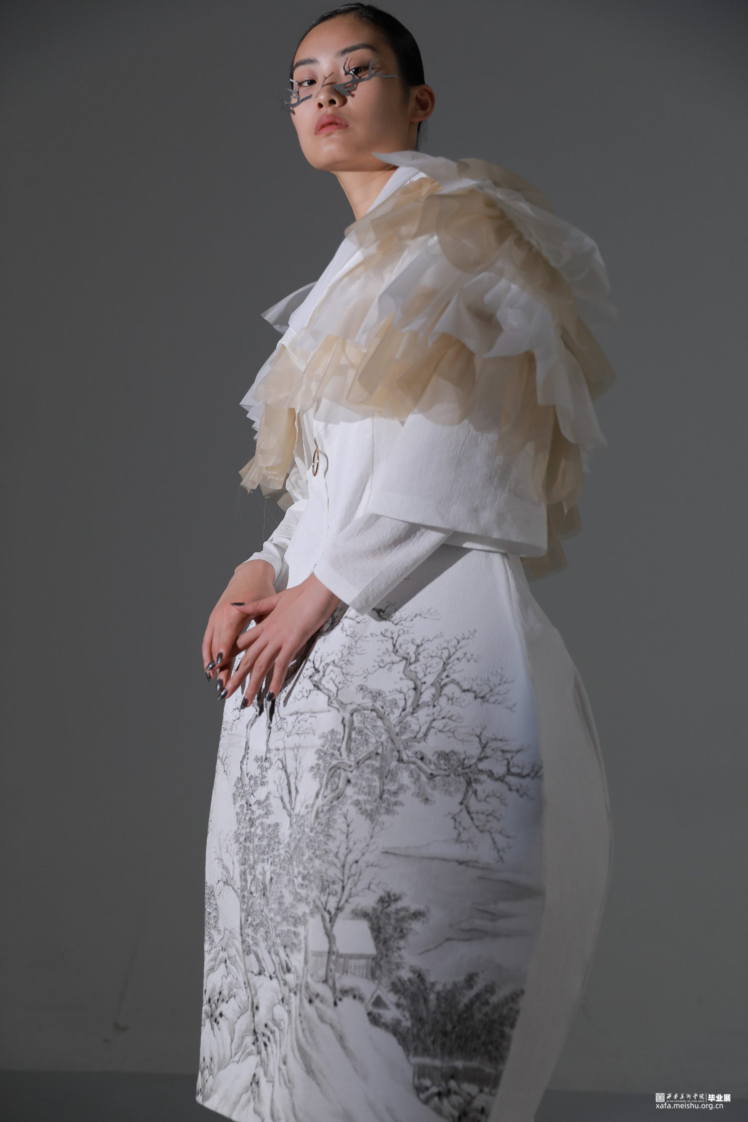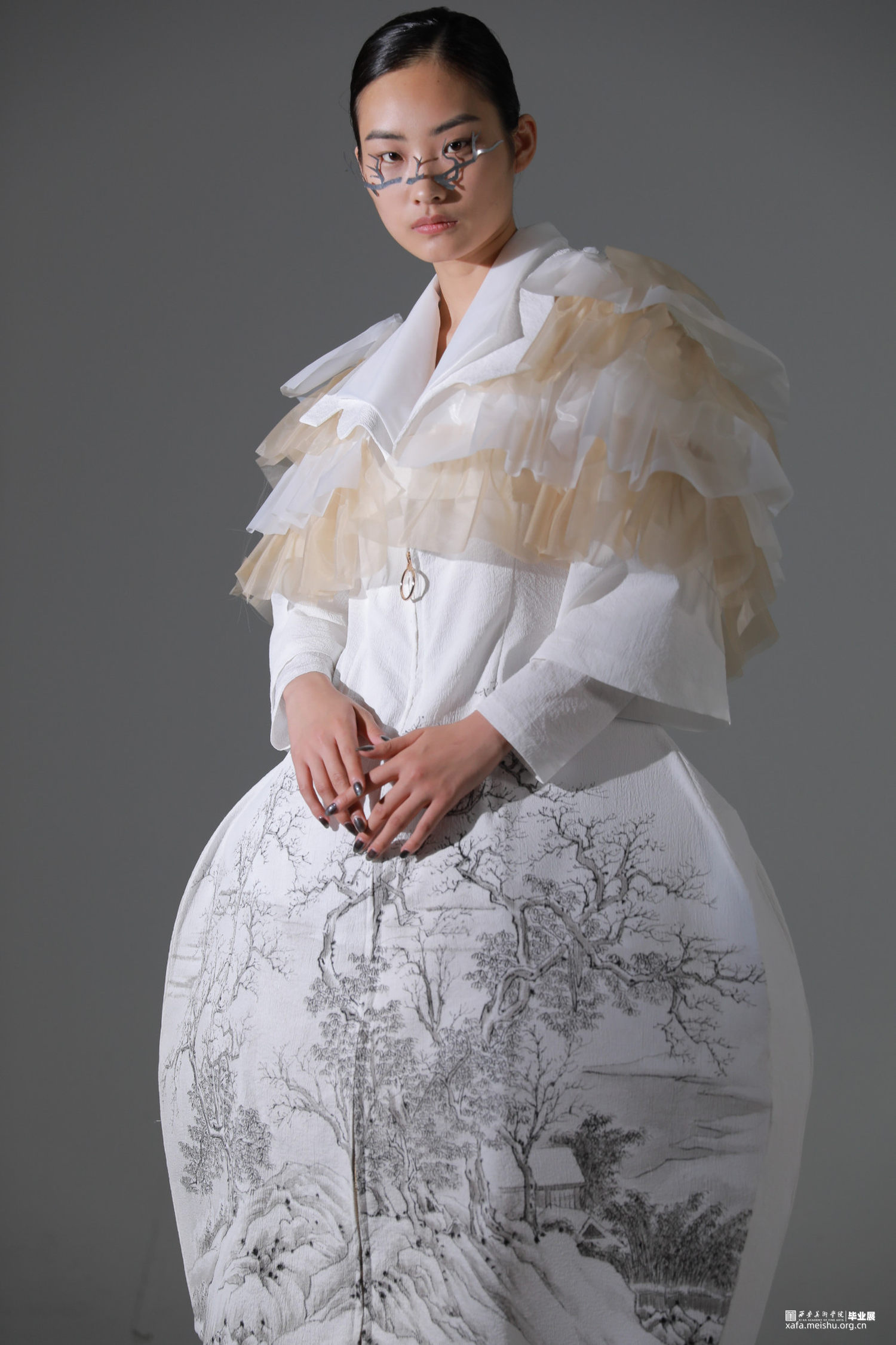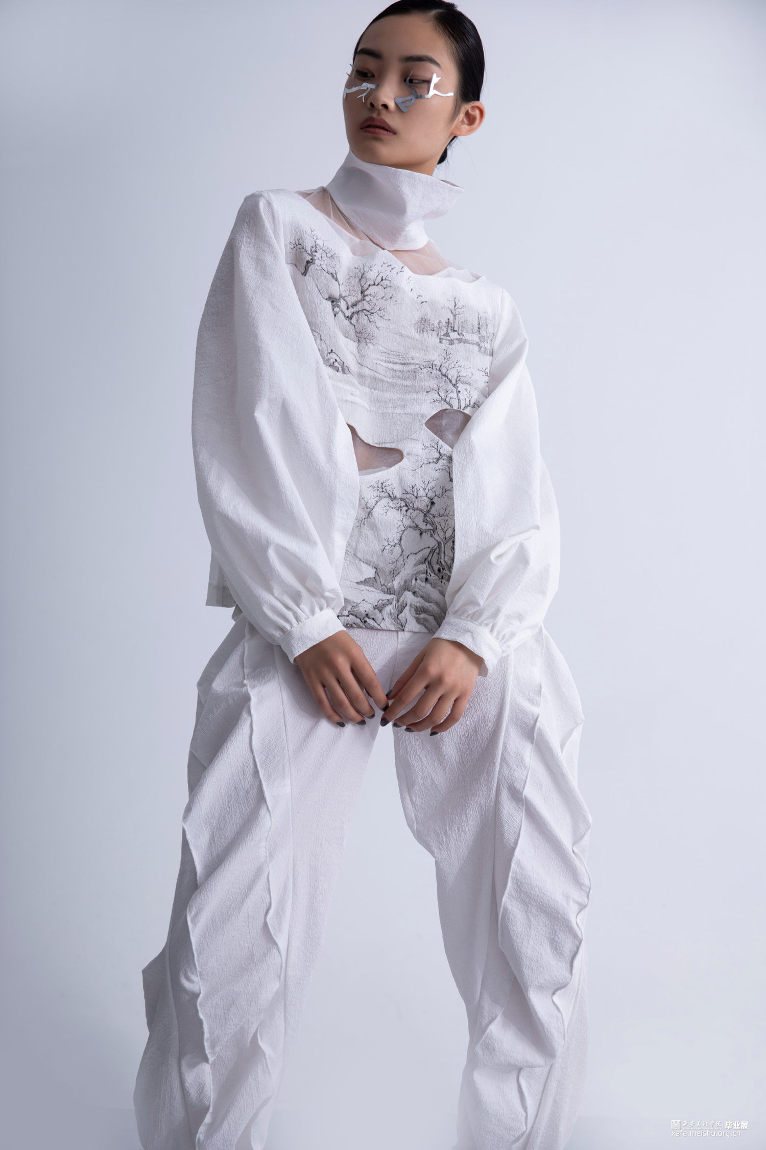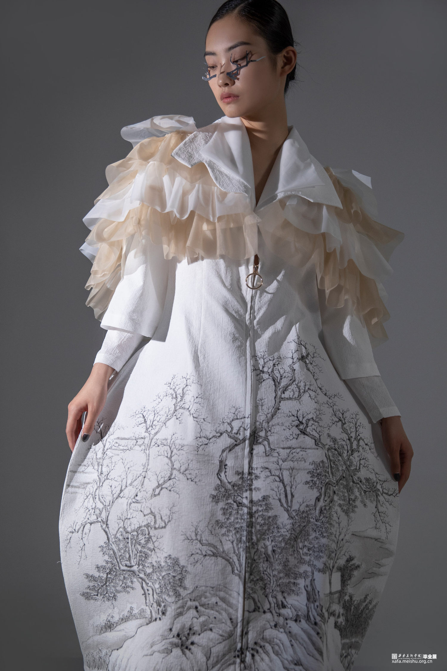《果然城市有山林》作品将文人山水画之祖一唐代王维《江干雪霁图》融入服装设计作品中,并对作品本身进行一系列的艺术观照,哲学观照和生命观照,当下世界正处于后疫情时代,经历了动荡的疫情时期,人们对于未来的生活会产生不安与迷茫的情绪。因此,本系列作品试图重新构建当代服装设计与传统山水画之间一脉相承的联系,以“疏可走马,密不透风”“知白守黑”等具有民族传统审美特征的审美方式进行设计,着重从文人山水画中的意境传达,笔墨表现入手,提炼出文人山水画中的山水画造境规律与情感比兴方法,重构山水画中的物与服装中的结构进行巧妙融合,利用线条为主的表现手法及观照物象本身的自然属性,表达“天人合一”的自然态度,反躬修己的文人情怀,传递平淡,朴素,自然的生活状态,以期对处于不确定状态的人们进行心灵上的安抚和生命的治愈。