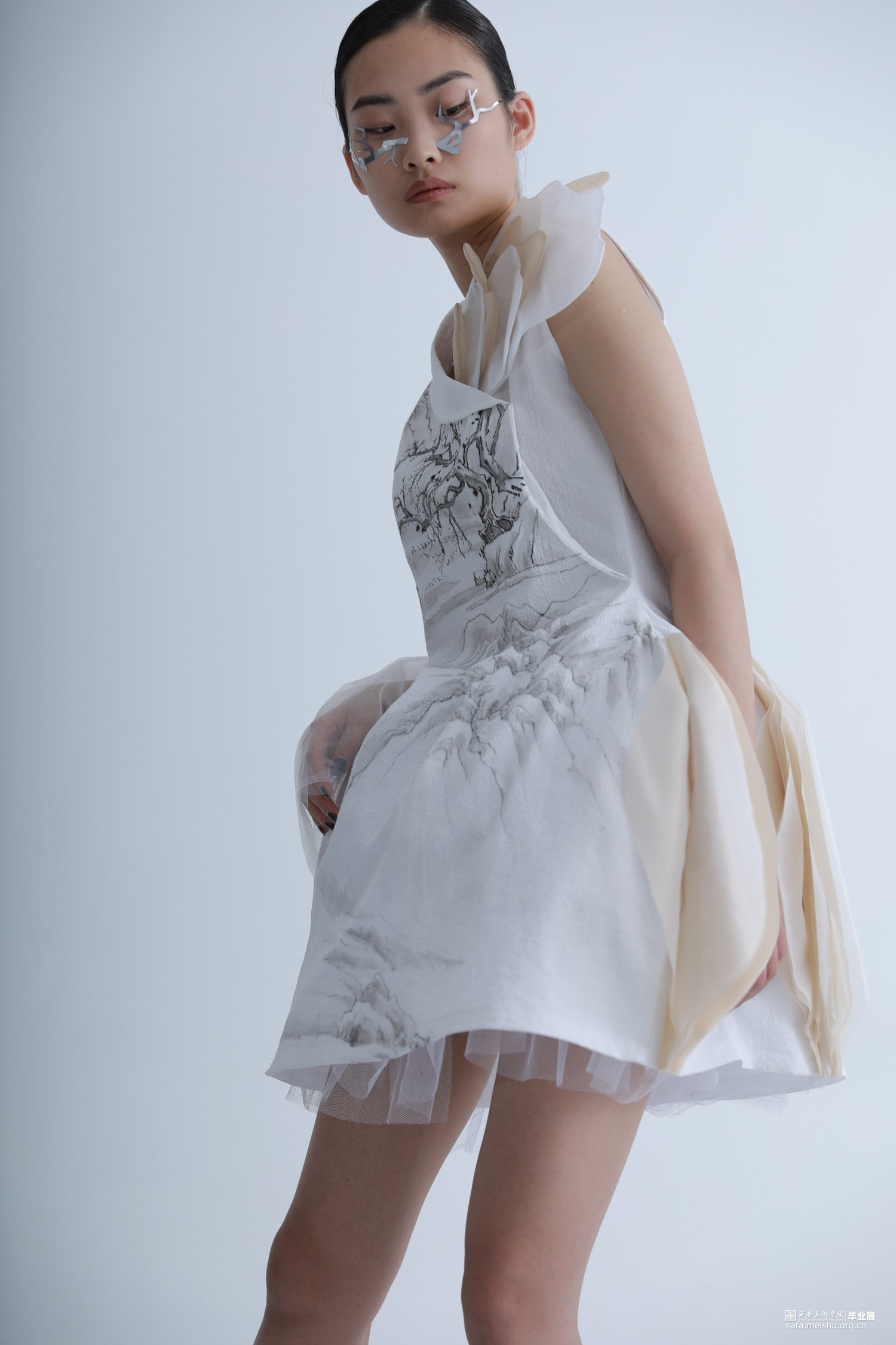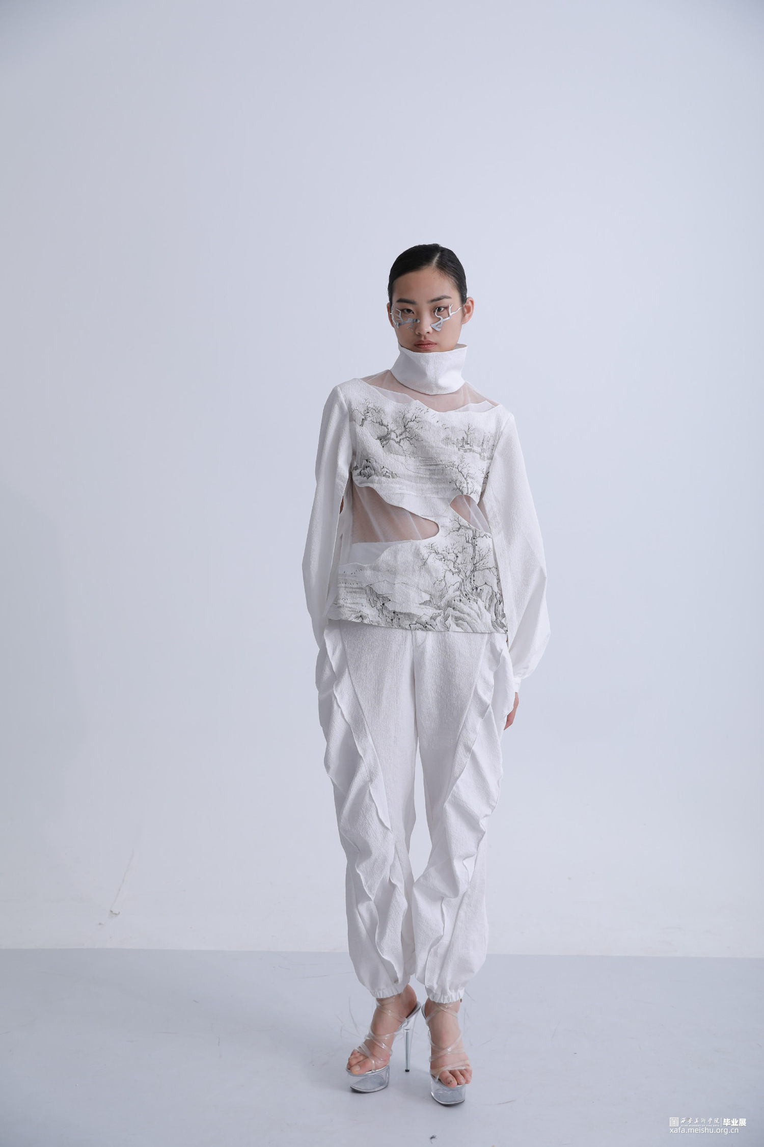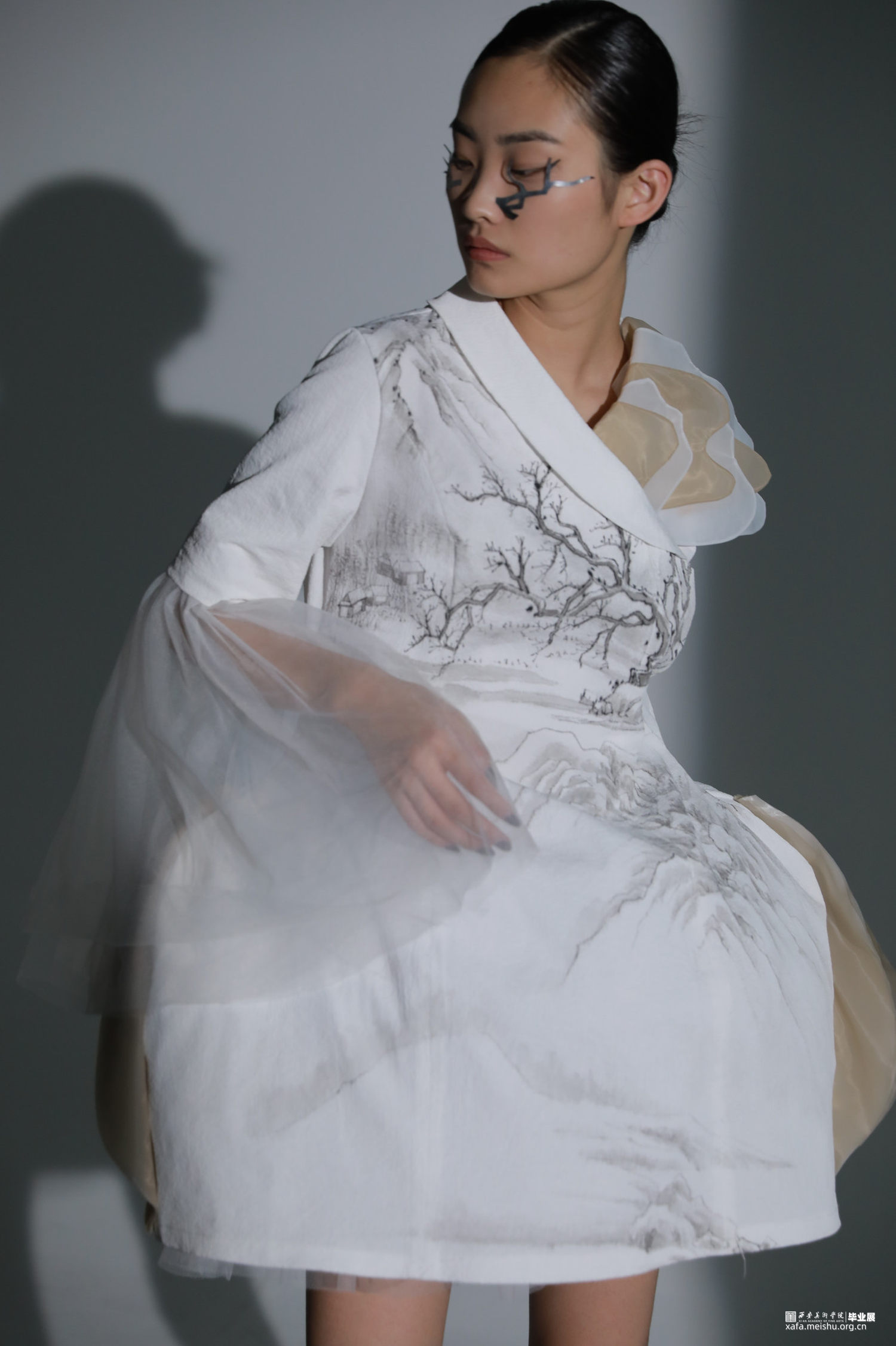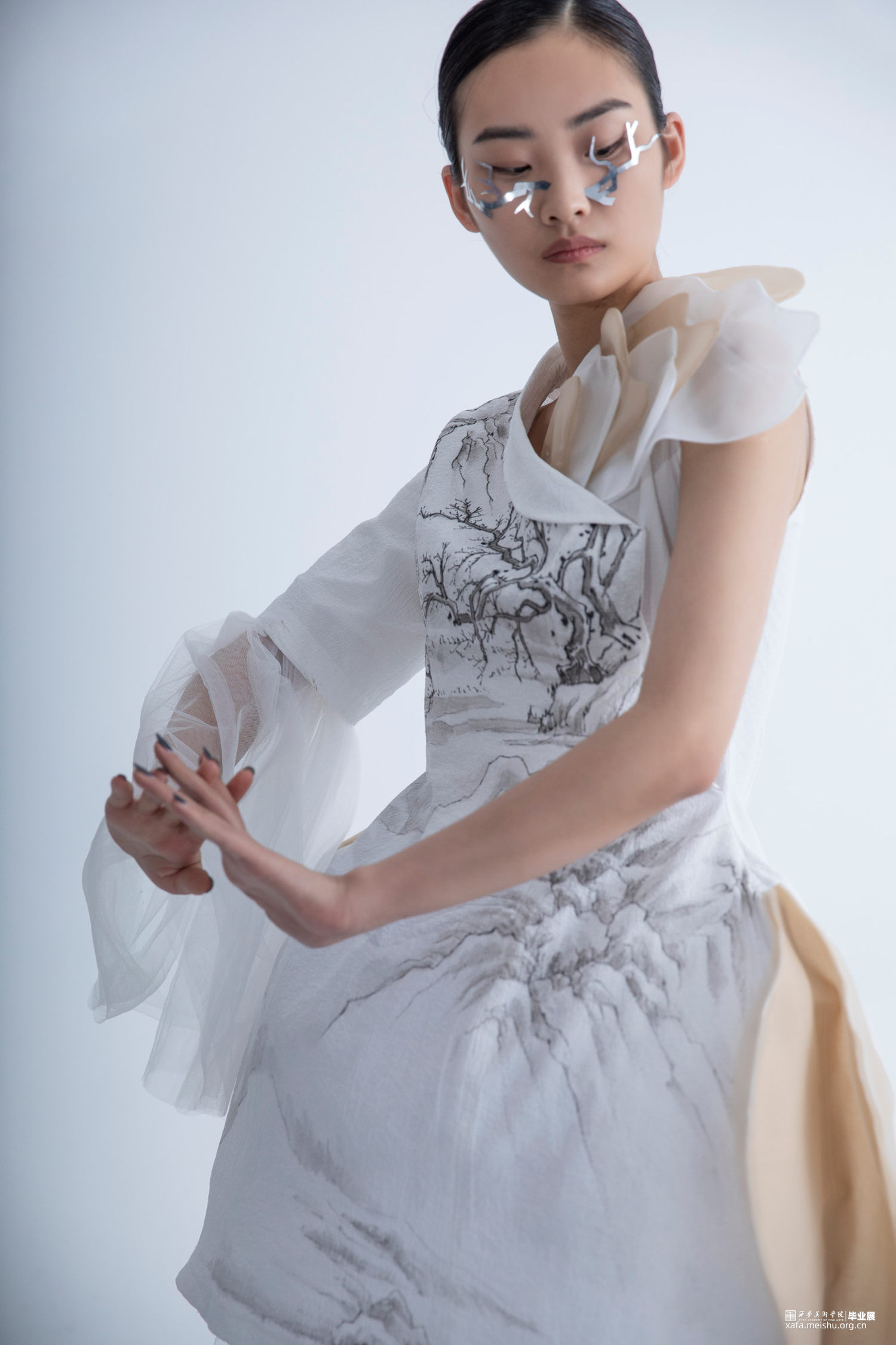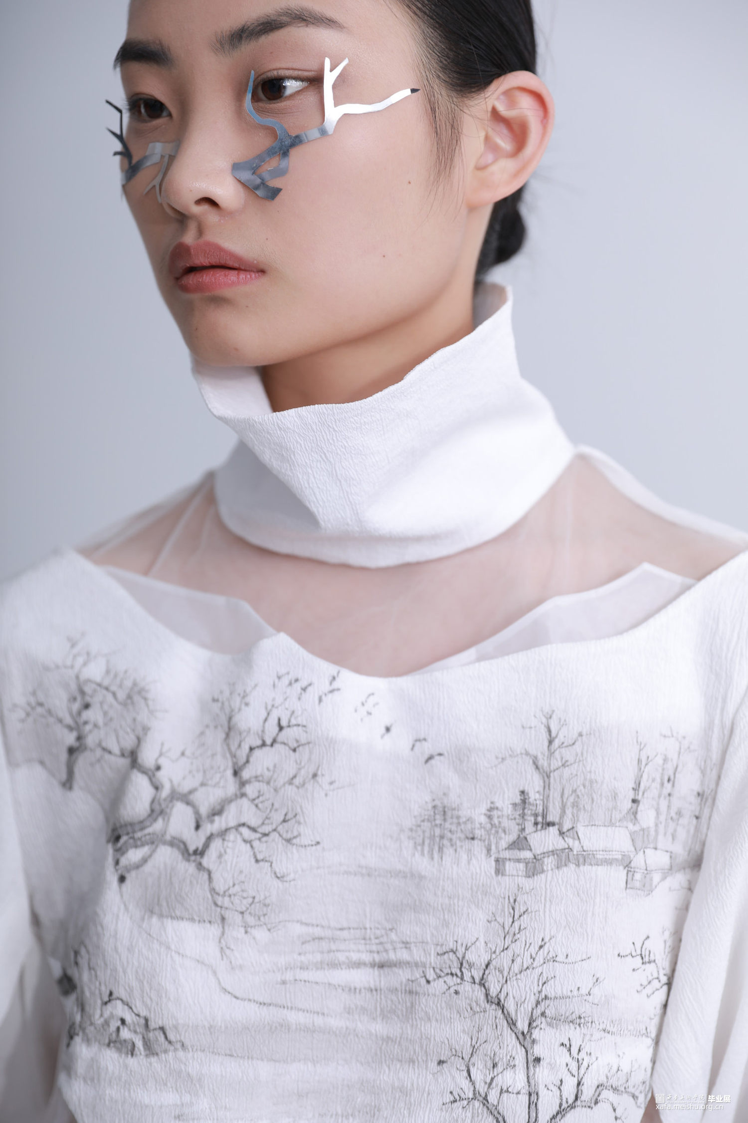 《果然城市有山林》作品将文人山水画之祖一唐代王维《江干雪霁图》融入服装设计作品中,并对作品本身进行一系列的艺术观照,哲学观照和生命观照,当下世界正处于后疫情时代,经历了动荡的疫情时期,人们对于未来的生活会产生不安与迷茫的情绪。因此,本系列作品试图重新构建当代服装设计与传统山水画之间一脉相承的联系,以“疏可走马,密不透风”“知白守黑”等具有民族传统审美特征的审美方式进行设计,着重从文人山水画中的意境传达,笔墨表现入手,提炼出文人山水画中的山水画造境规律与情感比兴方法,重构山水画中的物与服装中的结构进行巧妙融合,利用线条为主的表现手法及观照物象本身的自然属性,表达“天人合一”的自然态度,反躬修己的文人情怀,传递平淡,朴素,自然的生活状态,以期对处于不确定状态的人们进行心灵上的安抚和生命的治愈。