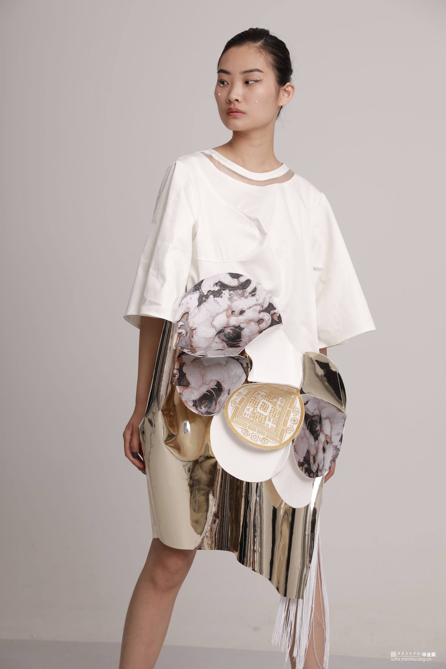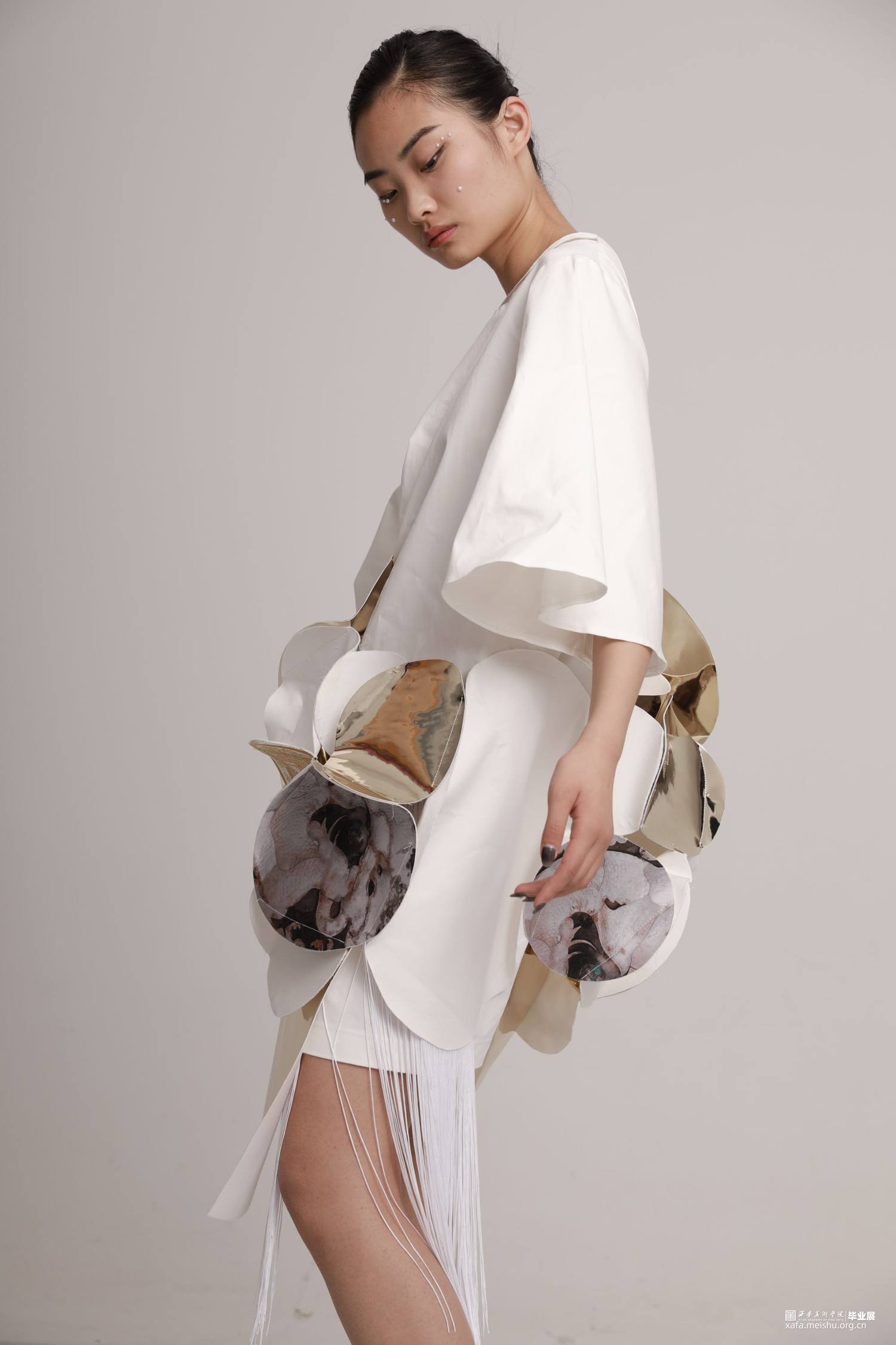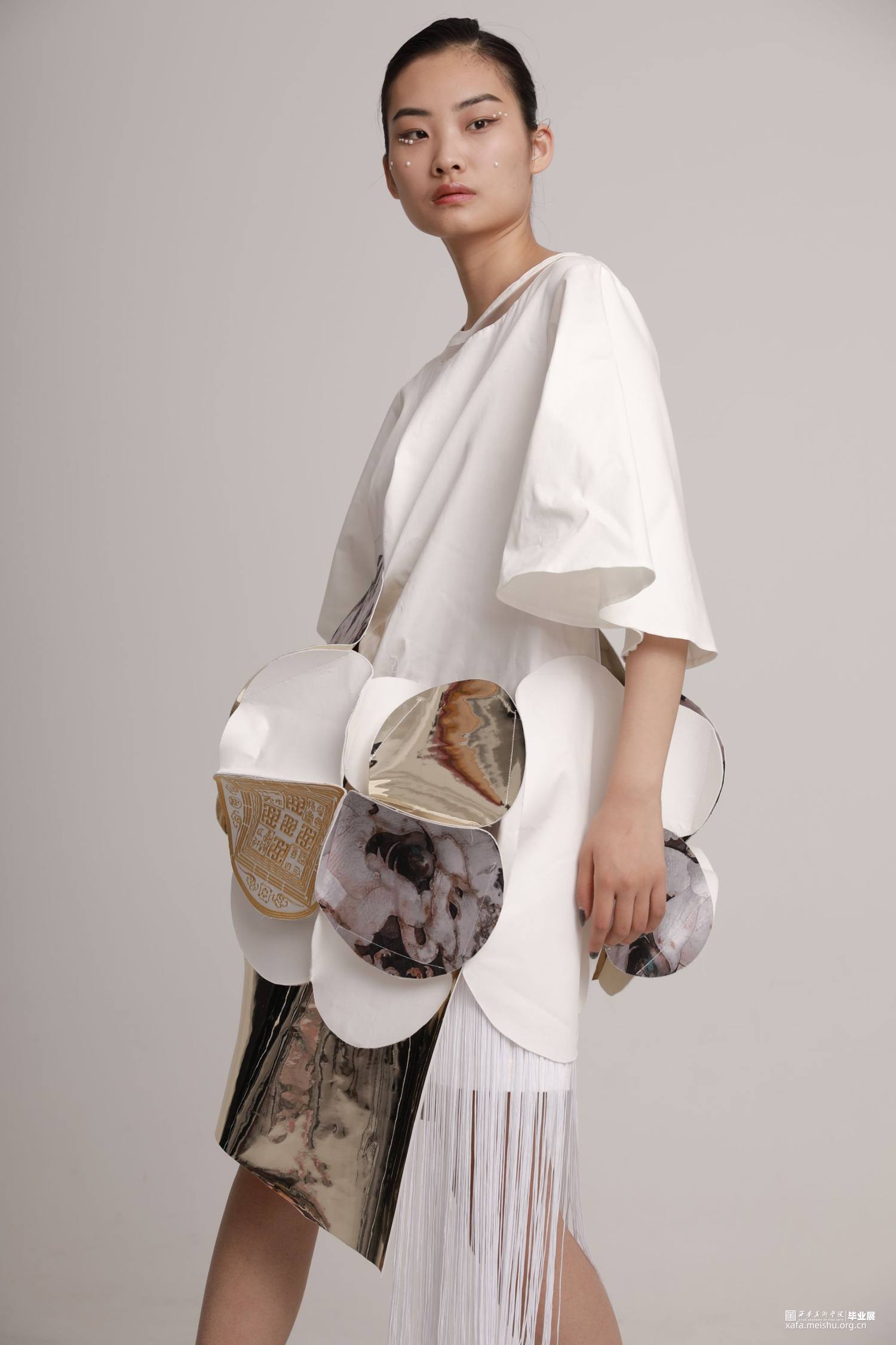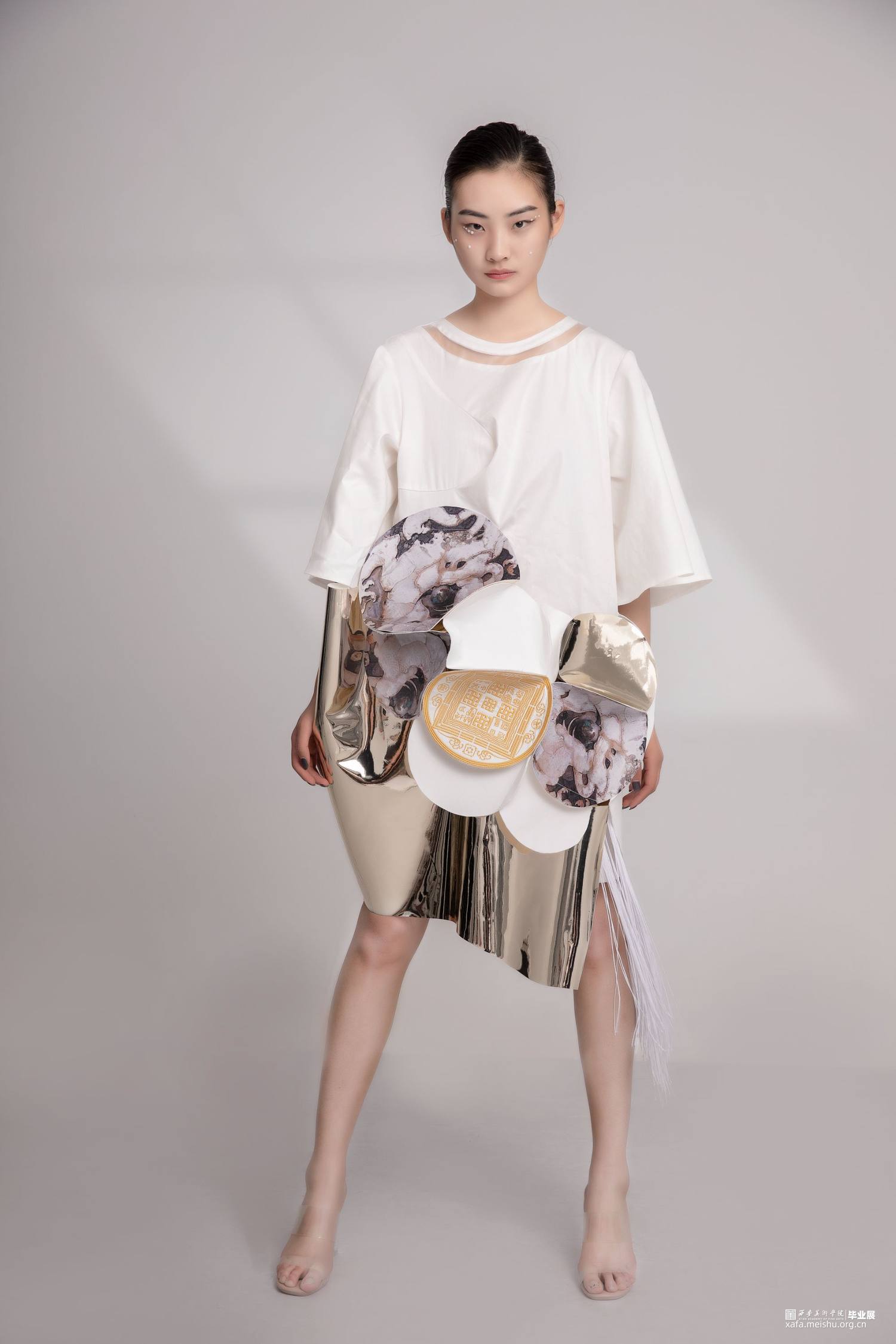 以铜为鉴,可正衣寇;以古为鉴,可知兴替;以人为鉴,可明得失。自古以来,“镜”的意象便在中国文化的长河频频出现。在中国传统本土宗教——道教中,更是被赋予了不同的意义。这系列作品通过对于唐代道教纹样铜镜的分析与研究,将了唐代道教纹样铜镜元素应用到现代创意礼服设计中,通过实践探索将铜镜纹样和廓形与礼服设计相结合,利用礼服主流时尚的造型和搭配衬托传统纹样的艺术魅力,体现传统文化之美。