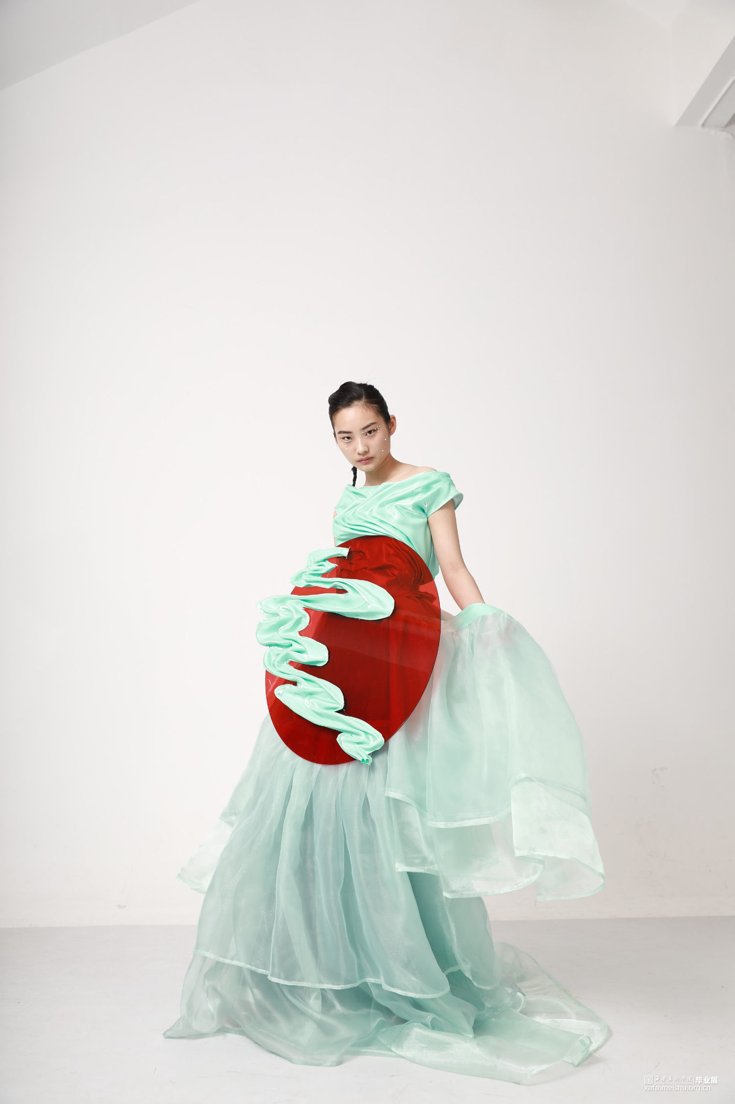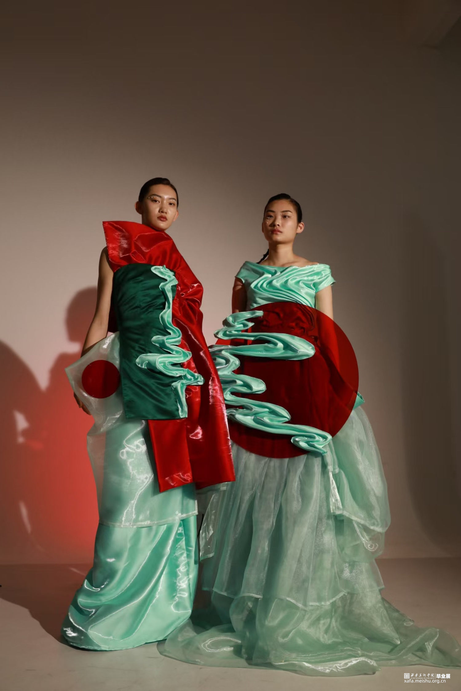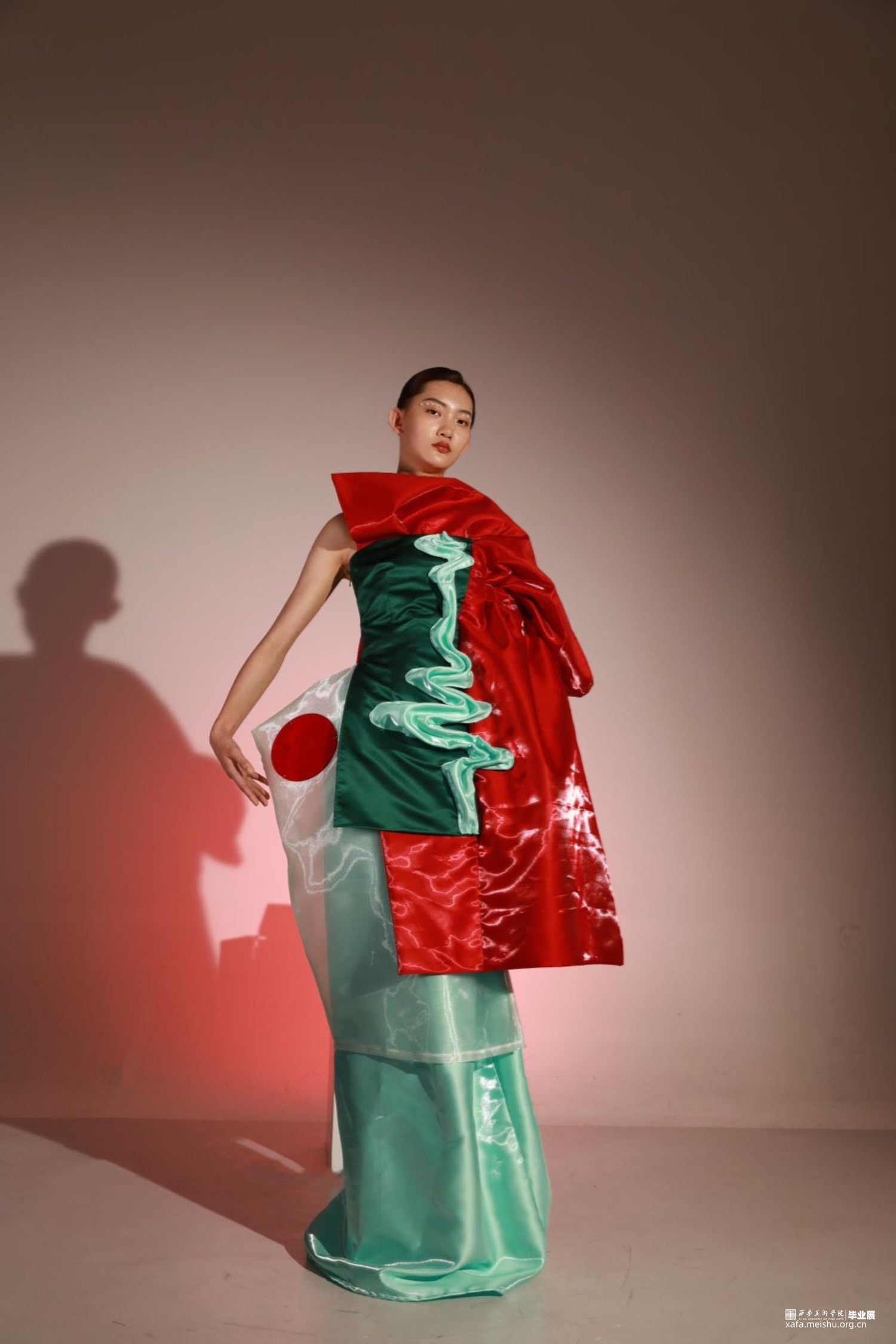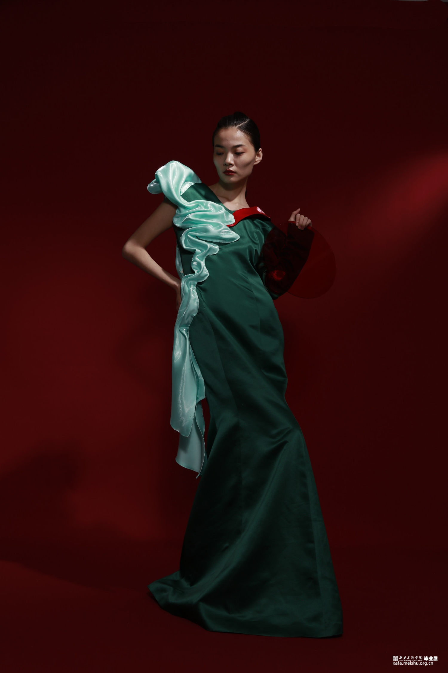 此次做毕设,氛围感就是流畅的、开阔的,以“少”“留白”作为元素和廓形,保持整体视觉上的简洁,以求诗中审美意境的表达。色彩的运用上,采用轻快明亮的松石绿、孔雀绿,搭配正红色。那红色是大漠中的落日,绿色是风吹过沙丘的痕迹,对比色的运用碰撞出强烈视觉冲击力,亦如唐朝盛世时历史上浓墨重彩的那一笔颜色。