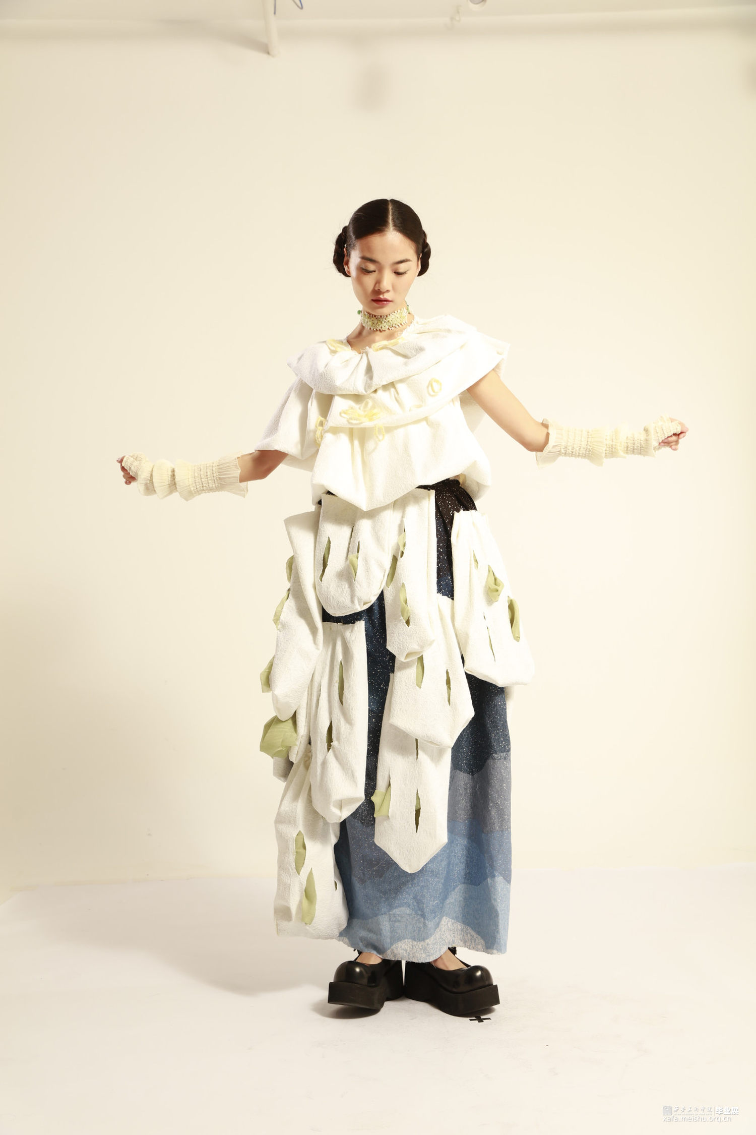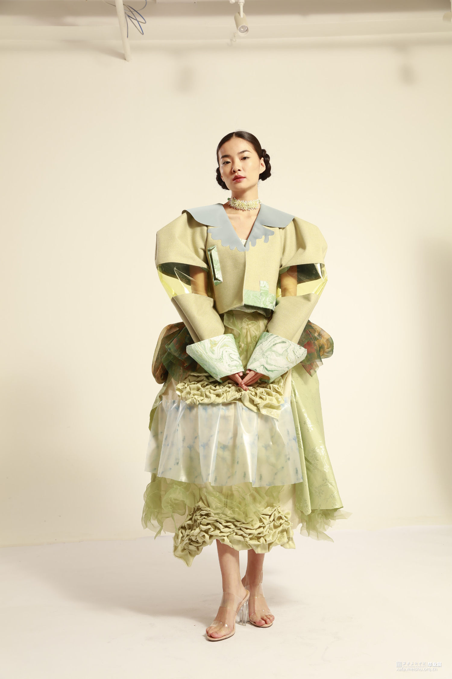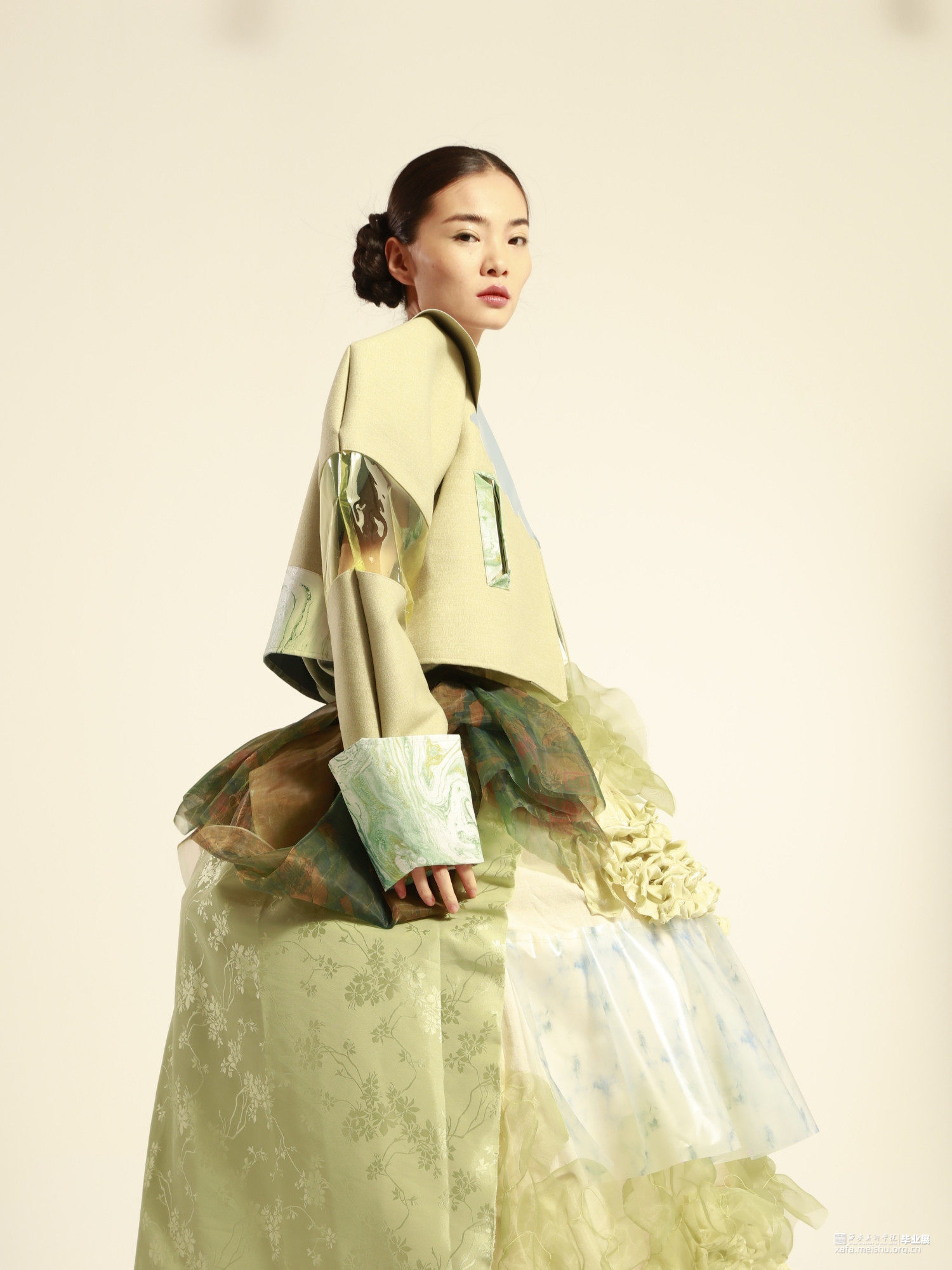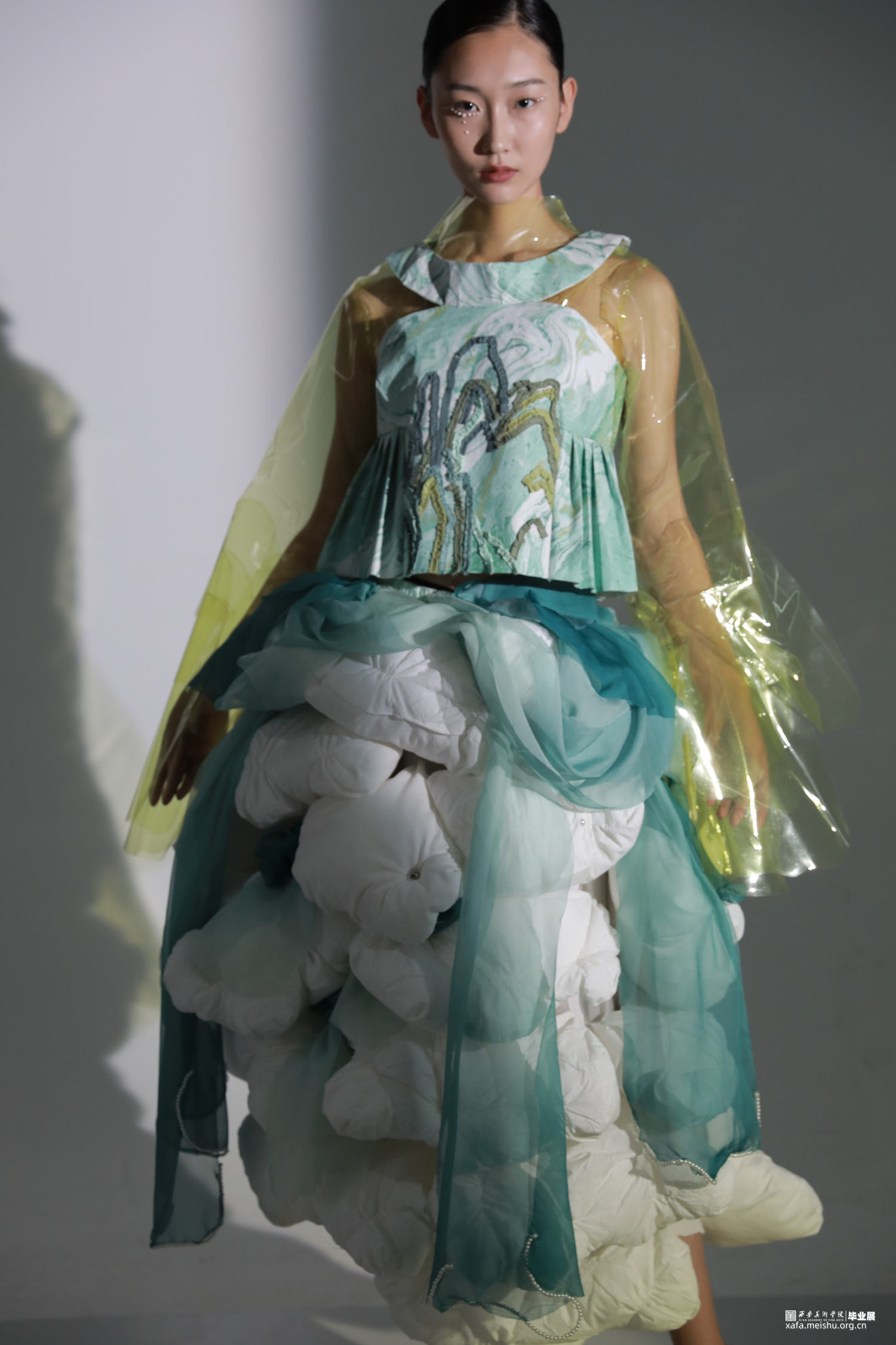 唐代青绿山水画作为山水画的一种是非常有必要研究分析的传统文化,它在古代绘画艺术上占有重要地位,本创作作品主要传达了唐代传统青绿山水画的审美意境,对提取的元素进行传承与创新,并体现与创意女装的融合和创新运用。
