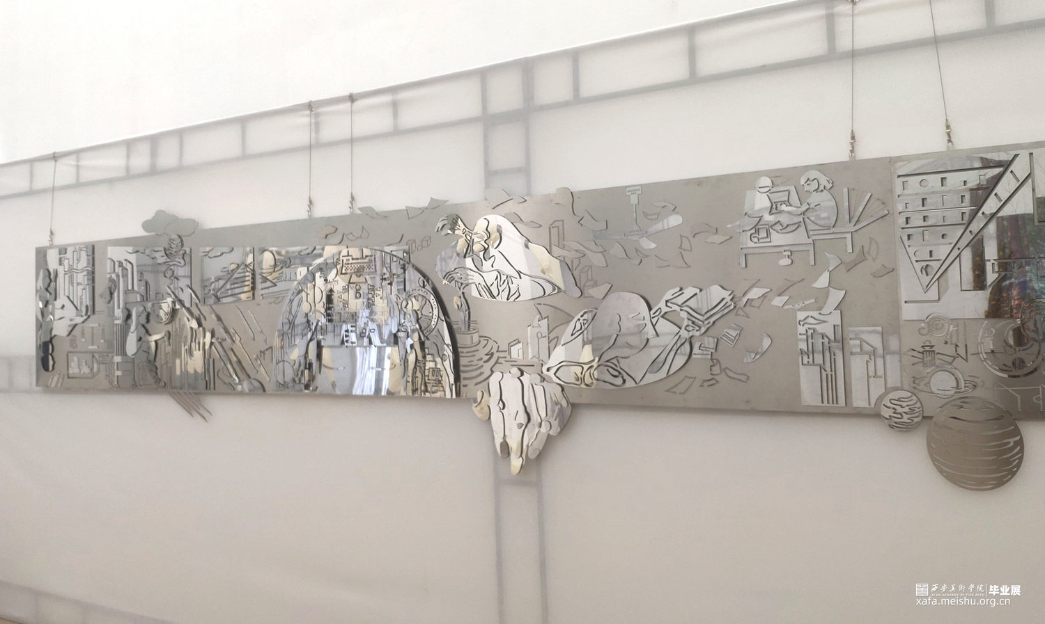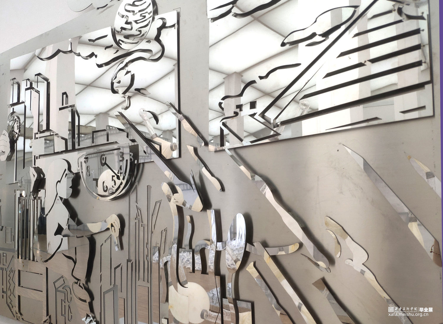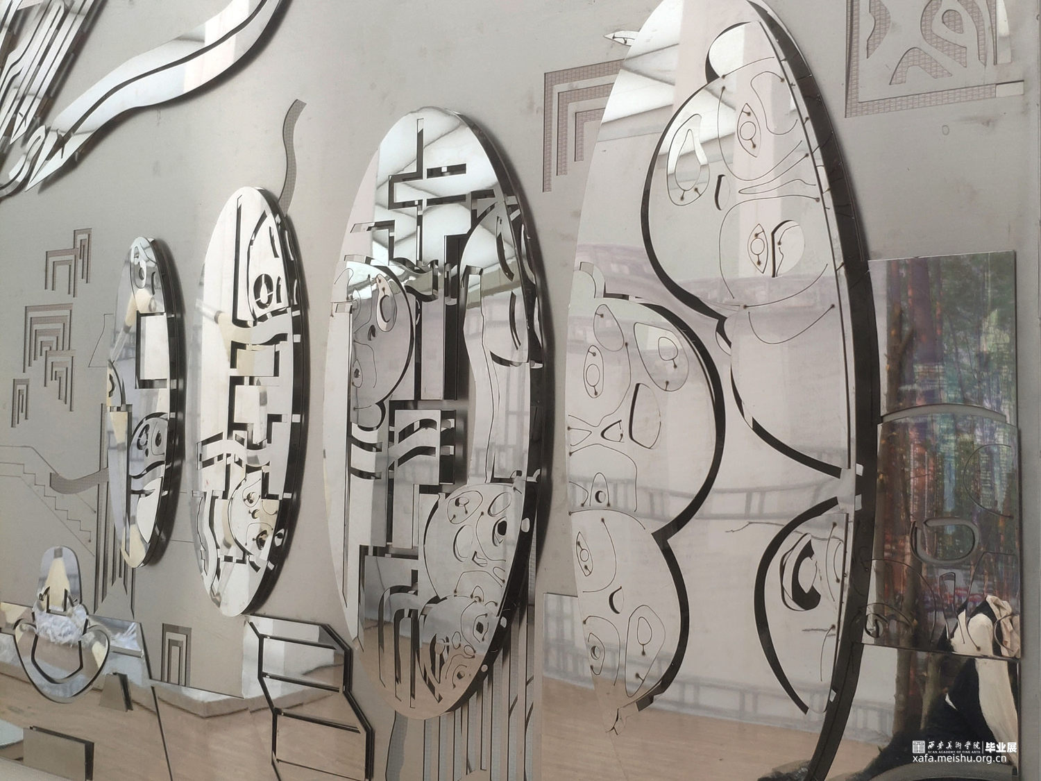 以拉丝钢和镜面不锈钢两种金属板材为主要制作材料,通过激光切割和多层次板材叠压拼接的技术来实现作品,几何元素图形的丰富组合营造出跃动的画面空间感。