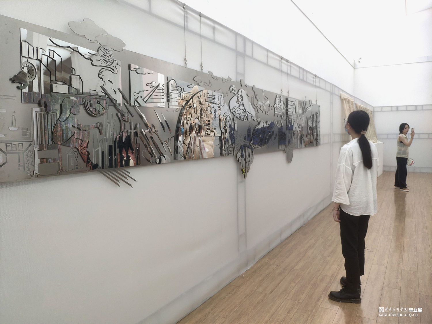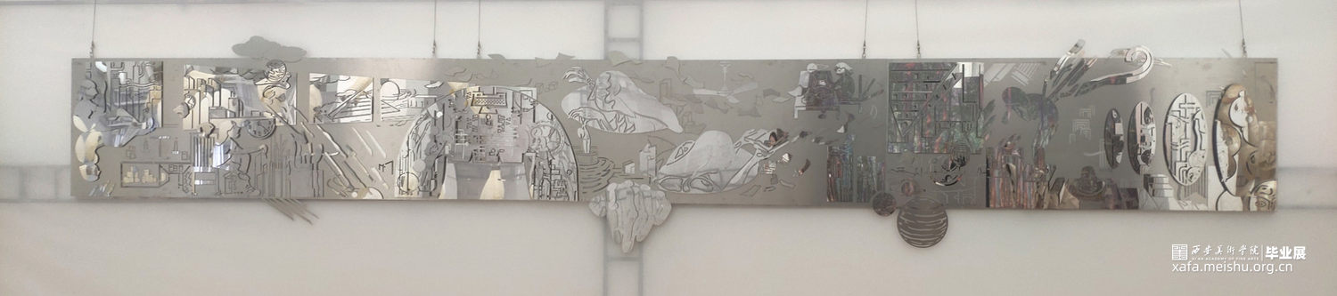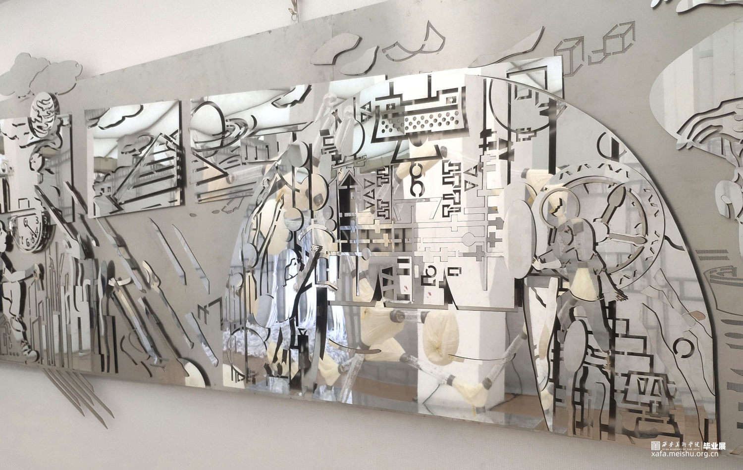 以拉丝钢和镜面不锈钢两种金属板材为主要制作材料,通过激光切割和多层次板材叠压拼接的技术来实现作品,几何元素图形的丰富组合营造出跃动的画面空间感。