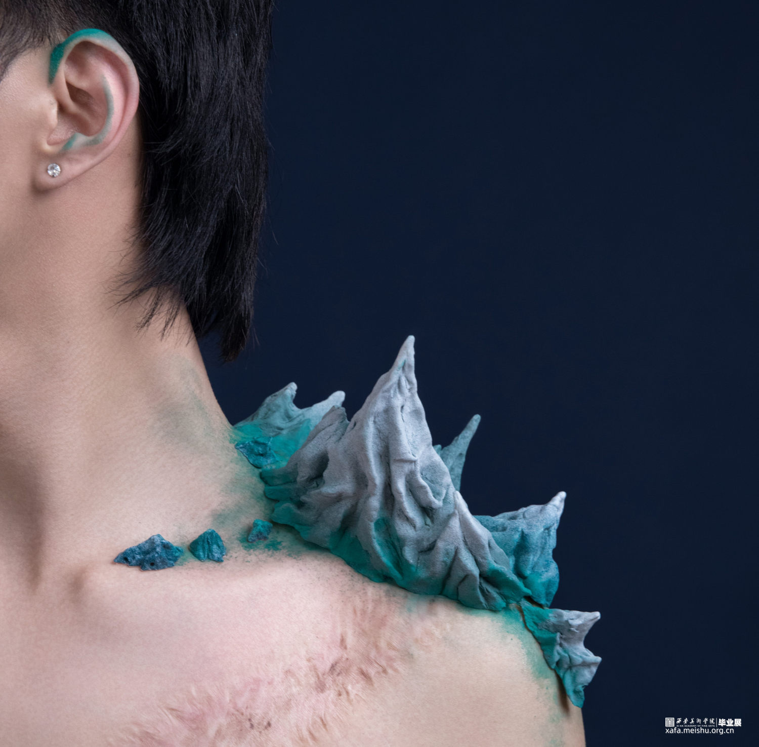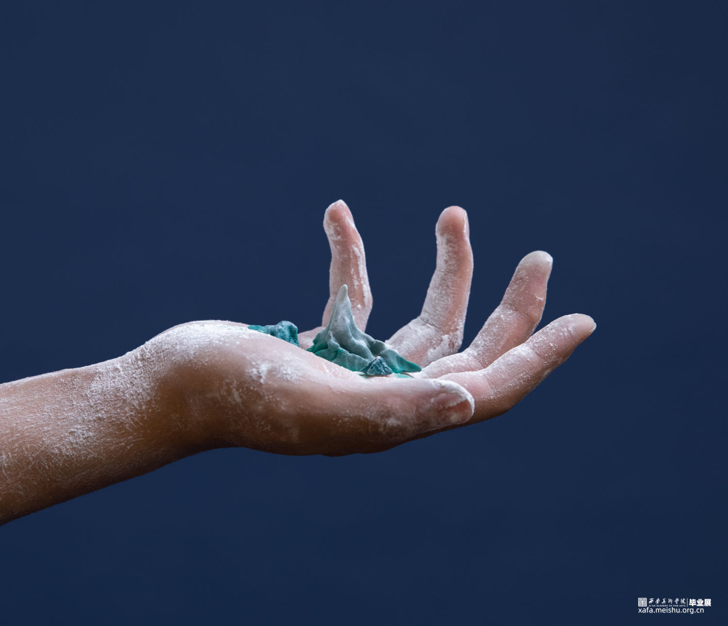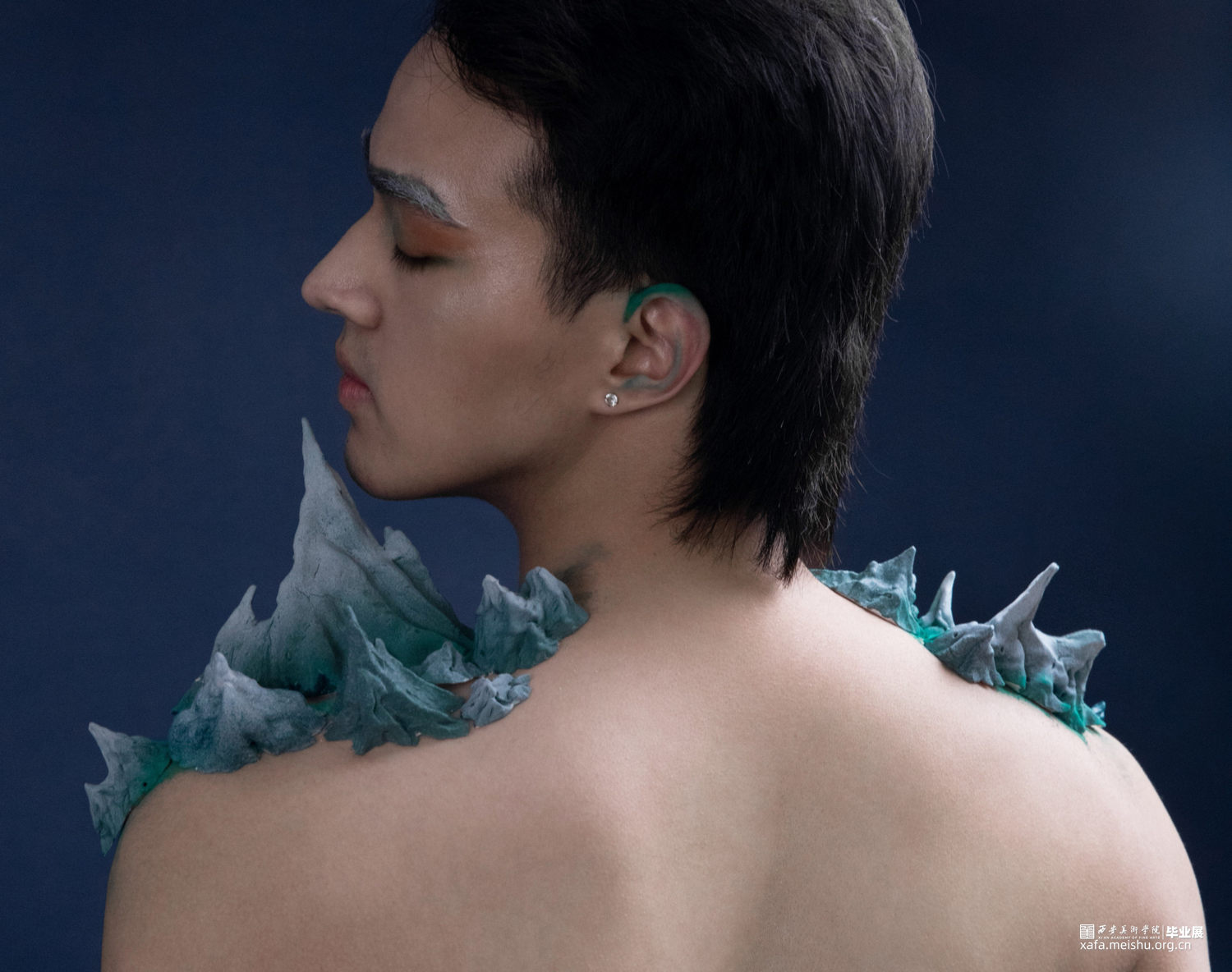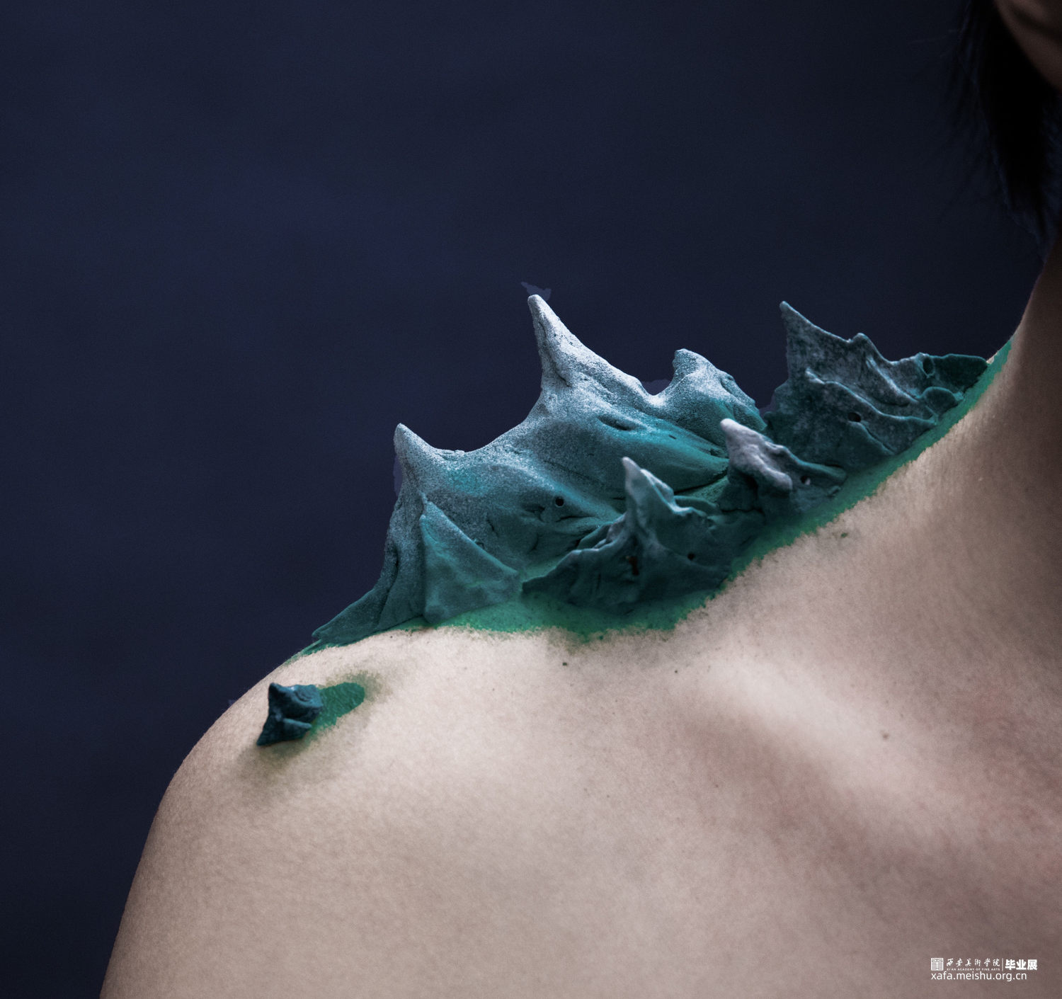 作品说明:“沧海月明珠有泪,蓝田日暖玉生烟”。作品根据《山海经》中的神话人物“鲛人”为灵感,设计了一组陶瓷概念首饰。整体以不规则起伏状线条为势,施以孔雀绿釉和亮沙白釉,结合渐变的施釉方式,为其增添神秘氛围。本组首饰可任意组合,佩戴在人体各个部位,主要以头部,肩部,背部,胸部和手部为主。