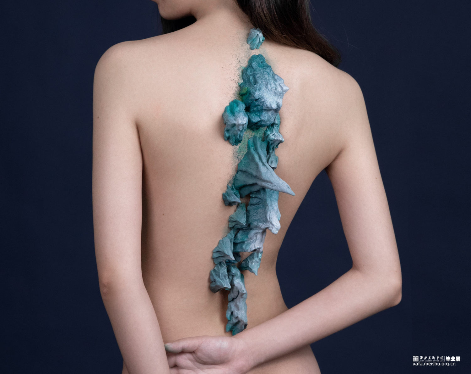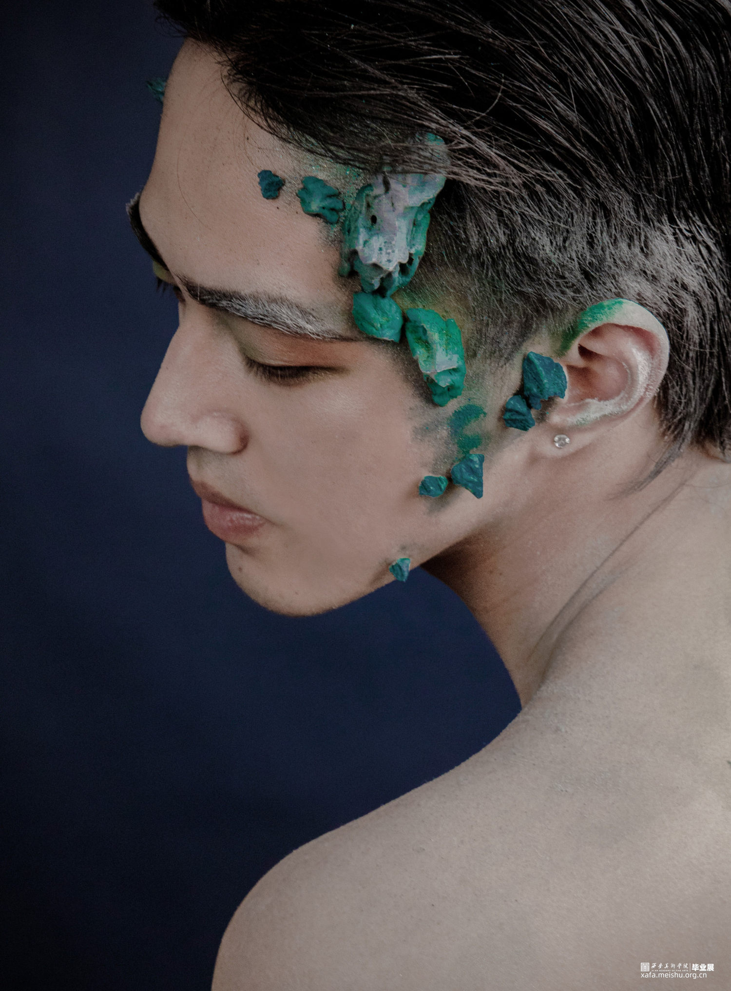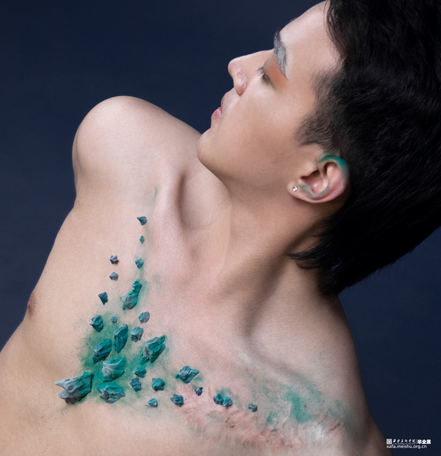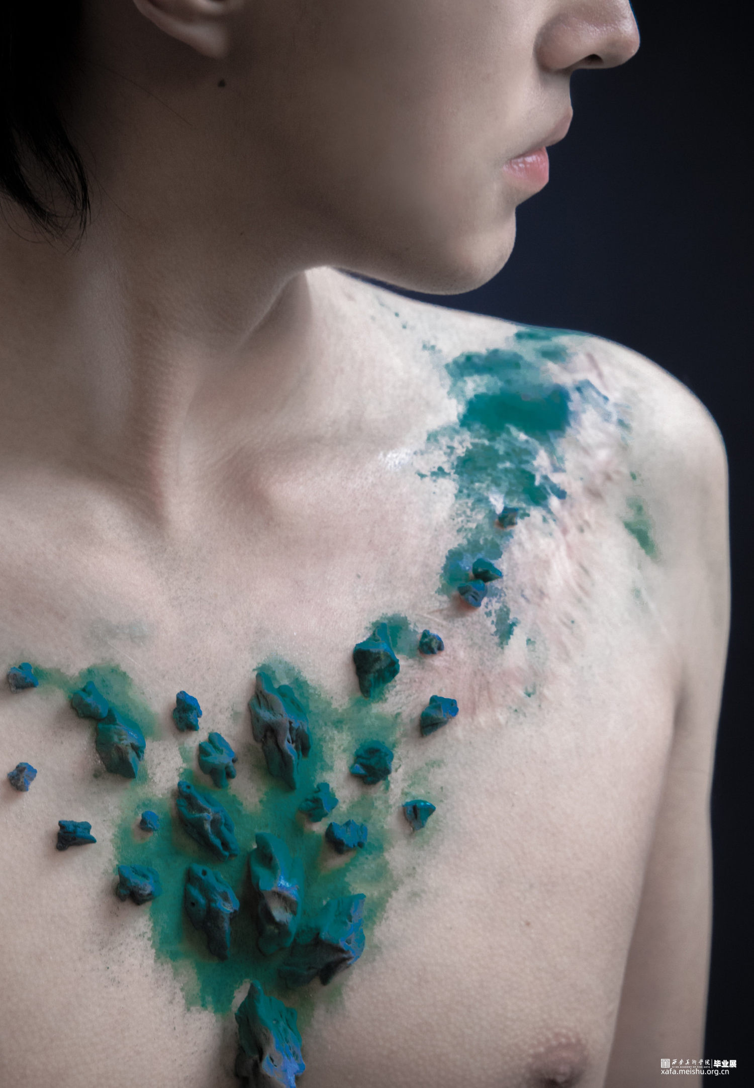作品说明:“沧海月明珠有泪,蓝田日暖玉生烟”。作品根据《山海经》中的神话人物“鲛人”为灵感,设计了一组陶瓷概念首饰。整体以不规则起伏状线条为势,施以孔雀绿釉和亮沙白釉,结合渐变的施釉方式,为其增添神秘氛围。本组首饰可任意组合,佩戴在人体各个部位,主要以头部,肩部,背部,胸部和手部为主。