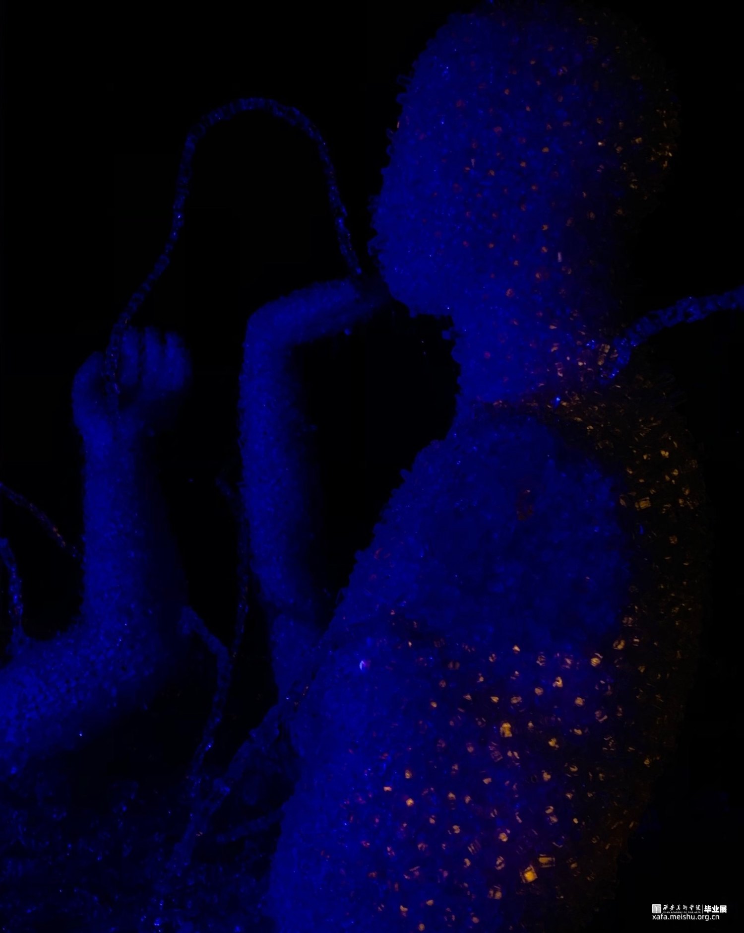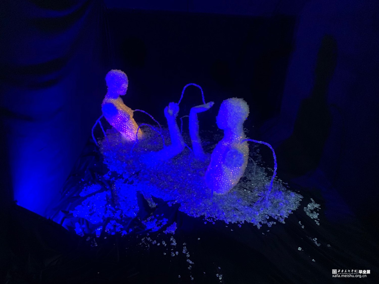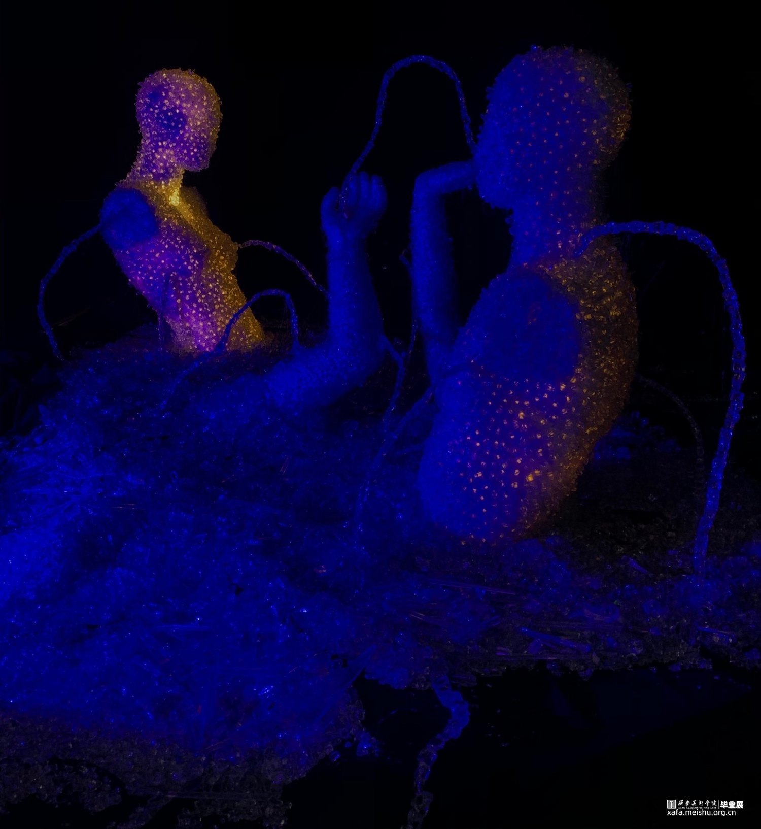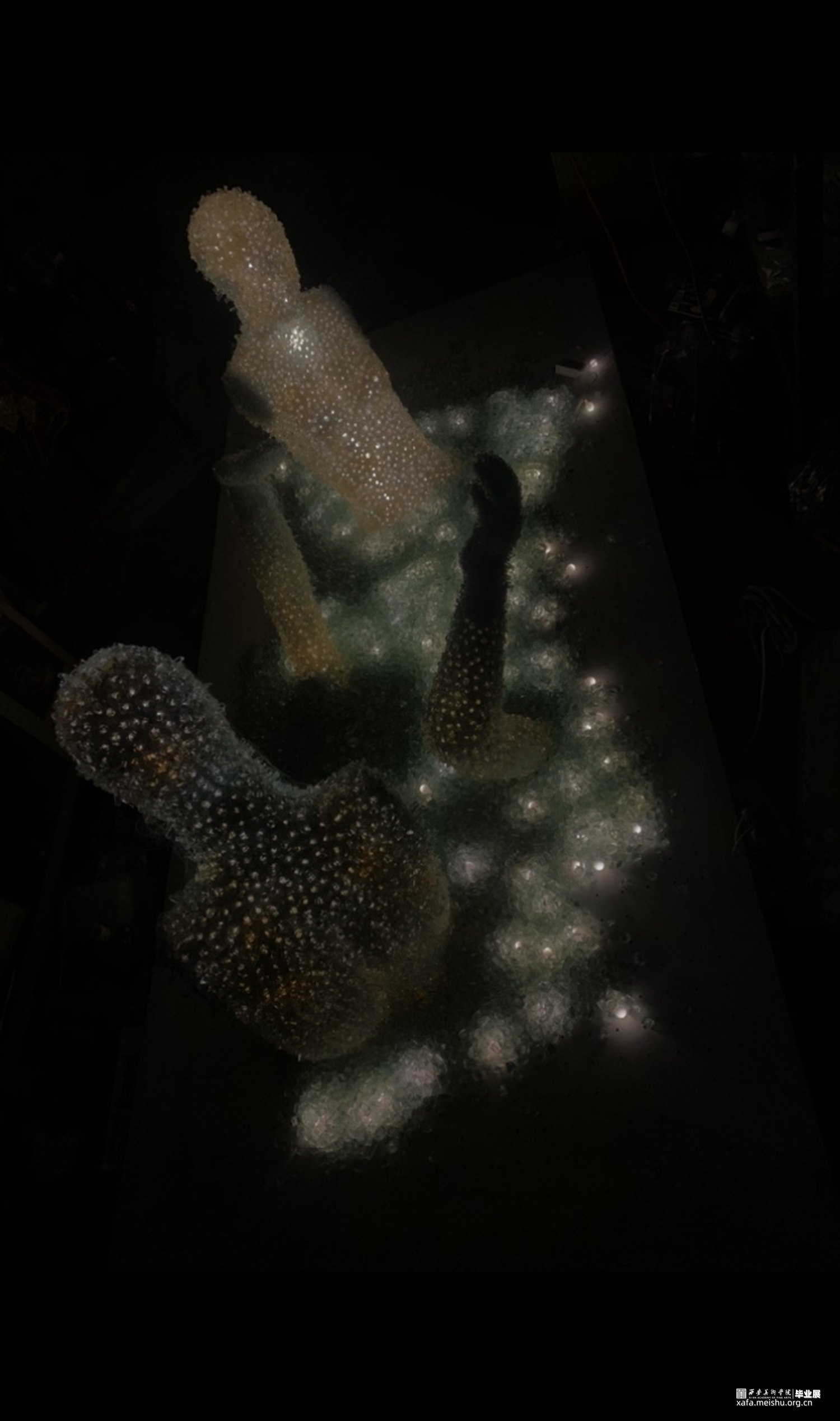 众多不完整的人体 从地面钻出,分裂排布,脱离了人在常观印象下完整人体的印象,众生以不同的姿态挣扎着从破碎玻璃中, 拆分自己 重塑自己 找到自己