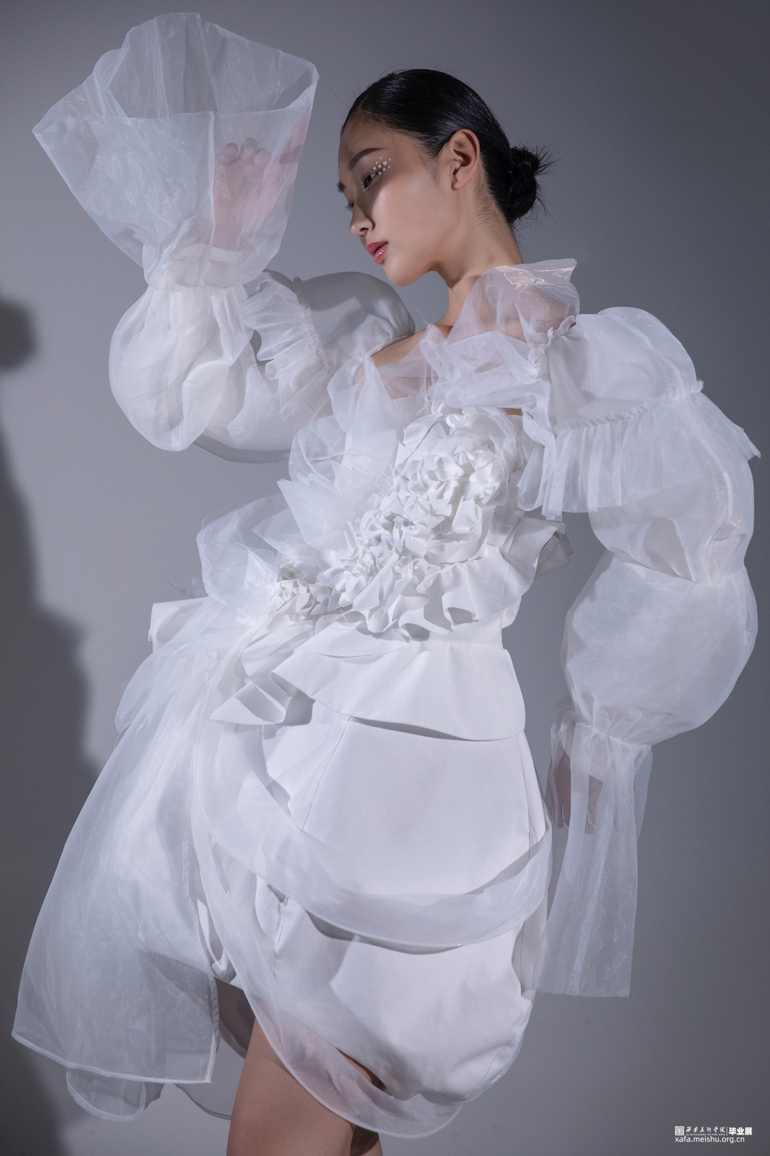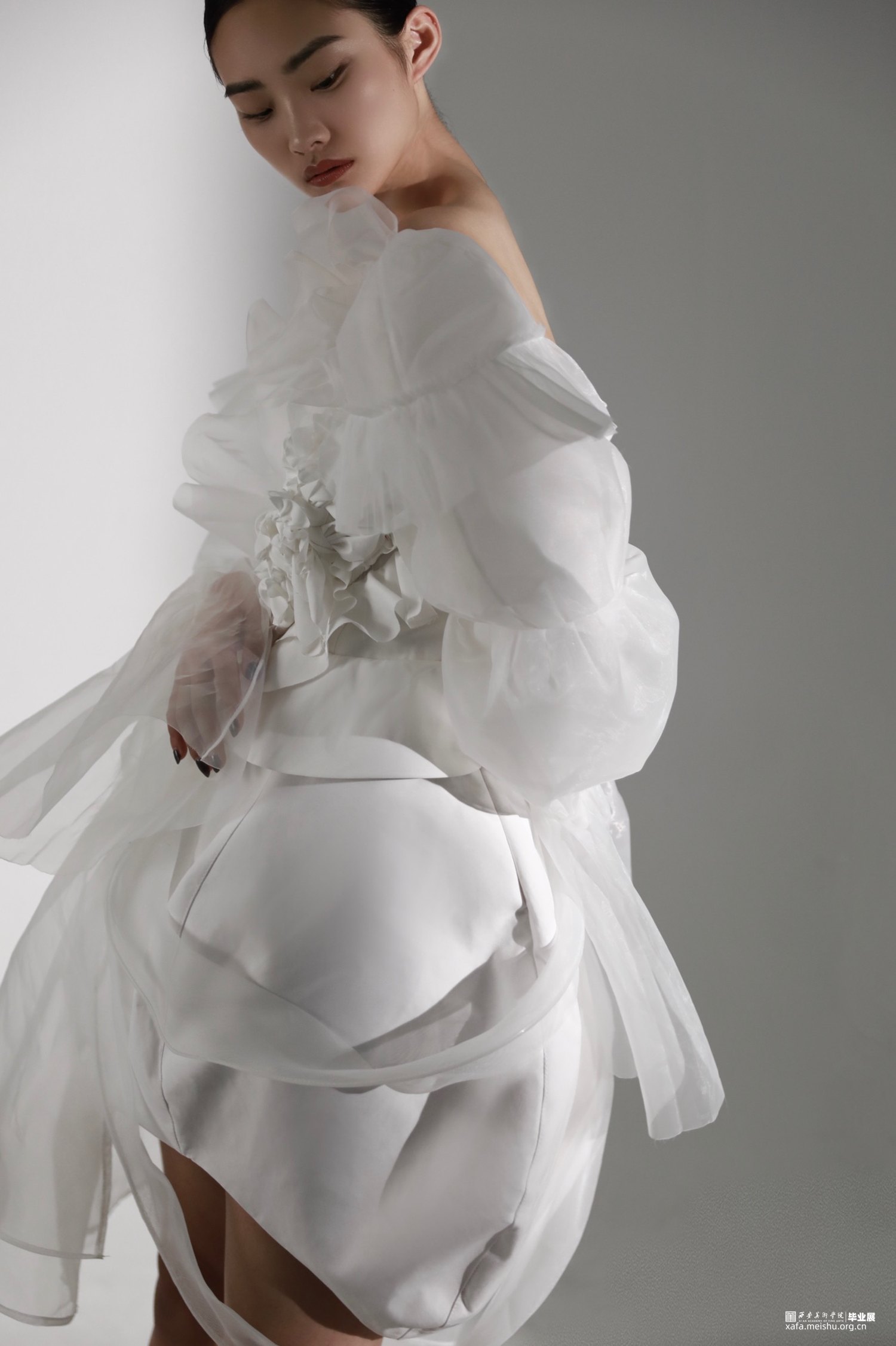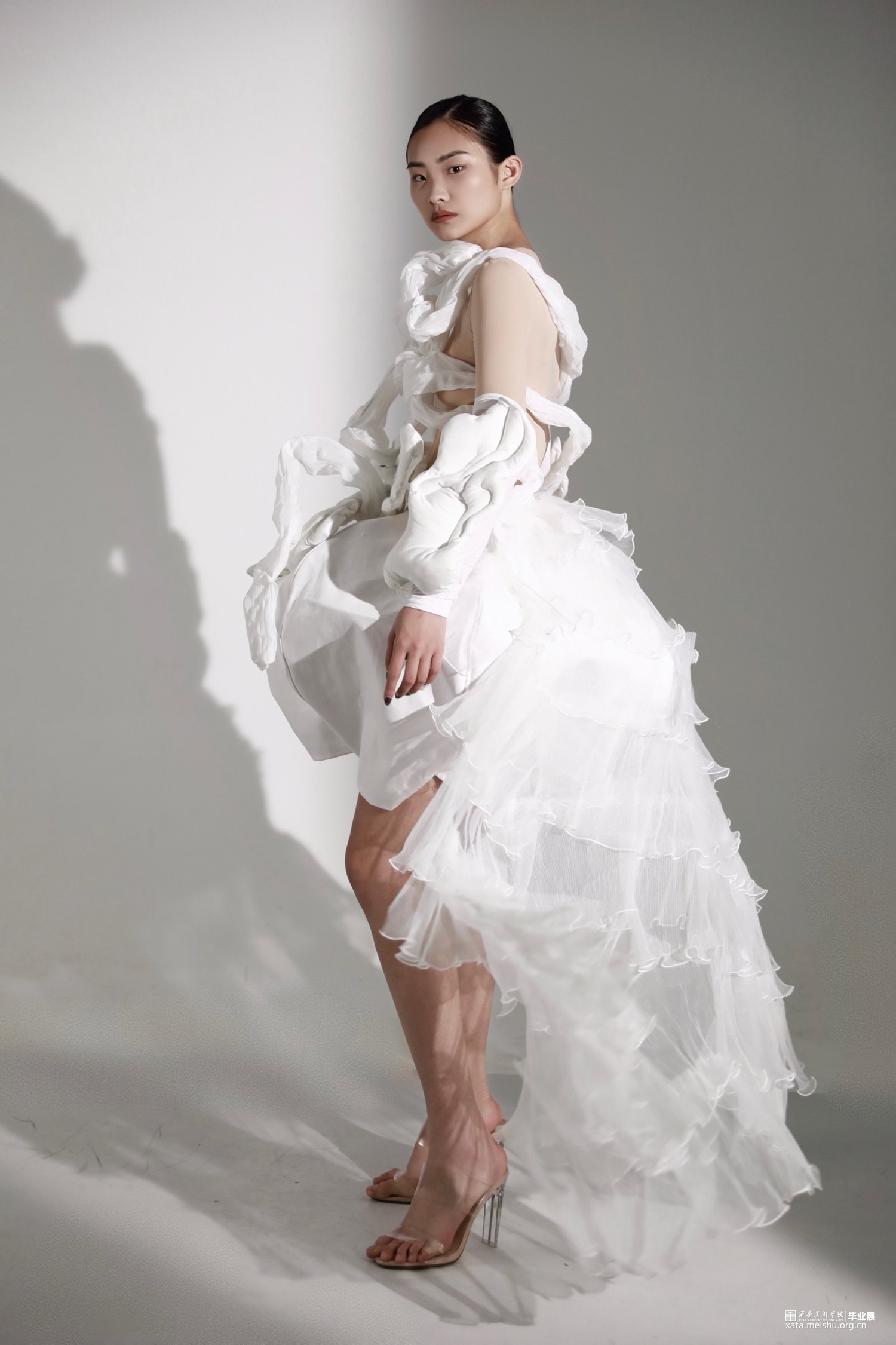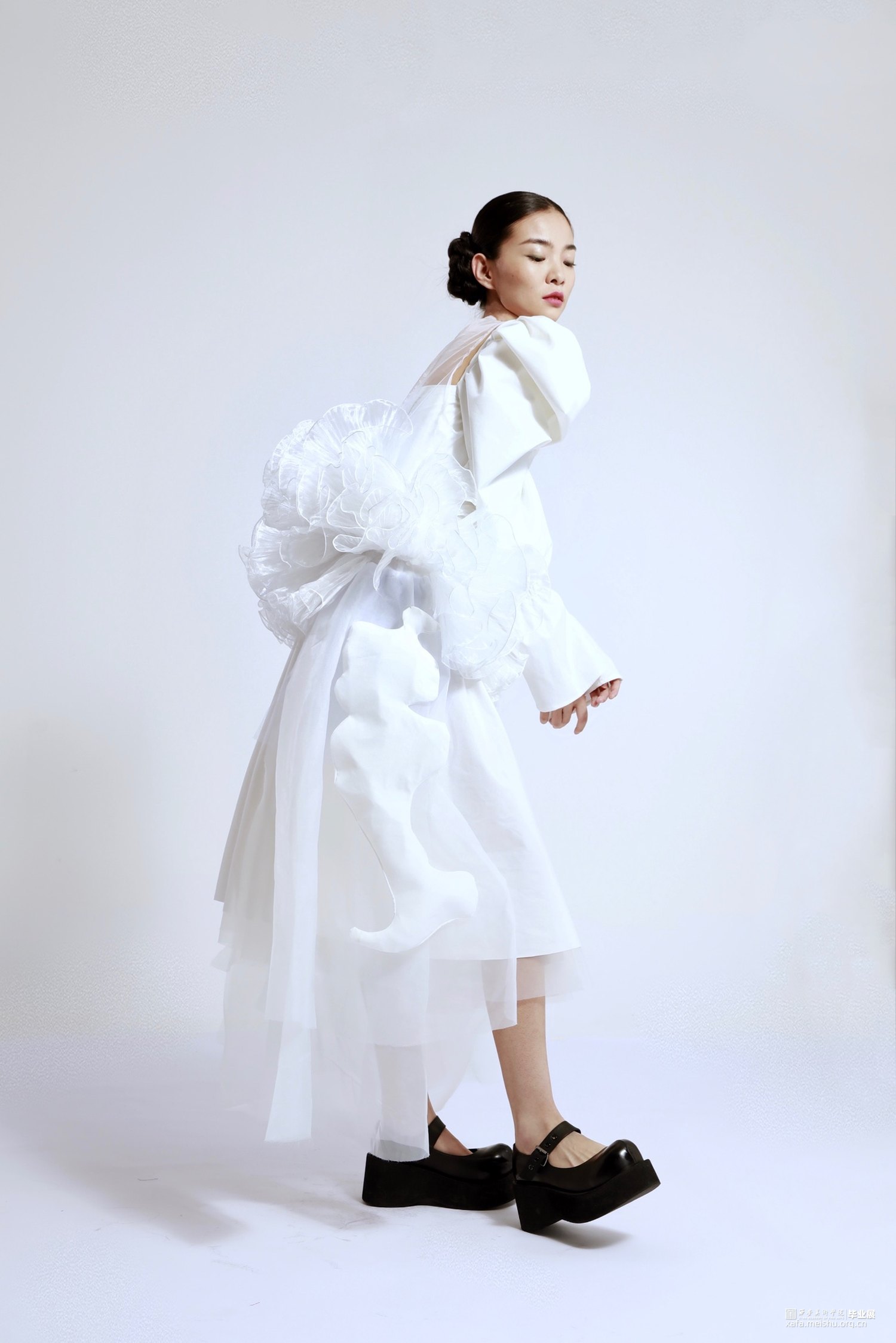 本设计作品在材质上主要选用醋酸棉、尼龙纱、欧根纱等面料,色彩方面主要使用纯白的色彩来表现主题中雅致的意境。将唐代牡丹纹样的轮廓进行提取,进行变形后再设计,使牡丹纹样在保留形态的基础上增加设计感,再将再设计后的牡丹纹样进行立体化和体量化处理,让牡丹纹样从平面状态变为立体状态,体现出传统文化意境和当代设计语言的融合。