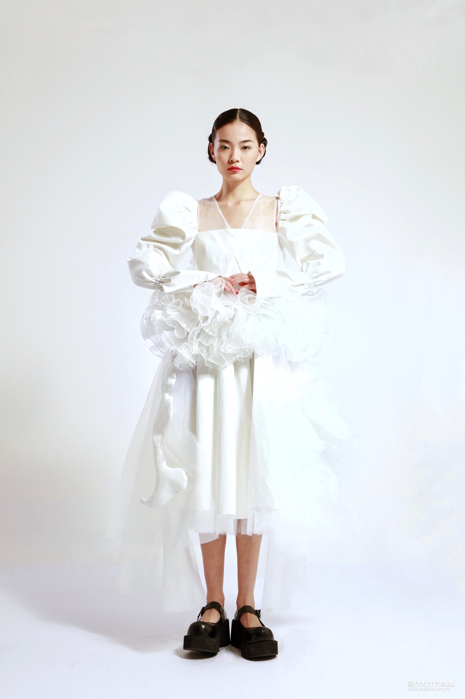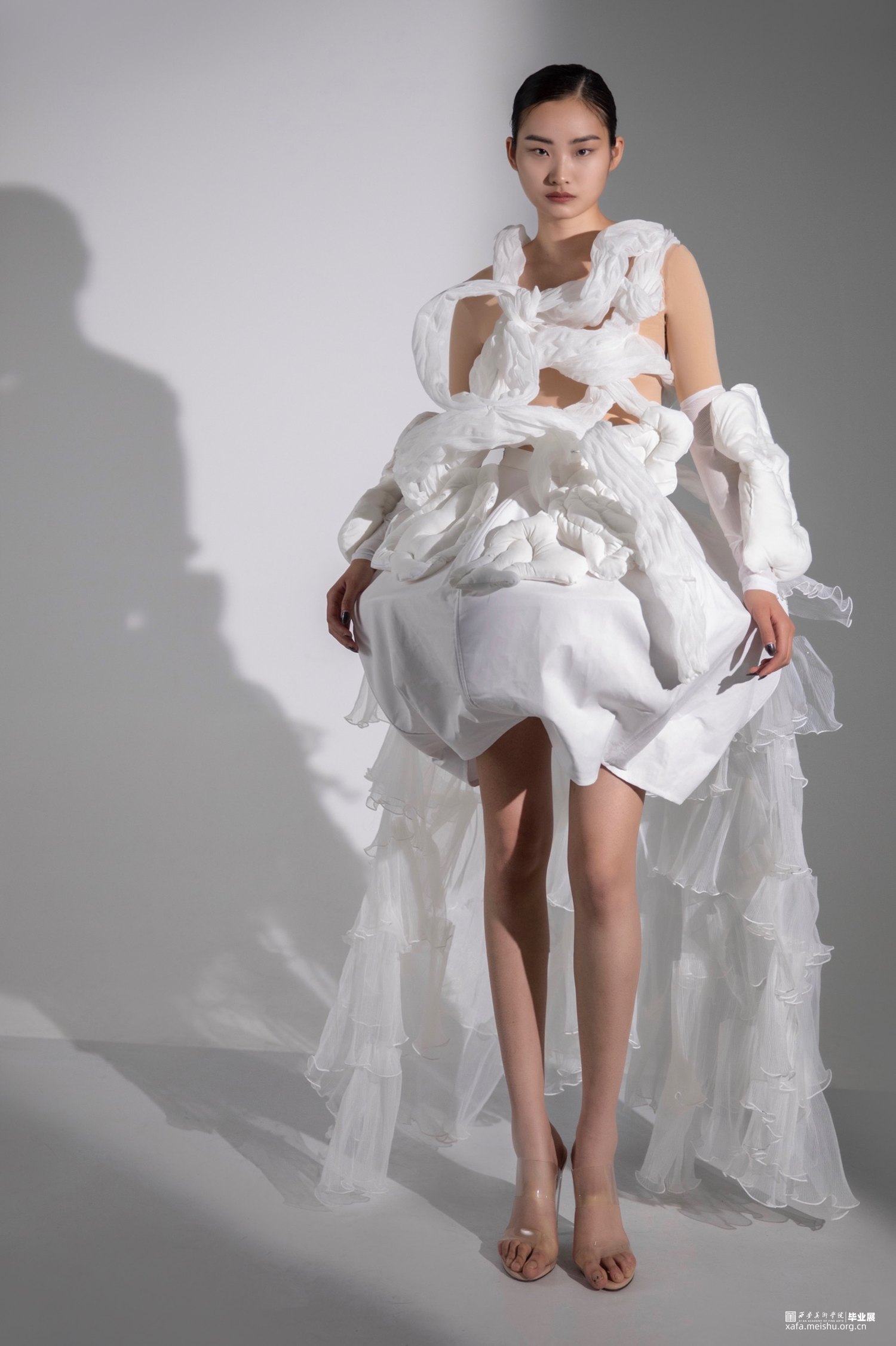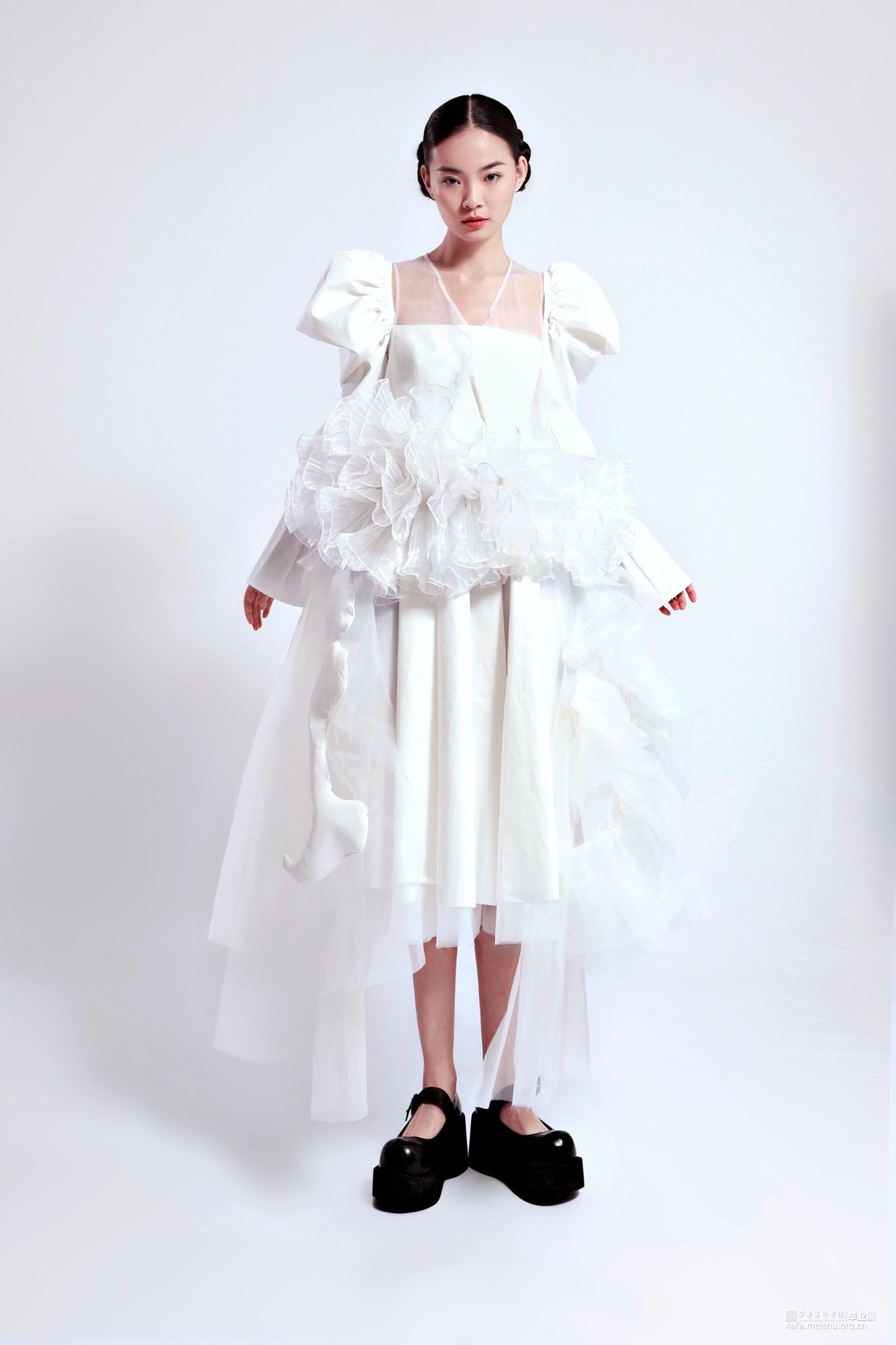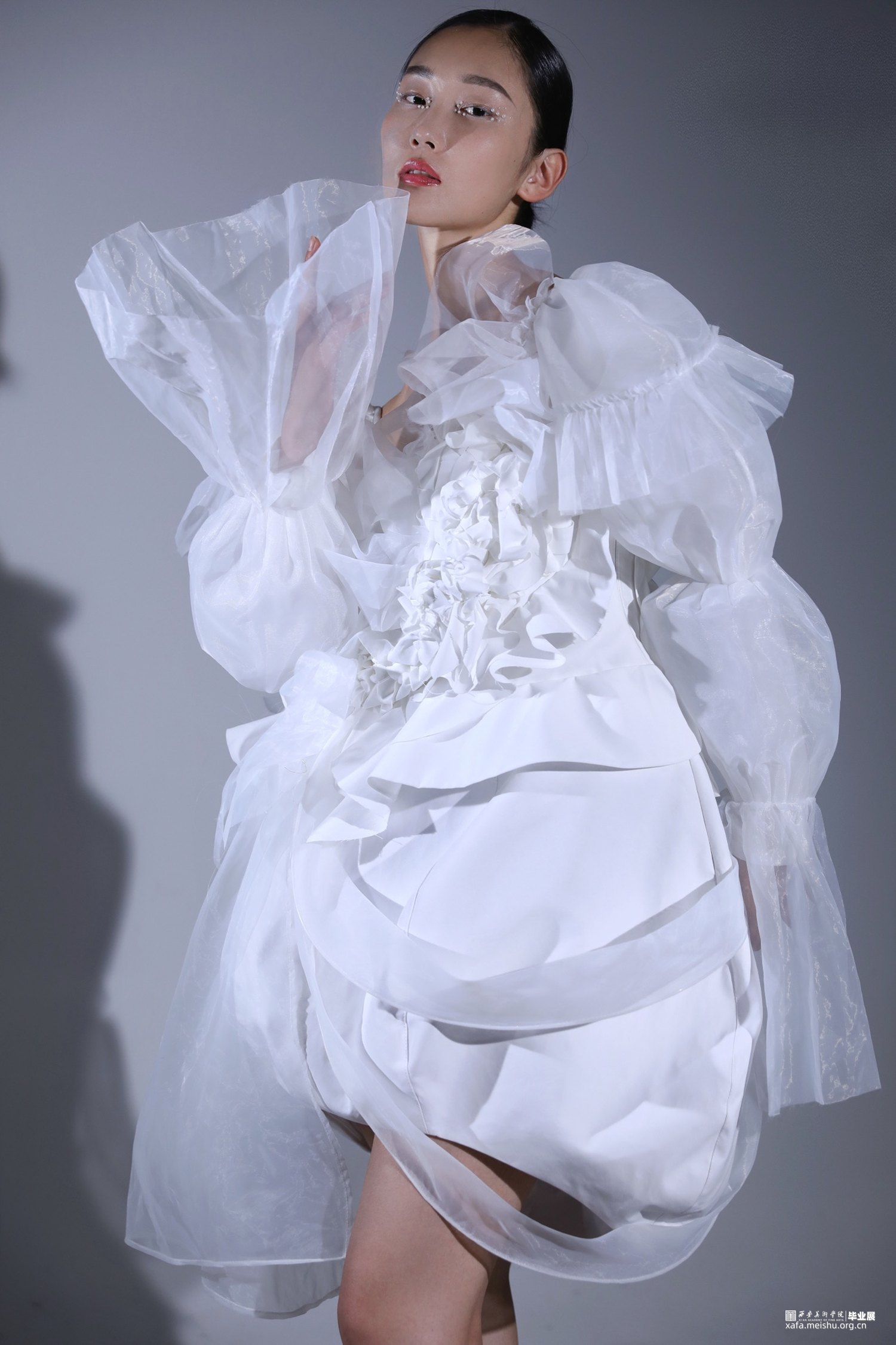本设计作品在材质上主要选用醋酸棉、尼龙纱、欧根纱等面料,色彩方面主要使用纯白的色彩来表现主题中雅致的意境。将唐代牡丹纹样的轮廓进行提取,进行变形后再设计,使牡丹纹样在保留形态的基础上增加设计感,再将再设计后的牡丹纹样进行立体化和体量化处理,让牡丹纹样从平面状态变为立体状态,体现出传统文化意境和当代设计语言的融合。