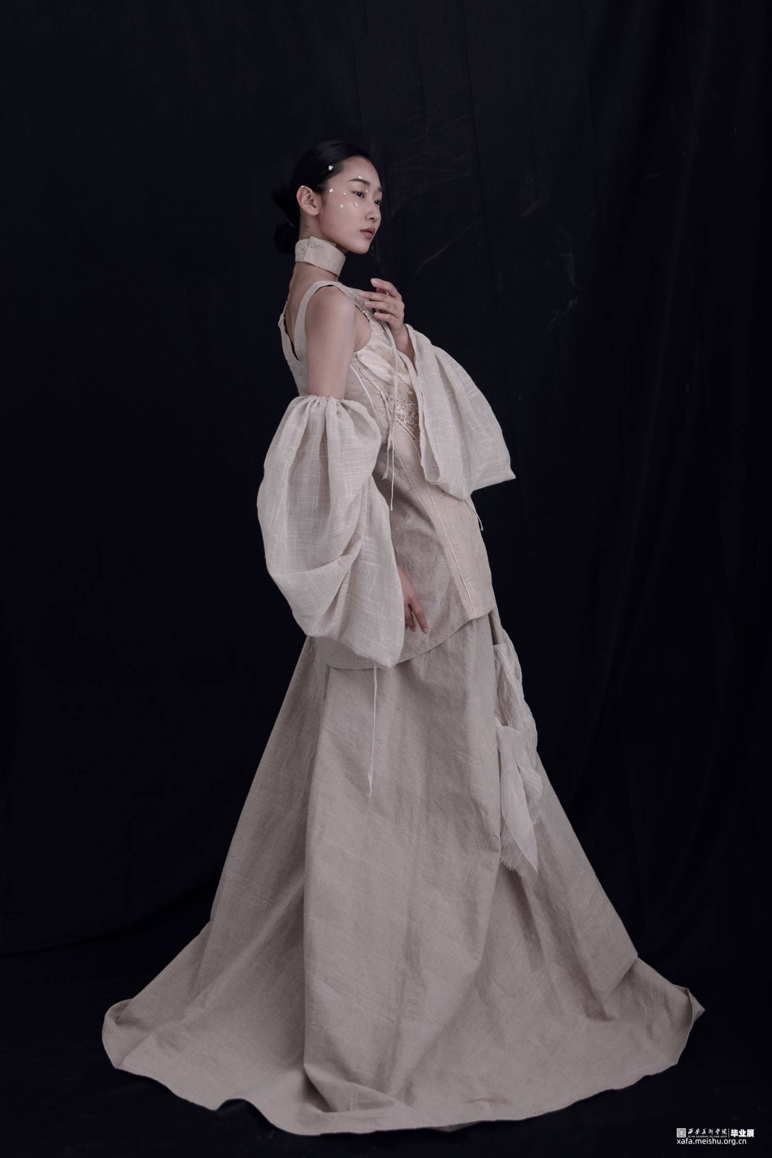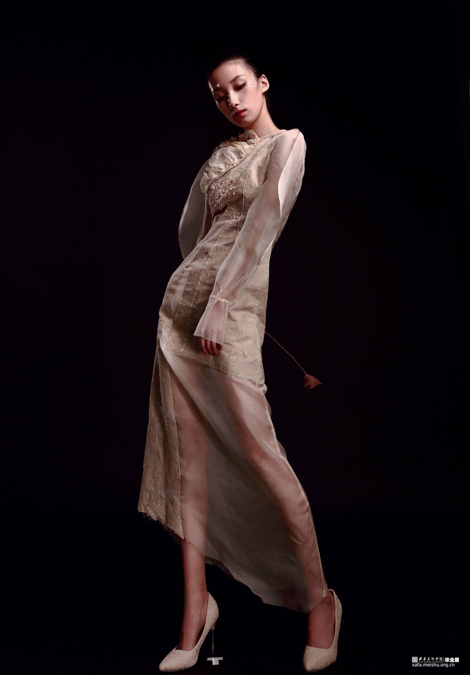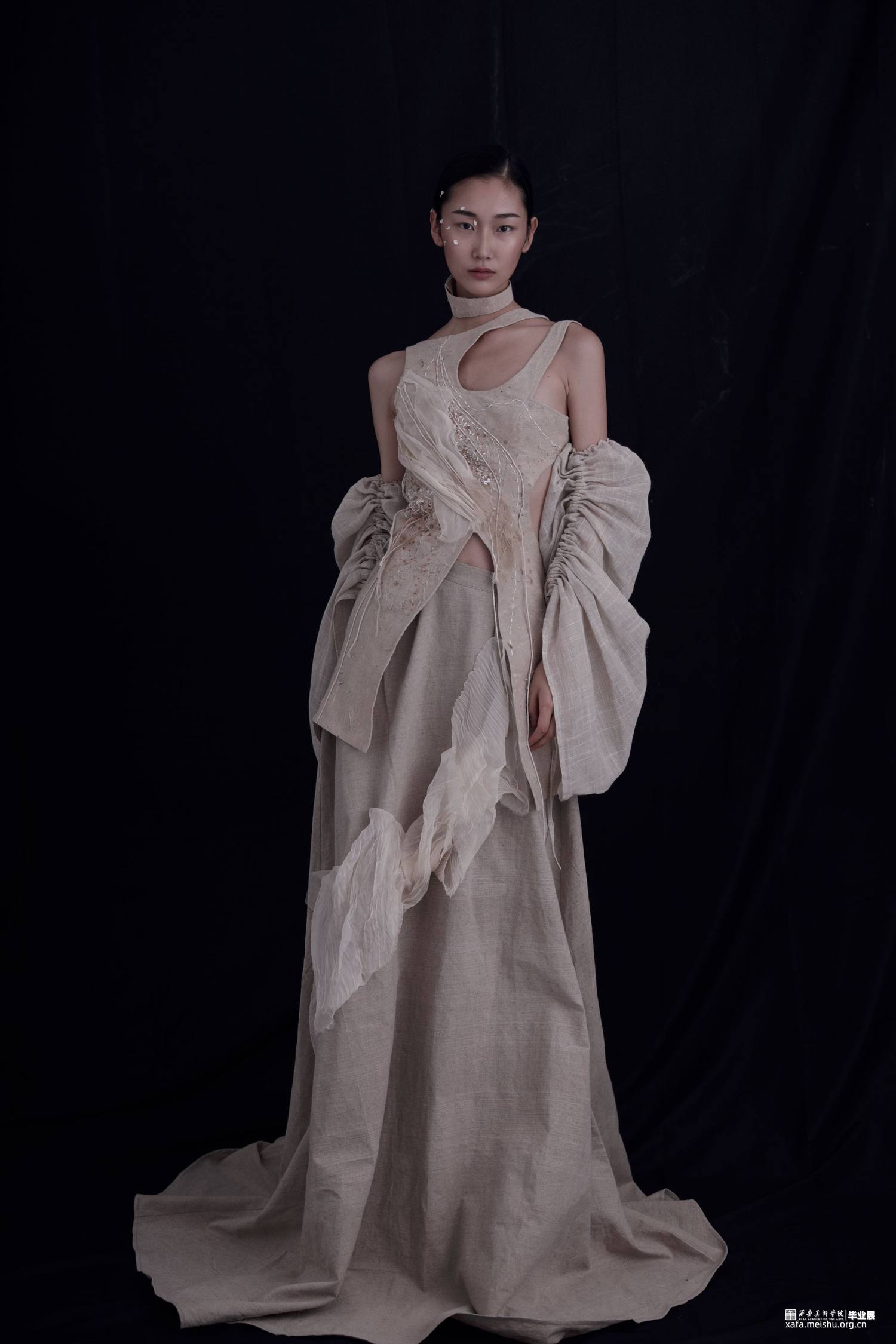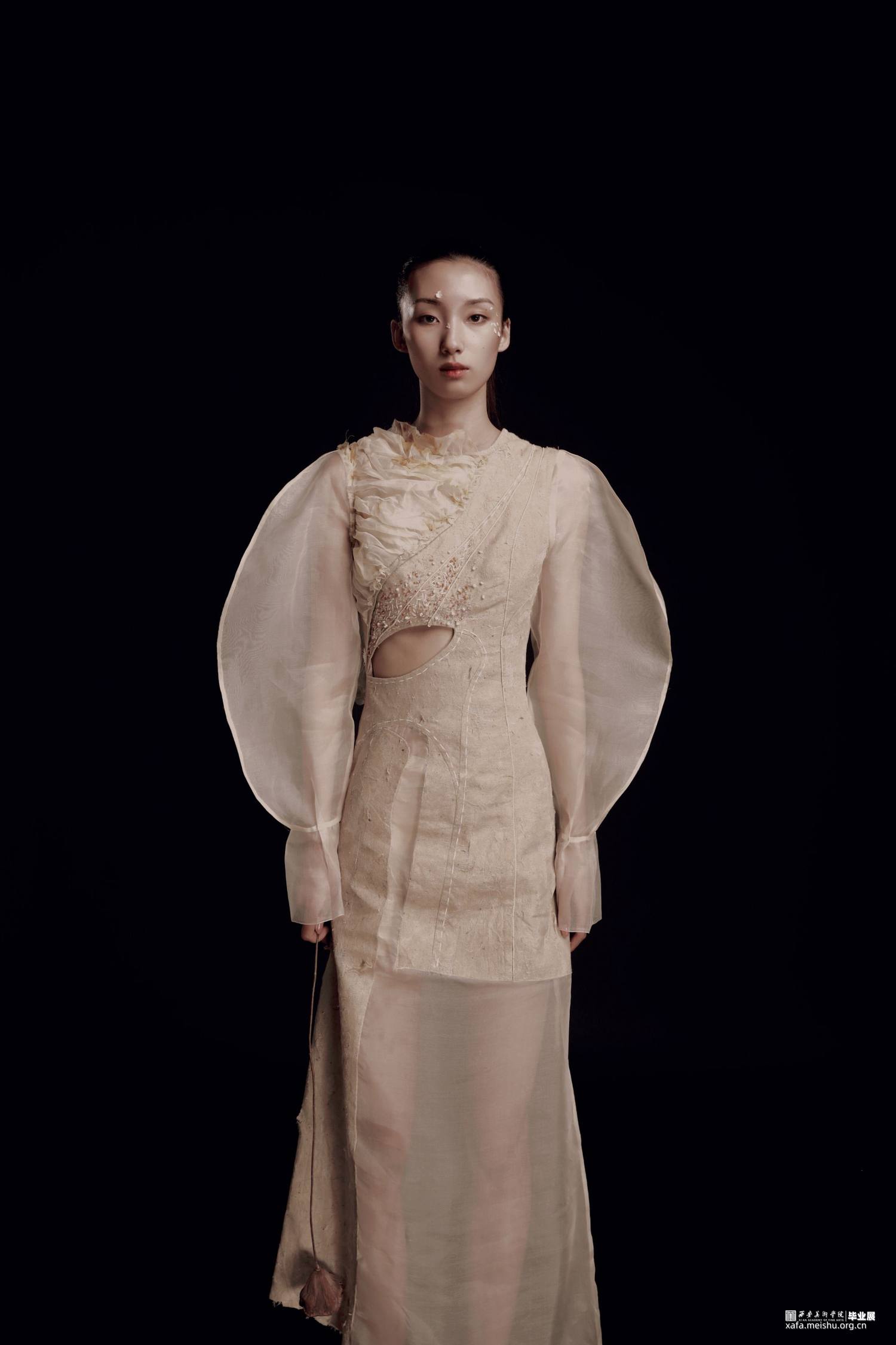 帷帽又称席帽,式样为一种高顶宽檐笠帽,或油帽,或毡笠,骨架是用较韧的藤条或席片制作而成,因帽檐周围垂至“帷”状的丝网而得名。此次作品整体以唐代帷帽为灵感来源,将帷帽之纱转换以当代的纱网,以及对帷帽具有特色的形制、变化的装饰性等进行重组与创新体现于服装整体中,使得作品不再是简单的对帷帽加以使用,而是将帷帽融进服装设计创作的整体中,既能体现唐代帷帽遮蔽与暴露交掩审美态度,同时也蕴含帷帽“拖裙到颈,渐为浅露”的制形样式。唐代遗存的历史痕迹里看尽世事变迁,斑驳、朴素的面目呈现。面料则以痕迹为灵感,包括身体的妊娠纹、生长纹、疤痕以及历史遗留的痕迹等,透过表象挖掘其深层的韵律,体现在斑驳的面料与破旧的风格,使得作品宛如在诉说着历史留下的斑驳印记。