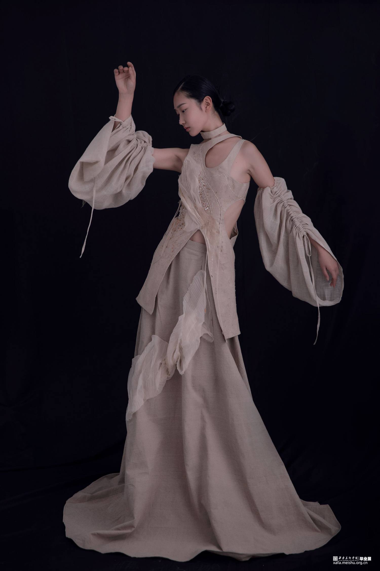 唐代遗存的历史痕迹里看尽世事变迁,斑驳、朴素的面目呈现。面料则以痕迹为灵感,包括身体的妊娠纹、生长纹、疤痕以及历史遗留的痕迹等,透过表象挖掘其深层的韵律,体现在斑驳的面料与破旧的风格,使得作品宛如在诉说着历史留下的斑驳印记。