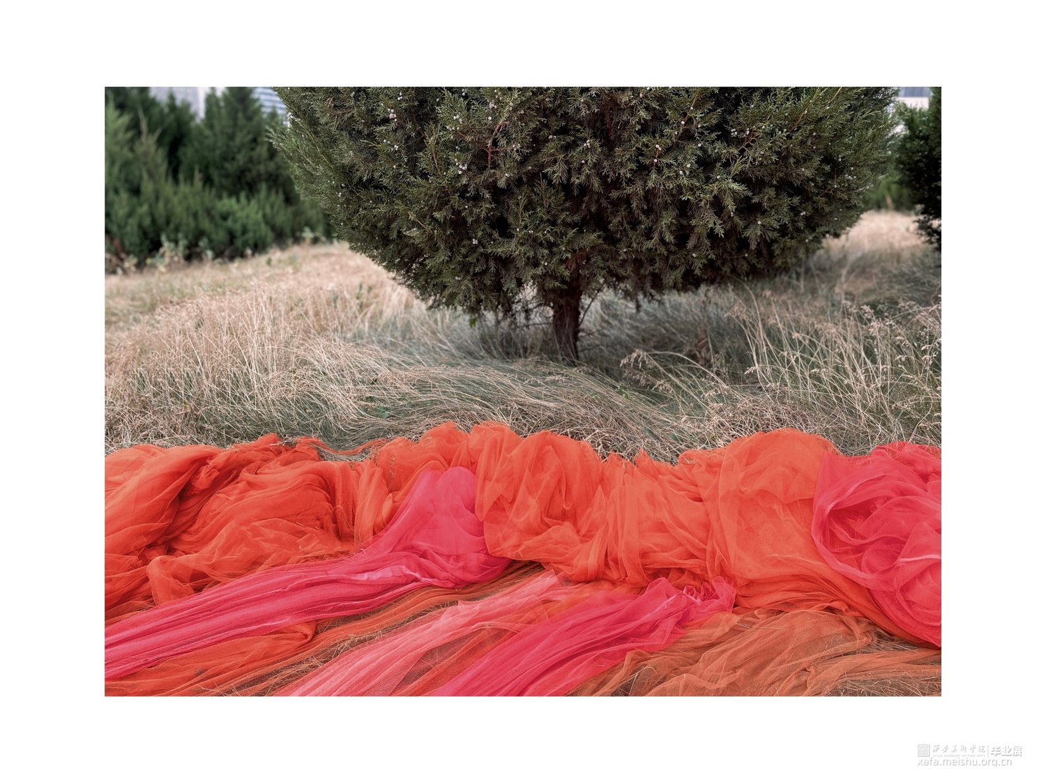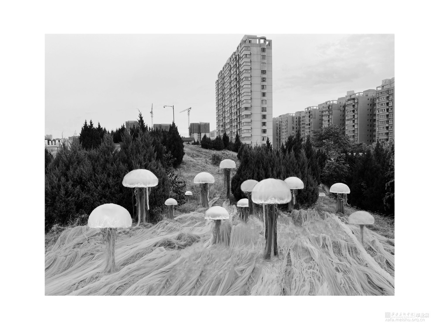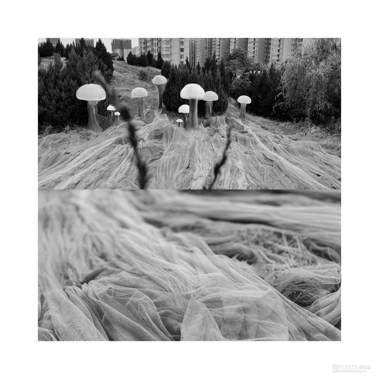 生物在人为建造的社会景观里面游走,不符合常规的景观已经逐渐开始代替并超越了真实,具有“超真实”性,而我们每个人也将成为构筑者。织物被称作为“第二层皮肤”,将此材料作为作品的主要材料,模拟生物的生存状态;在展览方式上,反差色并置形成鲜明的对比,与自然结合使作品逐渐产生细微的生态变化。