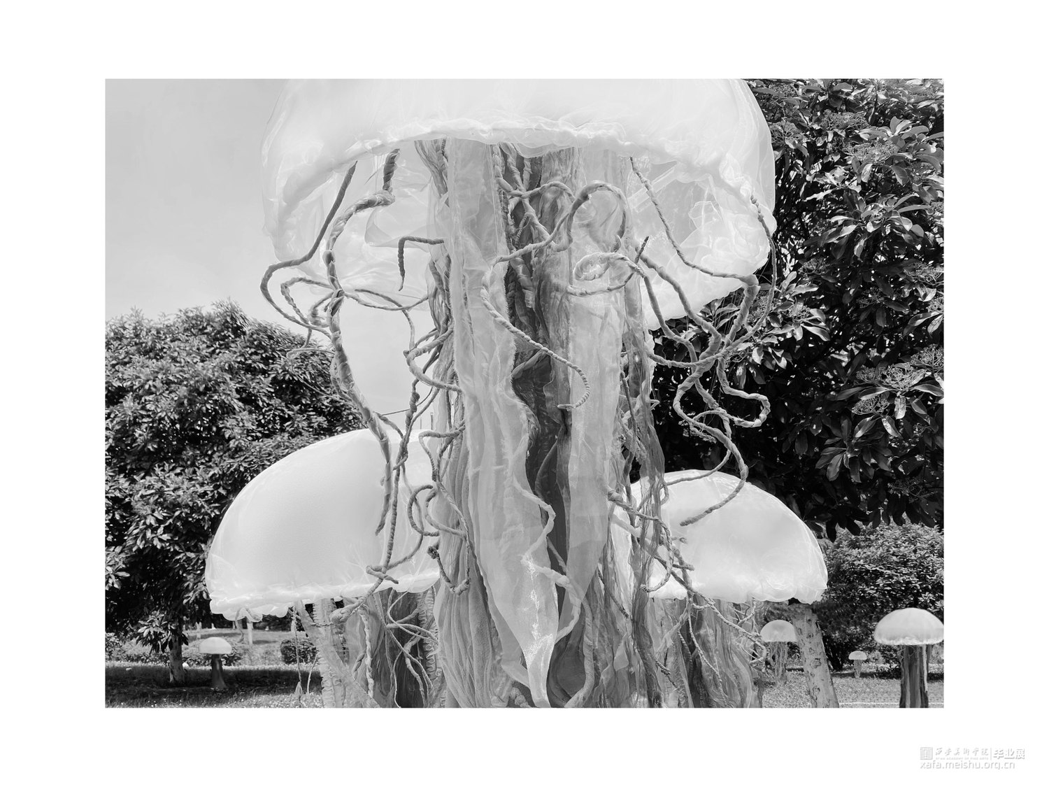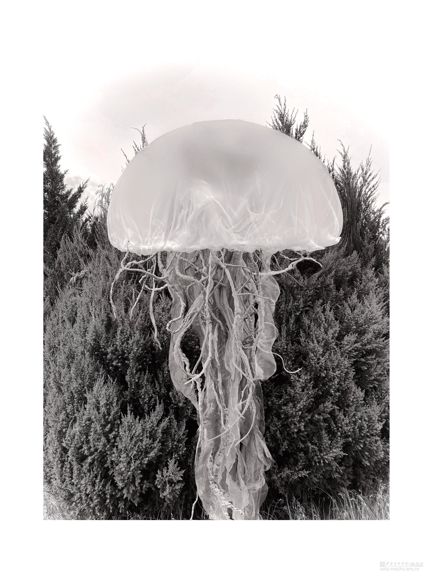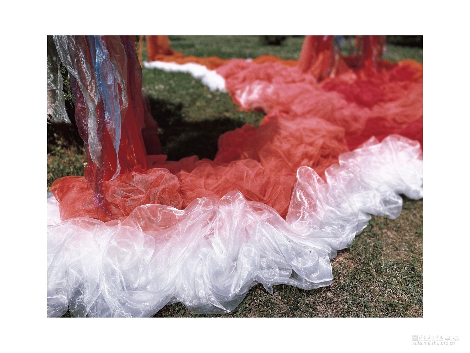 生物在人为建造的社会景观里面游走,不符合常规的景观已经逐渐开始代替并超越了真实,具有“超真实”性,而我们每个人也将成为构筑者。织物被称作为“第二层皮肤”,将此材料作为作品的主要材料,模拟生物的生存状态;在展览方式上,反差色并置形成鲜明的对比,与自然结合使作品逐渐产生细微的生态变化。
